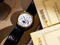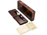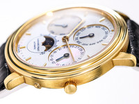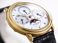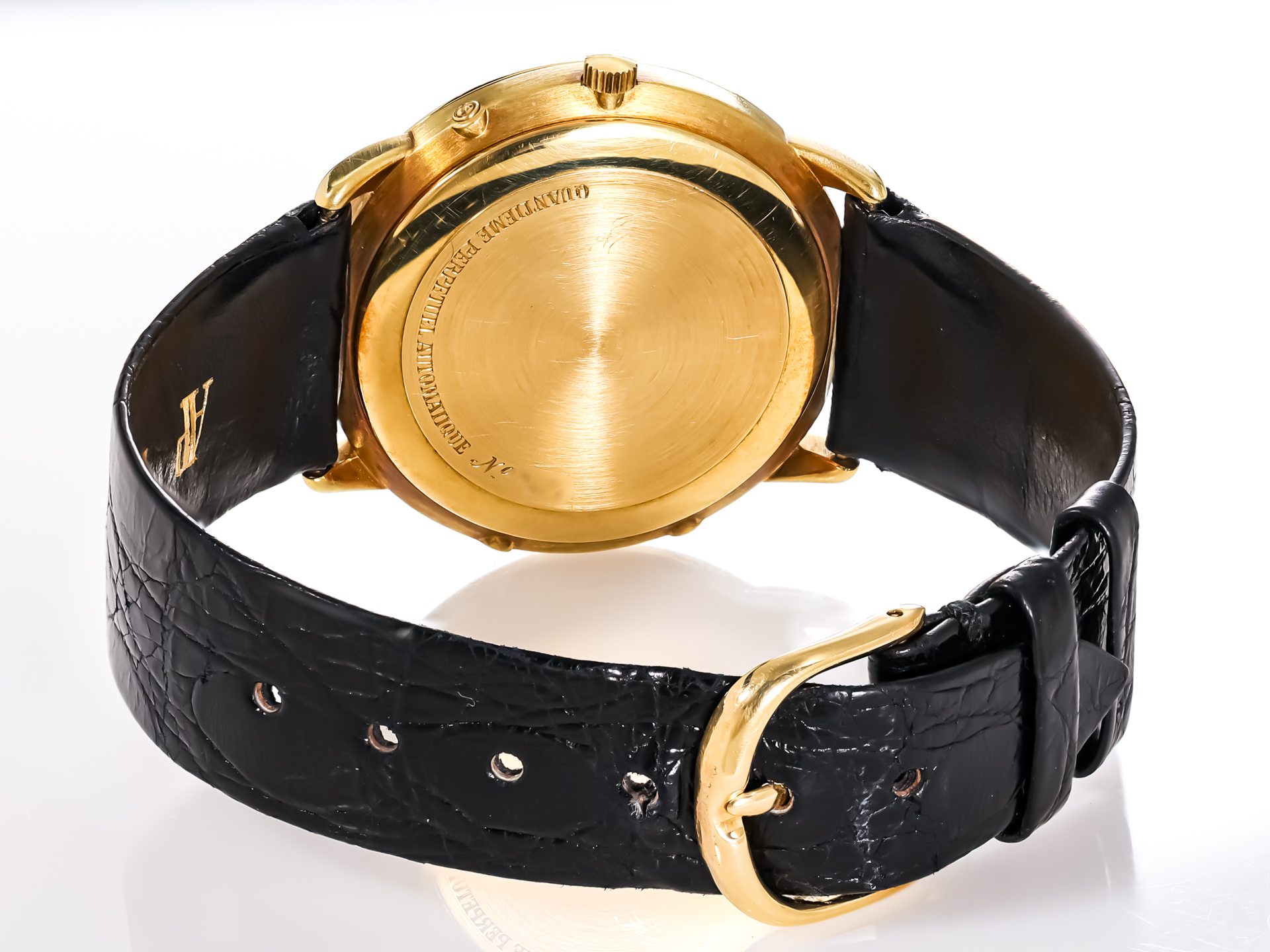 The 18k yellow gold case, with its slim profile and polished bezel, remains in excellent condition and retains the quiet elegance that characterizes AP’s pre-Royal Oak complication pieces. The watch wears with remarkable lightness, underscoring the technical sophistication of its ultra-thin automatic movement.