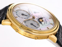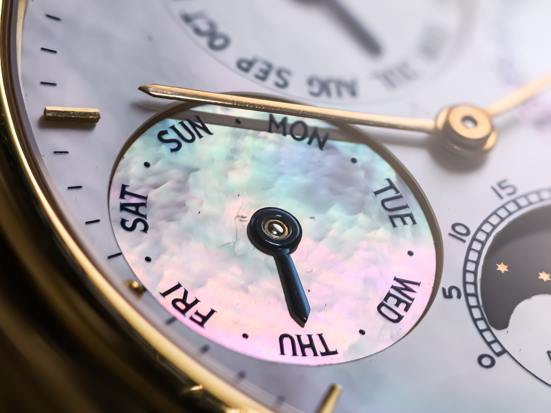 The Mother-of-Pearl dial is spectacular, displaying natural iridescent hues that shift between cream, gold, rose, and soft blue depending on the light. The layout is beautifully balanced: day at 9 o’clock, date at 3, month and leap year at 12, and a richly detailed moonphase display at 6. Slim gold feuille hands and applied indices float effortlessly above the luminous dial surface, creating an impression of refined celestial harmony.