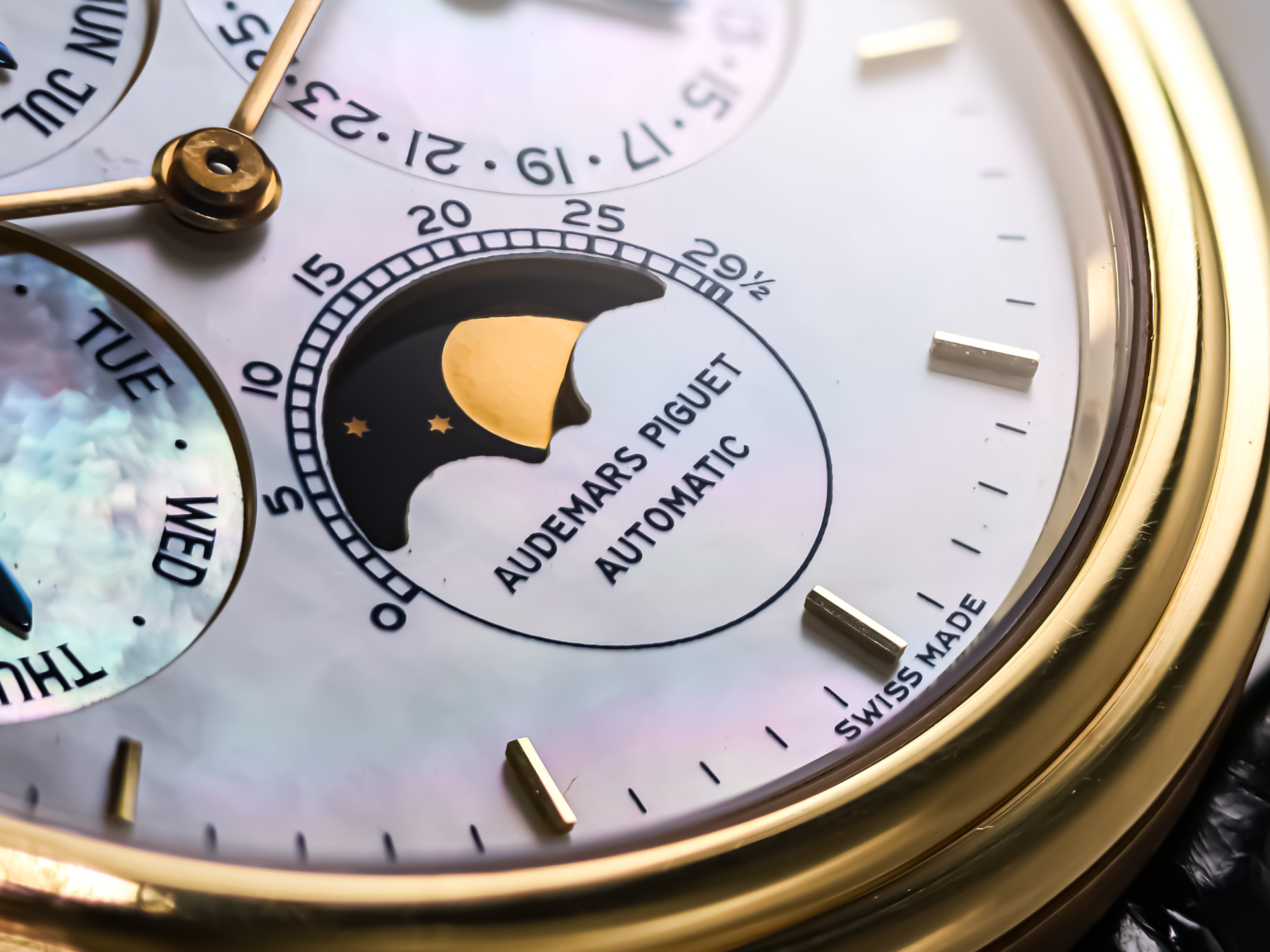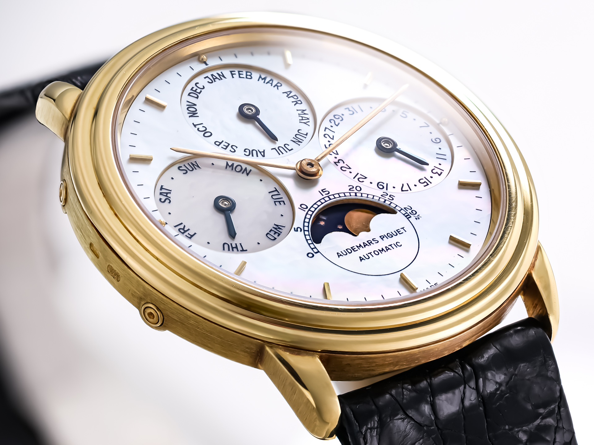 Early Audemars Piguet perpetual calendars with Mother-of-Pearl dials have become increasingly sought after, combining mechanical poetry, neo-vintage charm, and true rarity — and well-preserved full sets from the late 1980s are exceptionally hard to find today.