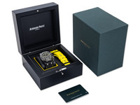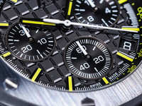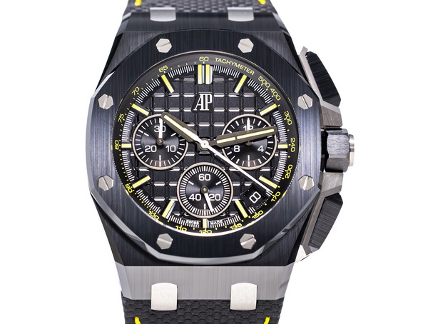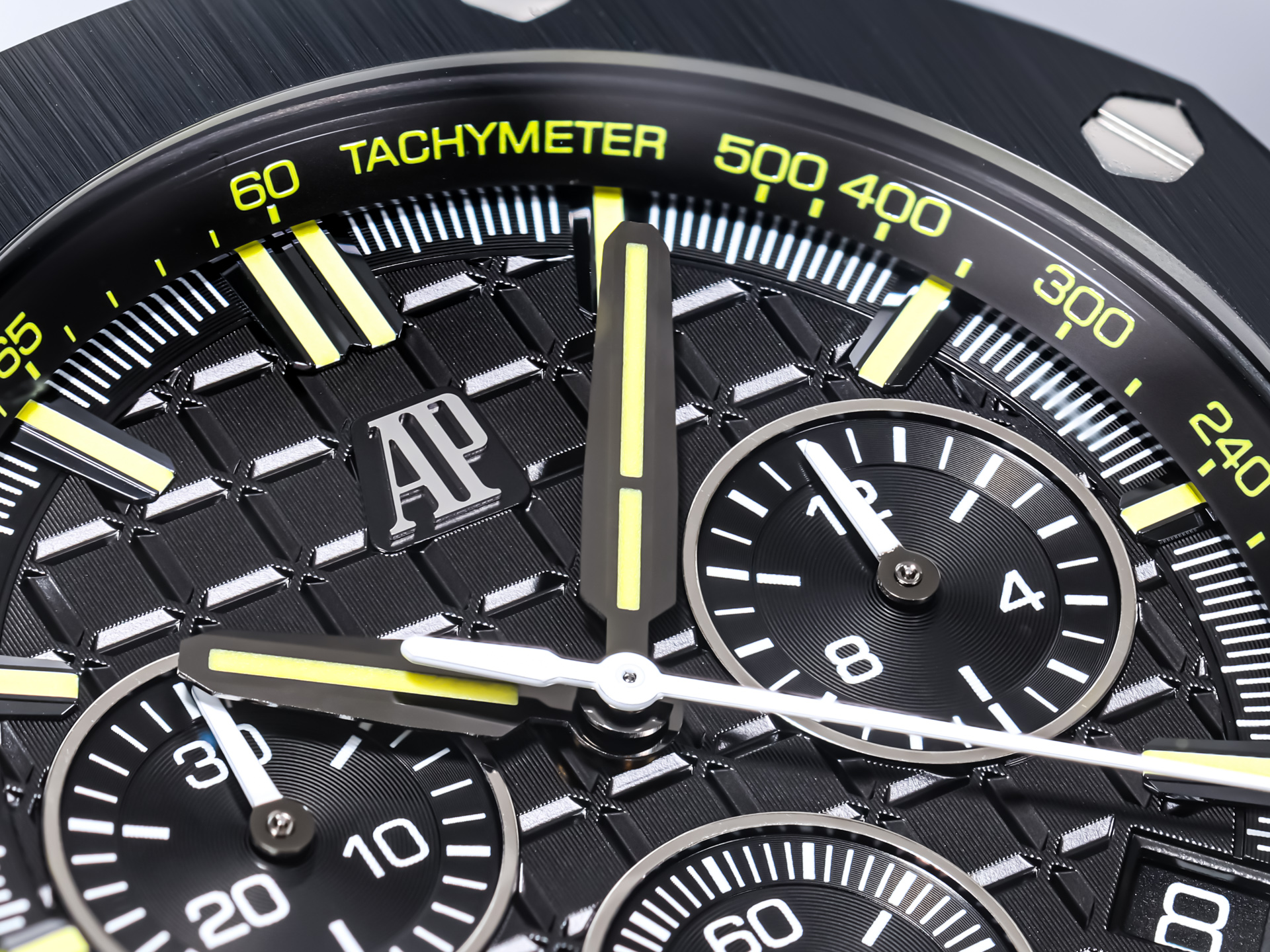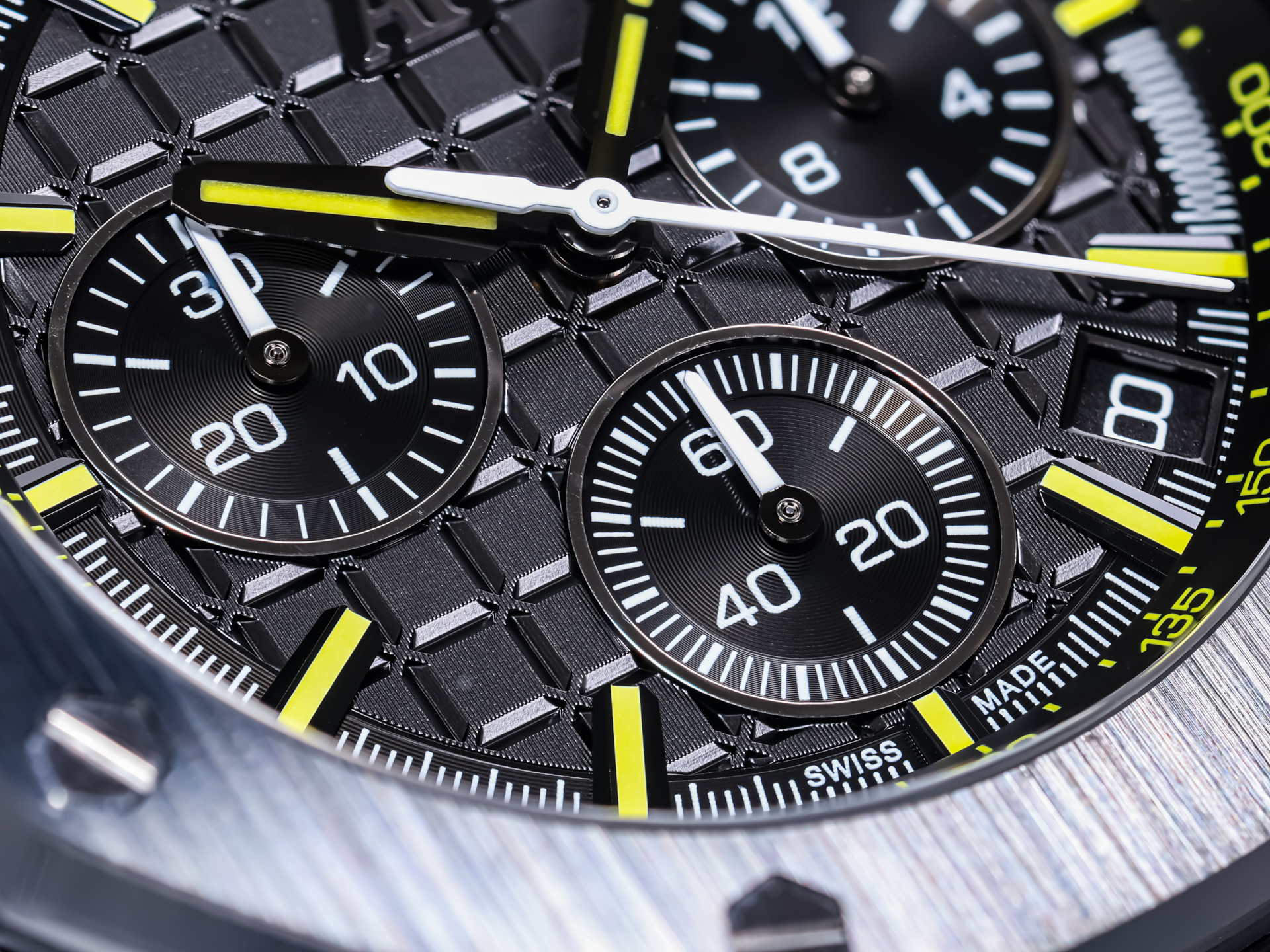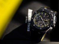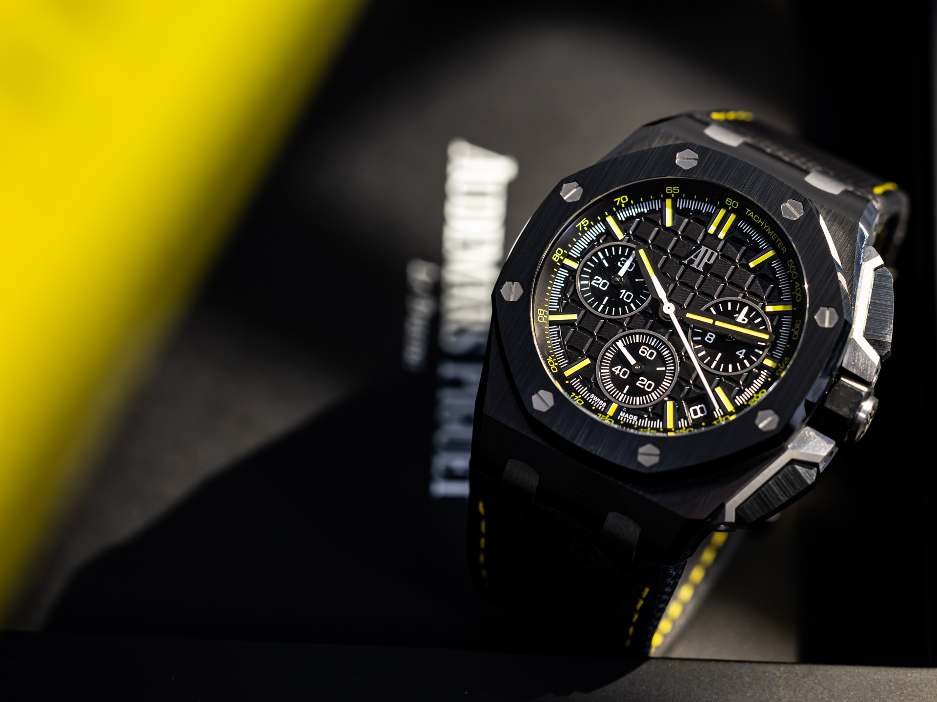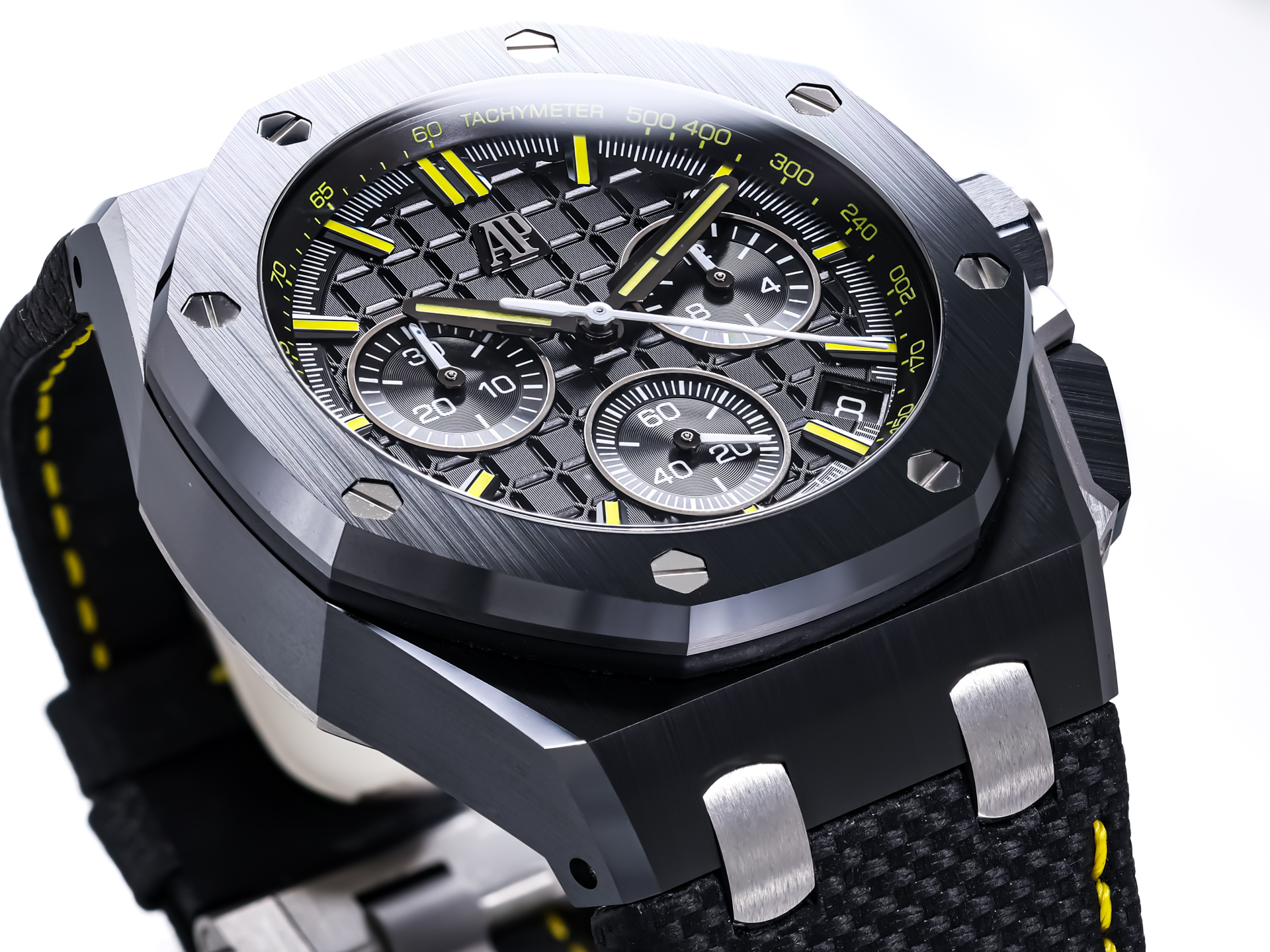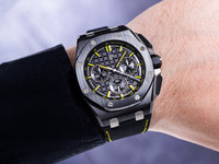 Crafted in black ceramic with a matching ceramic bezel, this limited reissue features bold yellow accents, a black Méga Tapisserie dial, and a grey calfskin strap — blending contemporary design with unmistakable heritage. With its 43mm diameter, the case has been re-engineered for improved ergonomics and refined proportions while maintaining the Offshore’s unmistakable presence.
