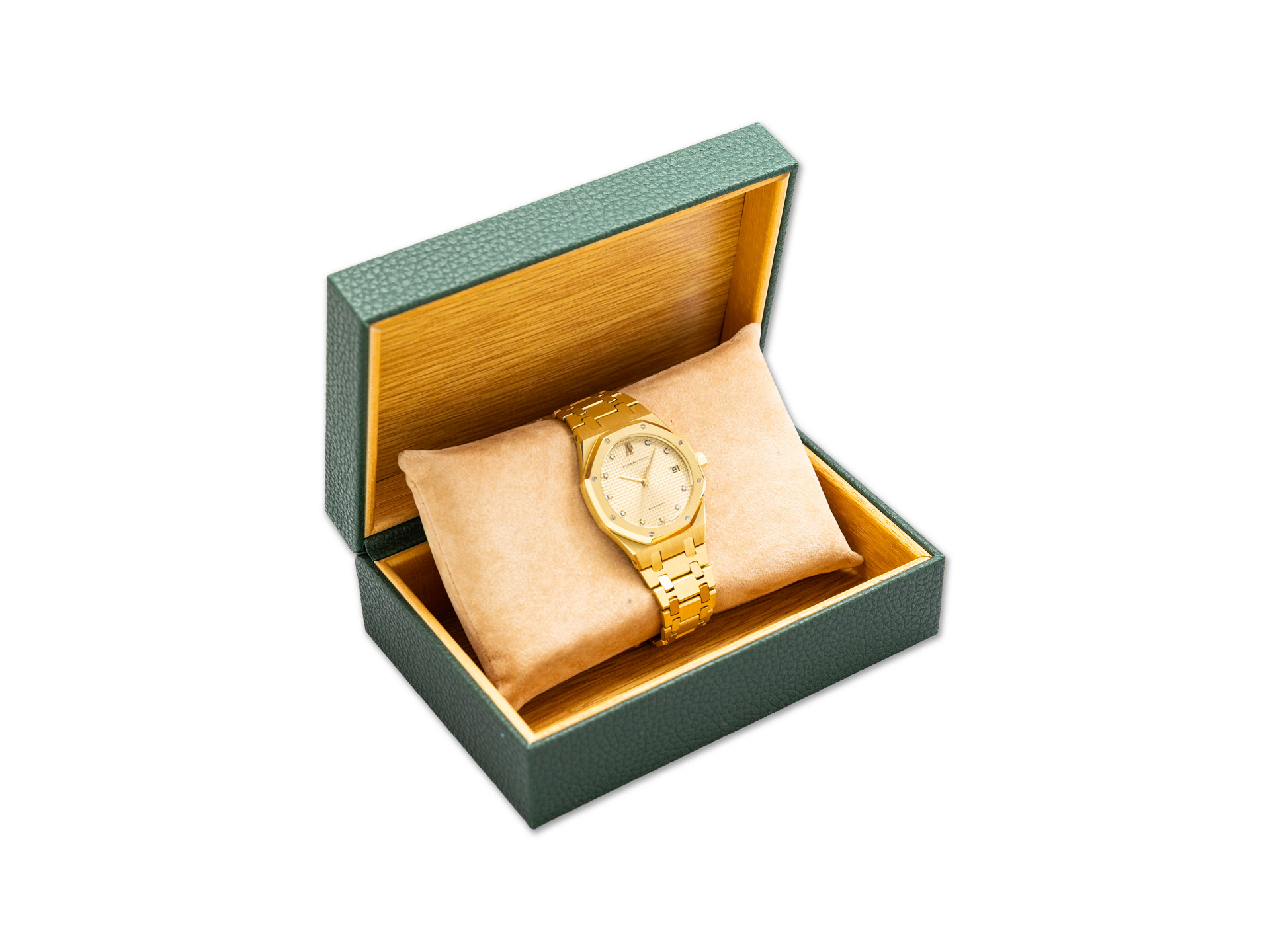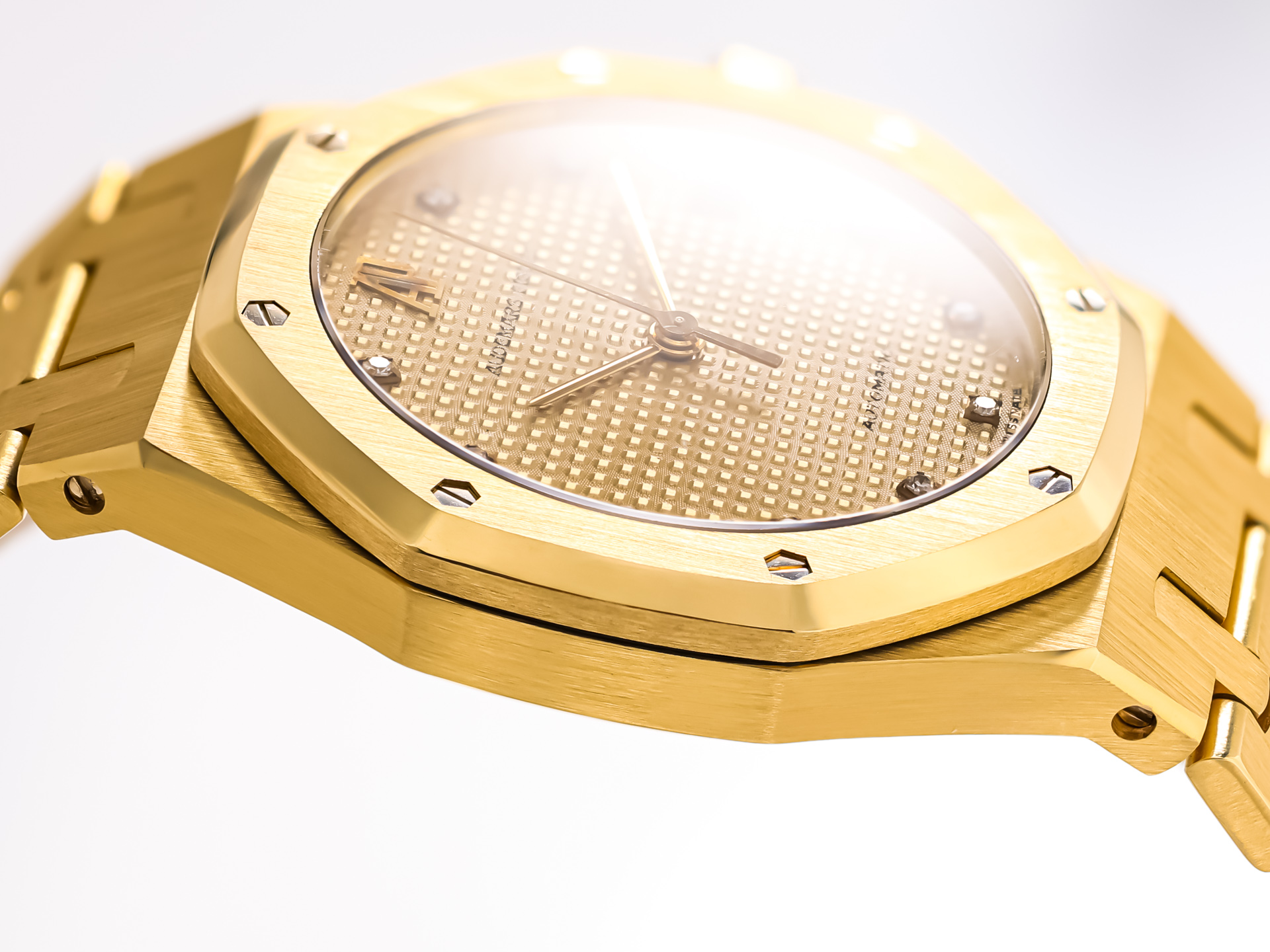 Dating to 1990, this reference represents an important chapter in Royal Oak evolution. The 36 mm case size — often nicknamed the “Mini Jumbo” — preserves the elegant proportions and architectural sharpness of the original Genta design while offering superb versatility on the wrist. Produced in far smaller quantities than the steel variants, full-gold 14700 examples remain especially prized among collectors.
