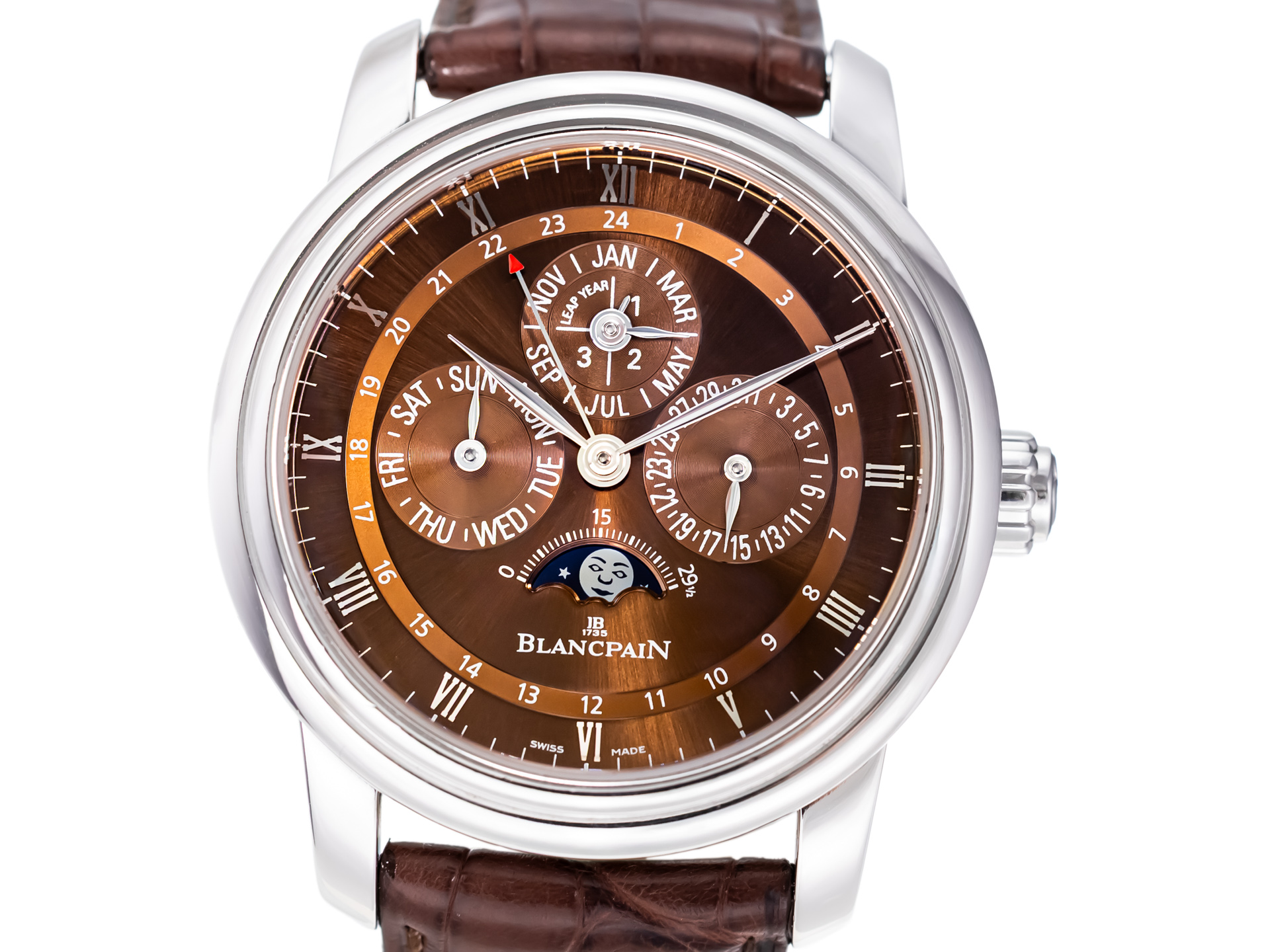 The Perpetual Calendar & GMT function is a hallmark of Blancpain’s technical prowess: displays for day, date, month, leap year, moonphase, and a second time zone—ensuring perfect usability for both collectors and travelers.
