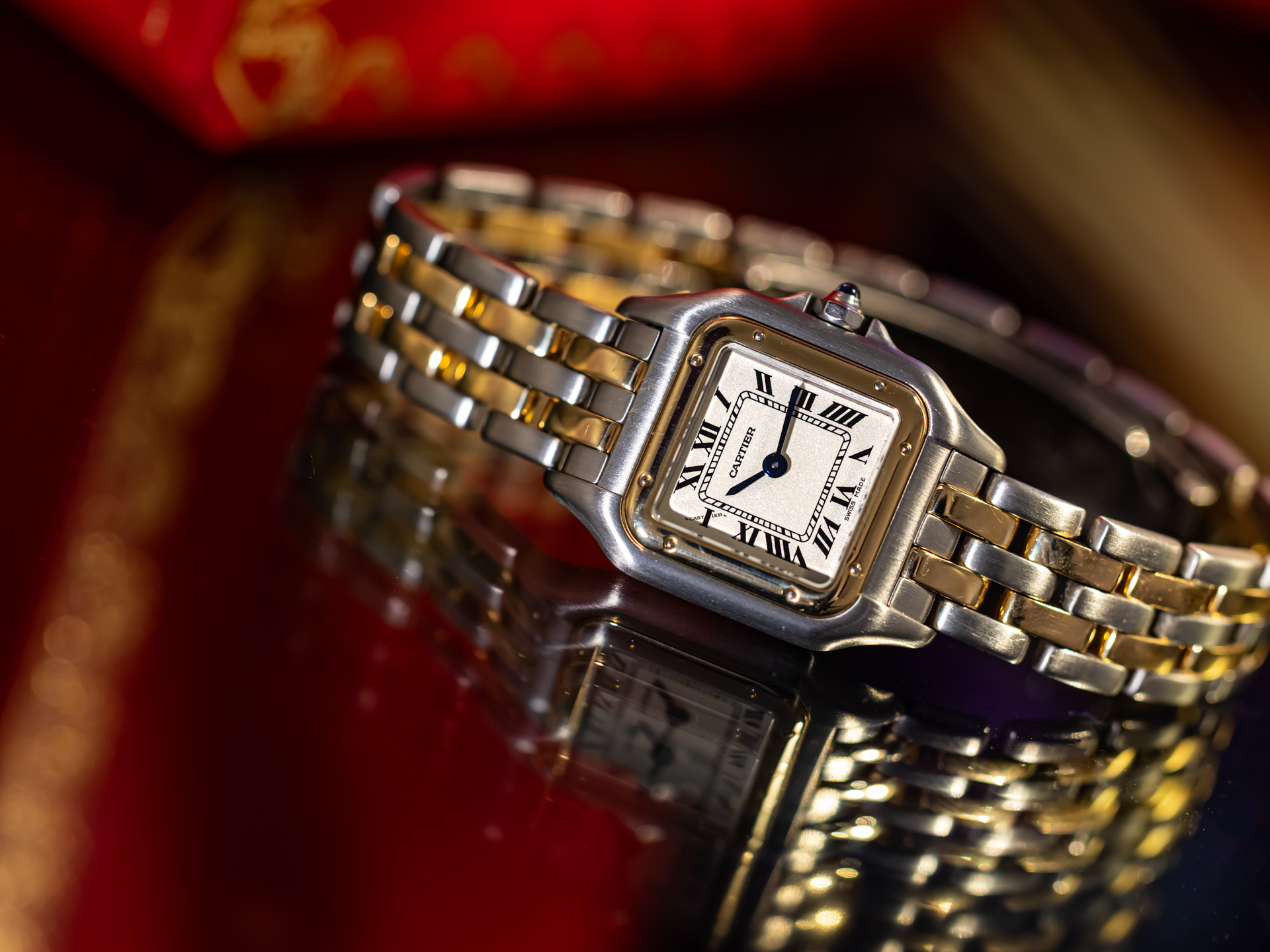 The Panthère was introduced in the early 1980s and quickly became one of Cartier's most iconic creations—the epitome of elegance, sensuality, and refined Parisian style. The flowing bracelet links and seamless integration with the case give the watch a distinctive, jewelry-like appearance while preserving Cartier's timeless sophistication.