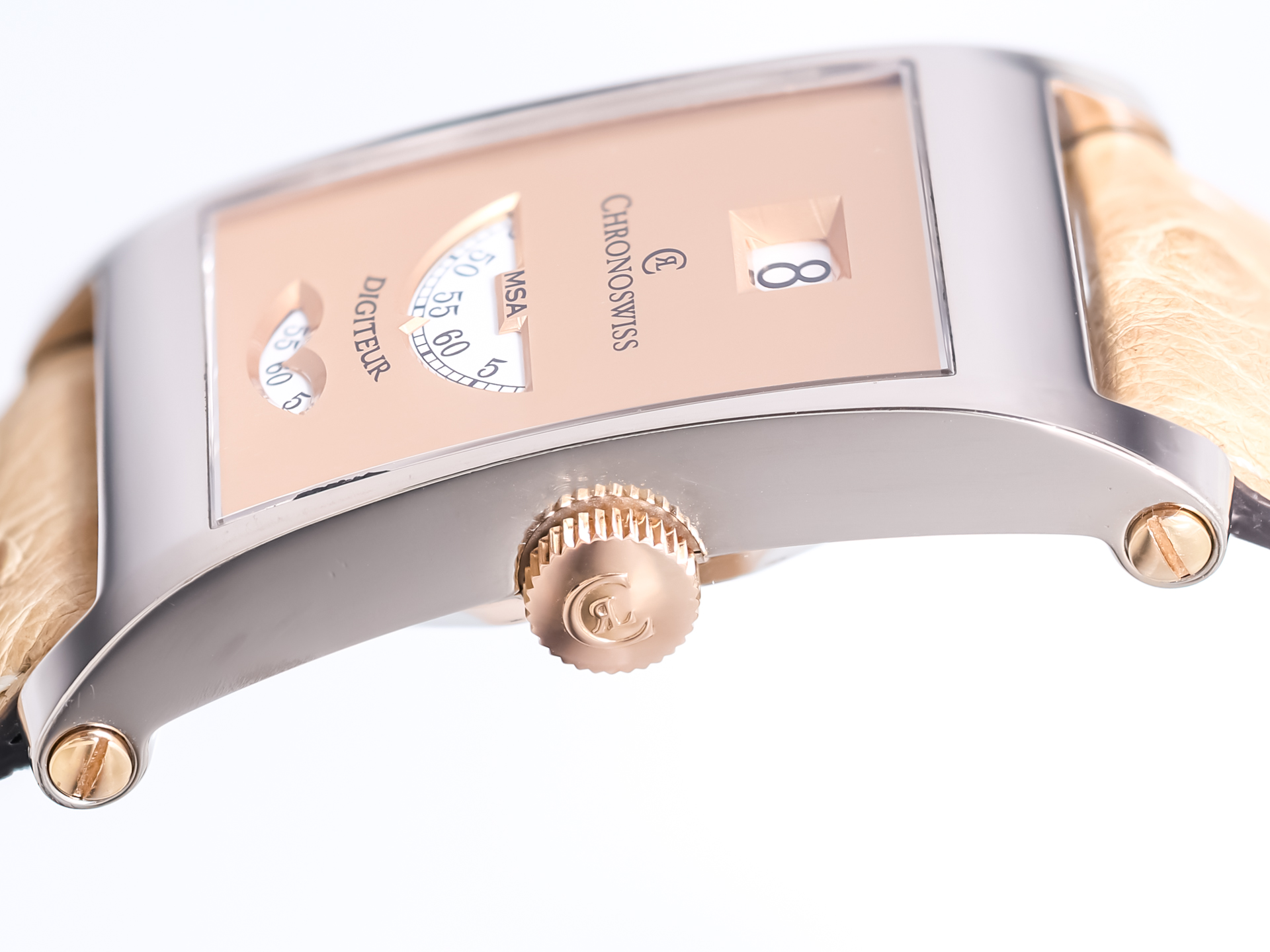 We are pleased to present this exceptional Chronoswiss Digiteur, a bold and unconventional timepiece that exemplifies the brand’s independent spirit and technical creativity. Crafted in 18k white gold, this reference stands out for its mechanical complexity and unmistakable design language.
