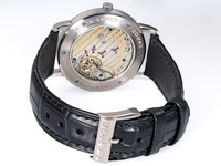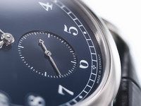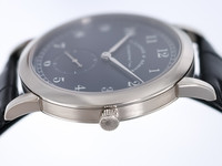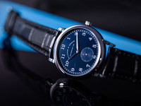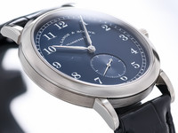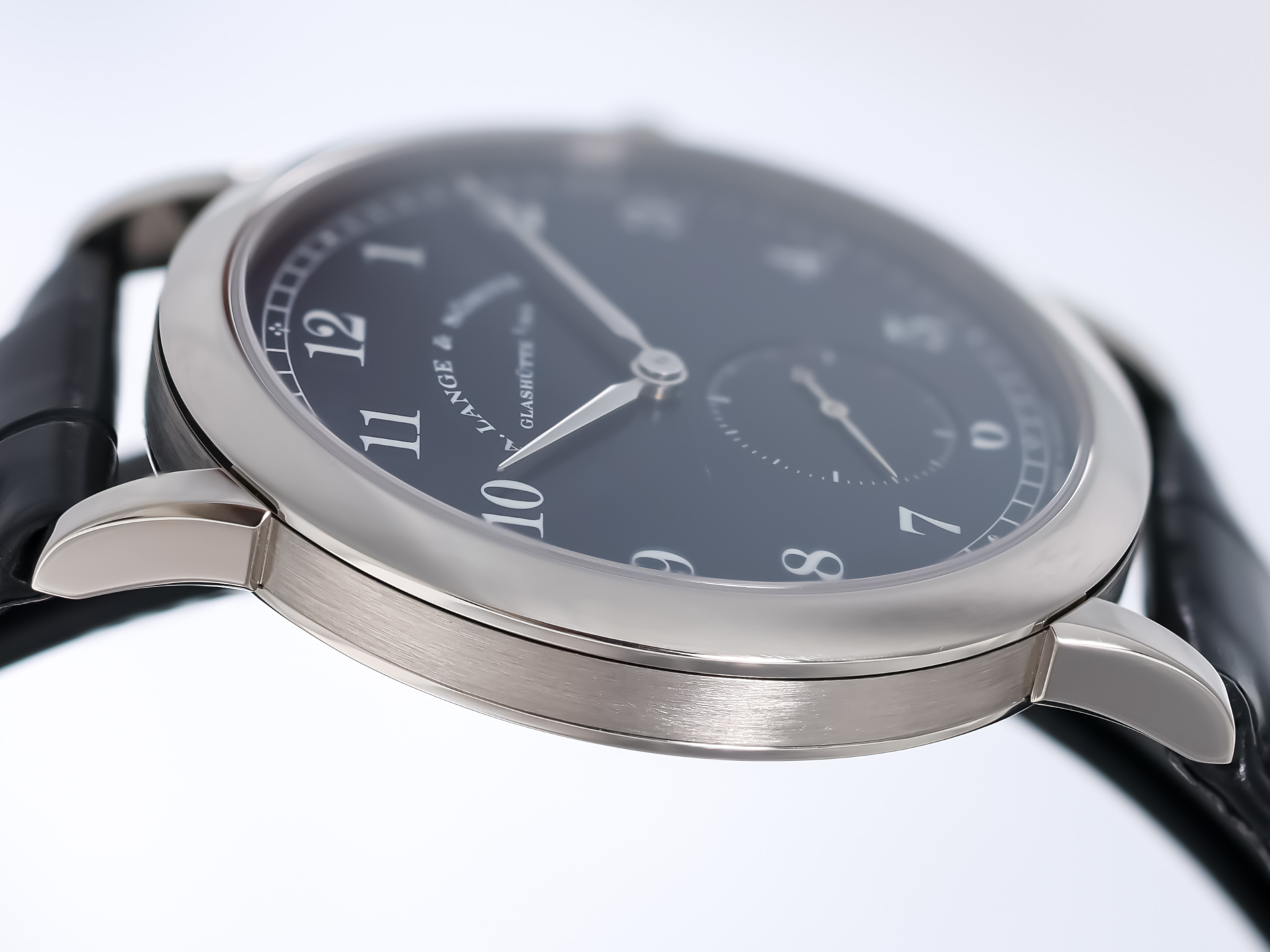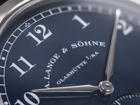 The 36mm white gold case is beautifully proportioned and finished to Lange’s exacting standards, with a mix of polished and brushed surfaces that exude refinement. The rich matte blue dial features classic Arabic numerals and a small seconds subdial at 6 o’clock, all framed by the signature railway minute track.