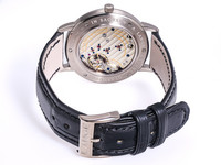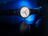 The watch is fitted with a high-quality leather strap and an 18k white gold buckle, perfectly complementing the case and maintaining the watch’s refined character.
