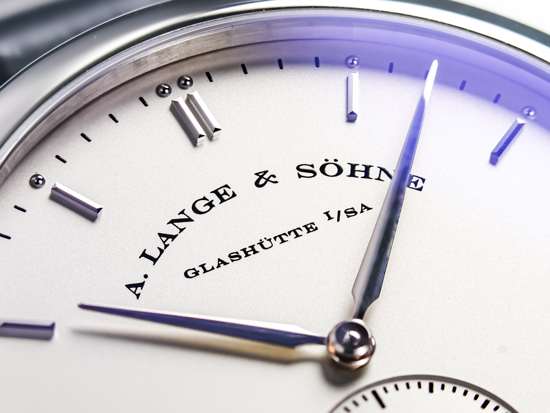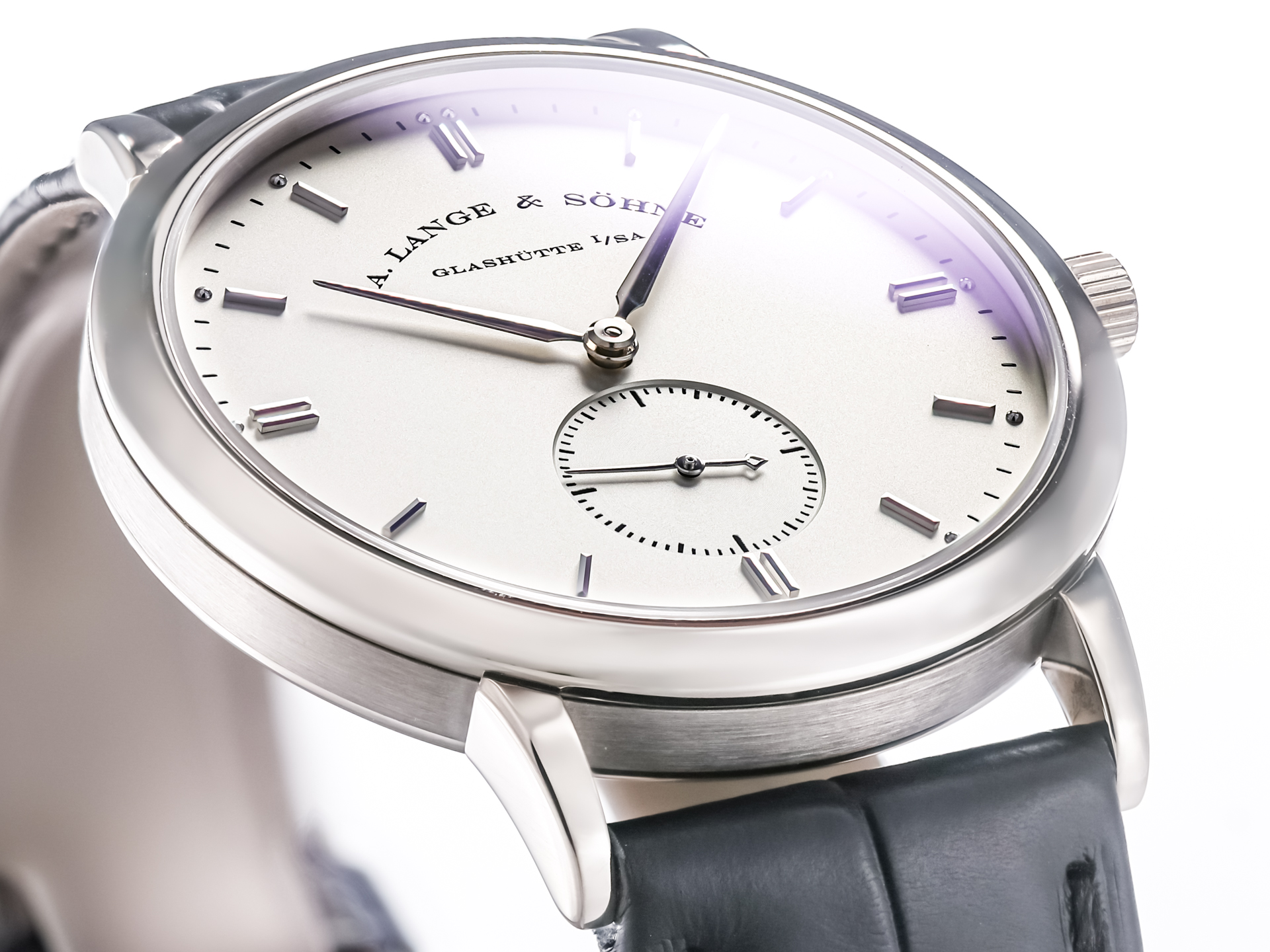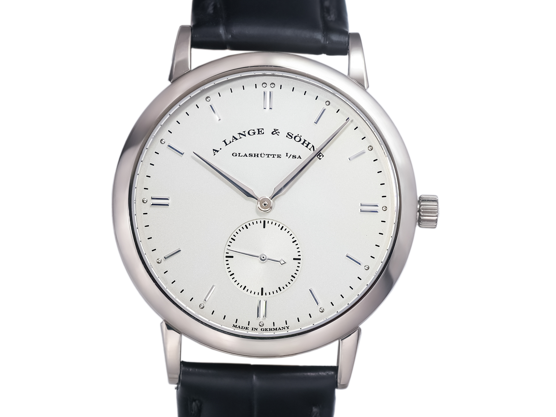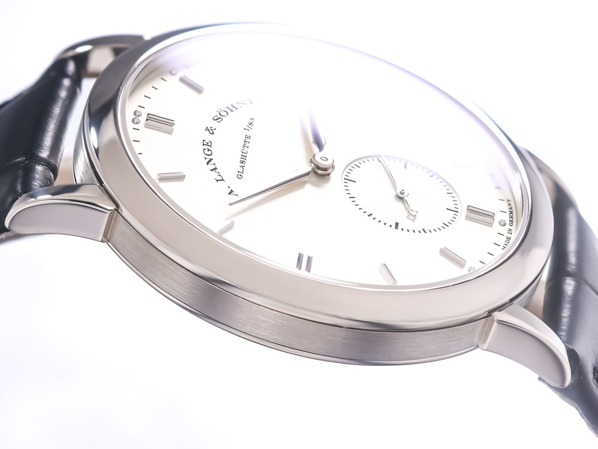 The dial is a study in clarity and balance, featuring a harmonious layout with applied hour markers, slender hands, and a small seconds subdial. The restrained design emphasizes legibility and timeless sophistication, hallmarks of A. Lange & Söhne’s aesthetic approach.