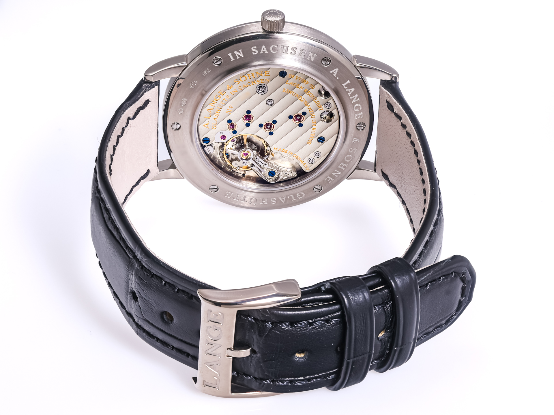 At the heart of the watch beats the in-house manually wound caliber L941.1, a movement finished to the highest standards of traditional Saxon watchmaking. Visible through the sapphire crystal case back, it reveals untreated German silver plates, hand-engraved balance cock, blued screws, and gold chatons—each detail executed with exceptional precision and artistry.