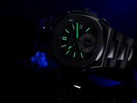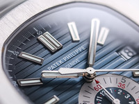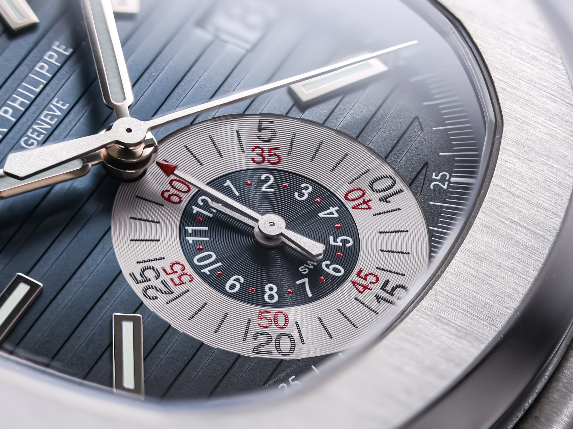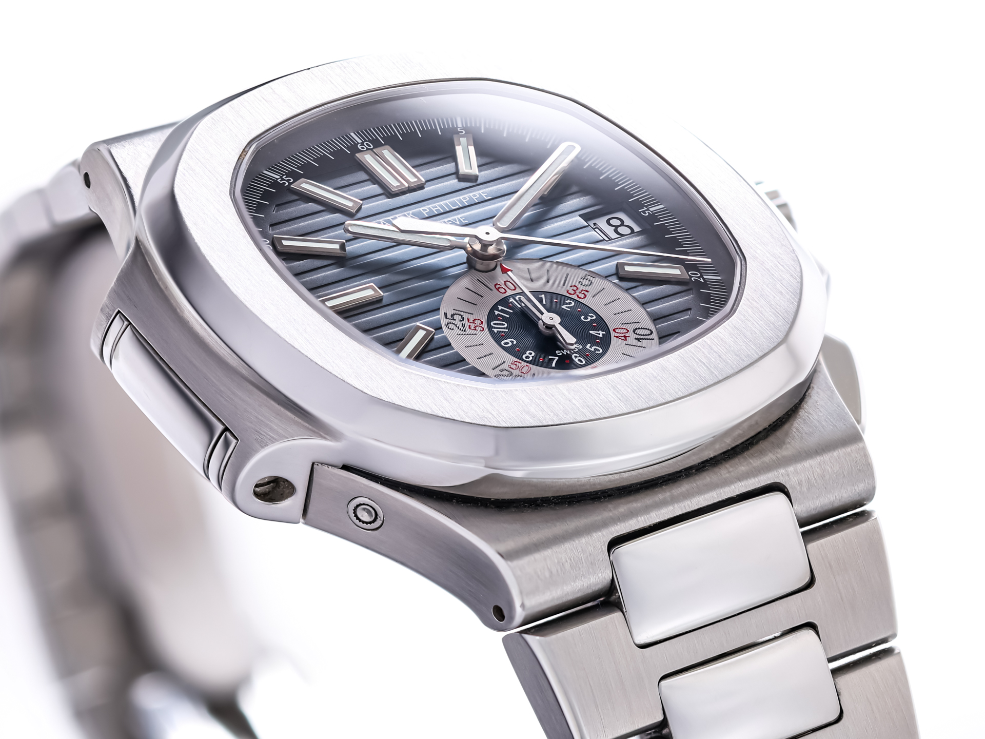 The striking blue horizontally embossed dial is a hallmark of the Nautilus collection. Its subtle gradient tones and refined finishing create exceptional depth, while luminous hour markers and hands ensure superb legibility. The dial also features the distinctive chronograph monocounter at 6 o’clock, which integrates both the 60-minute and 12-hour chronograph displays in a single subdial, preserving the dial’s clean and balanced appearance.