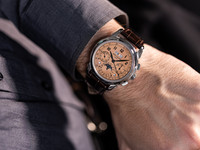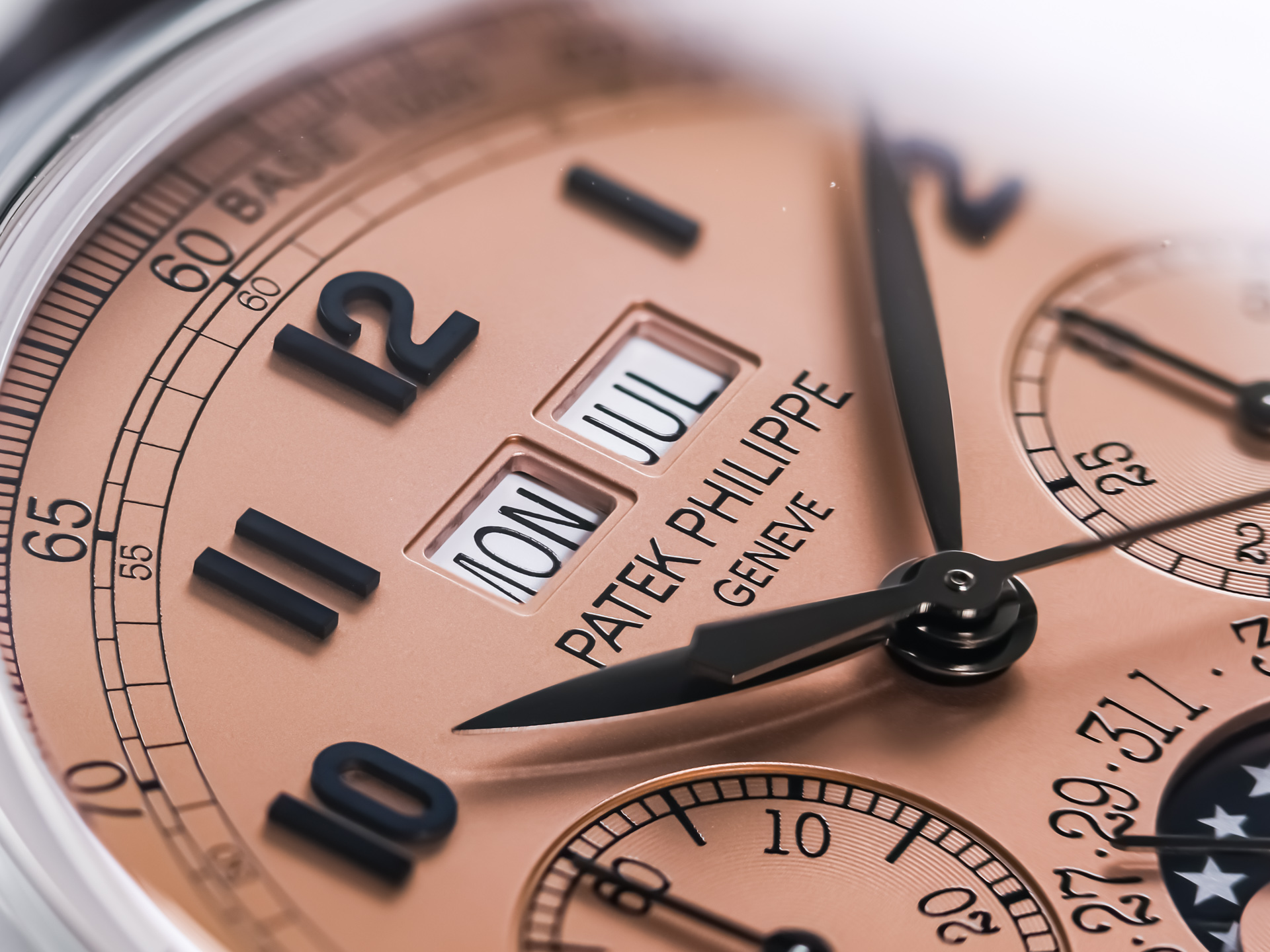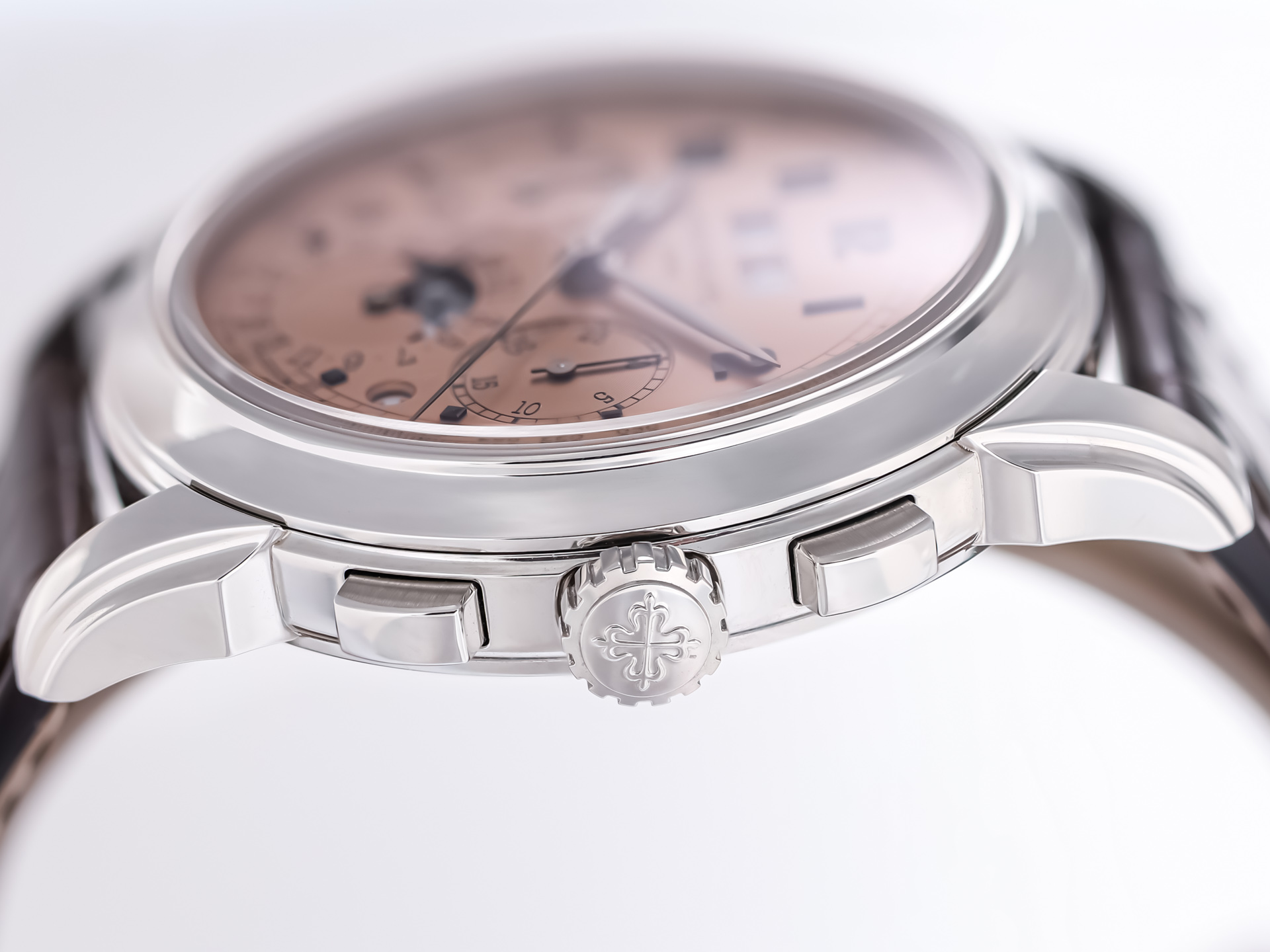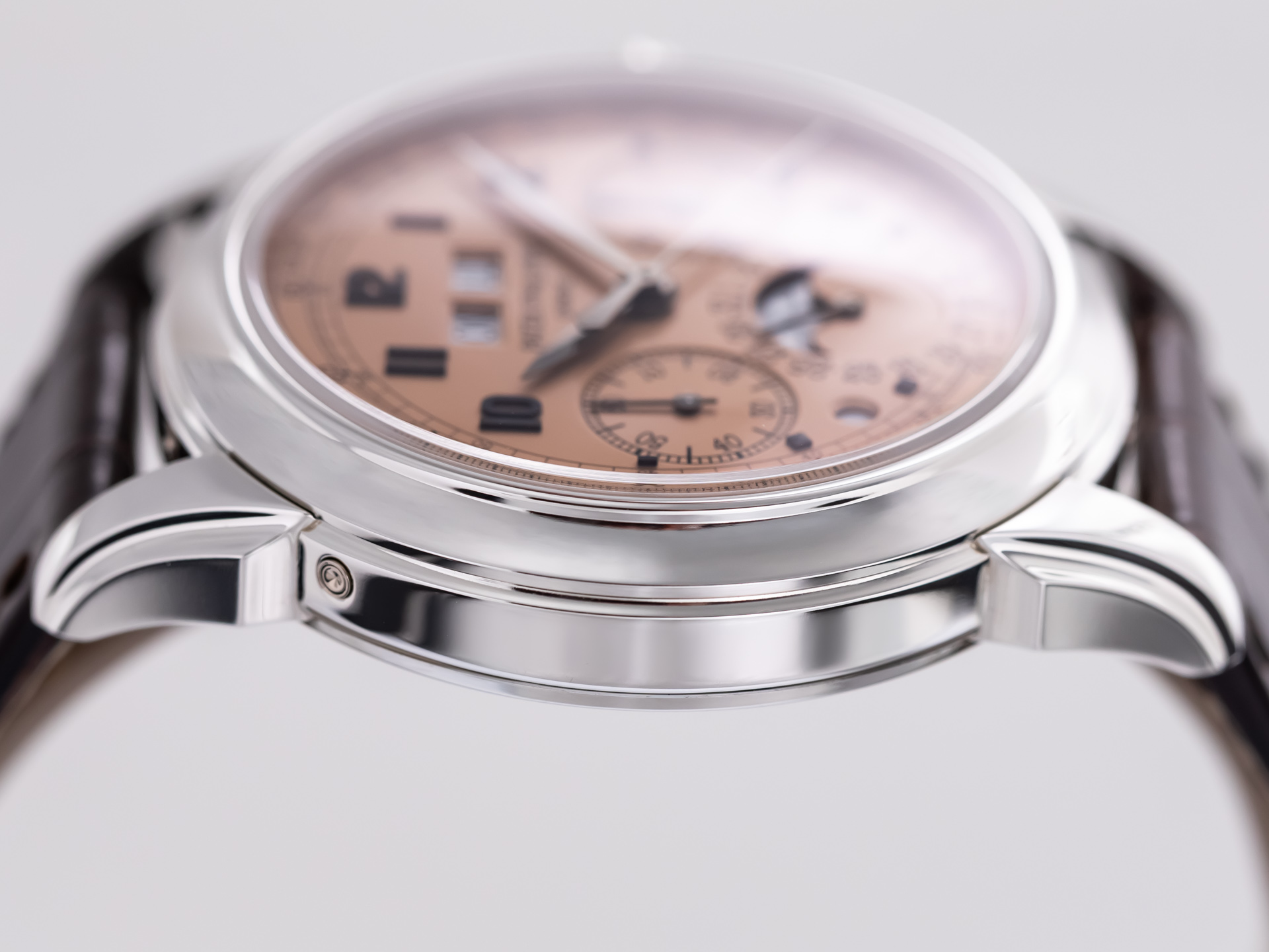 The salmon dial, unique to the platinum variant, features applied blackened gold Arabic numerals and feuille hands, creating a stunning visual contrast that shifts beautifully in different lighting. The dial layout displays day and month apertures at 12 o’clock, a moon phase with date at 6 o’clock, and subsidiary dials for the chronograph functions, balanced by the leap-year and day/night indicators — all executed with perfect harmony.