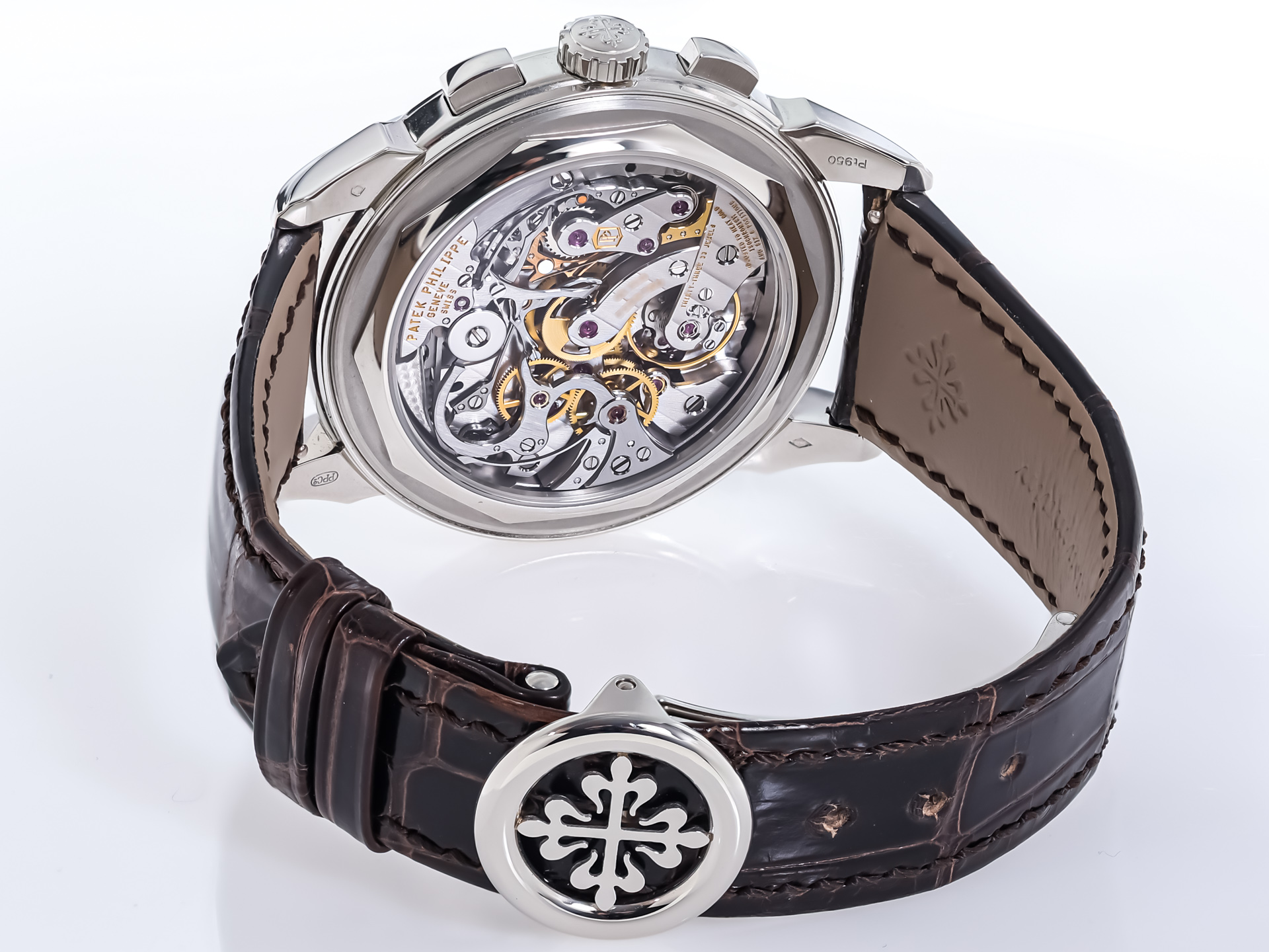 Inside beats the Patek Philippe Calibre CH 29-535 PS Q, a manually wound, fully integrated chronograph movement with perpetual calendar — admired for its architecture, impeccable finishing, and mechanical artistry visible through the sapphire display back.