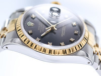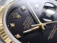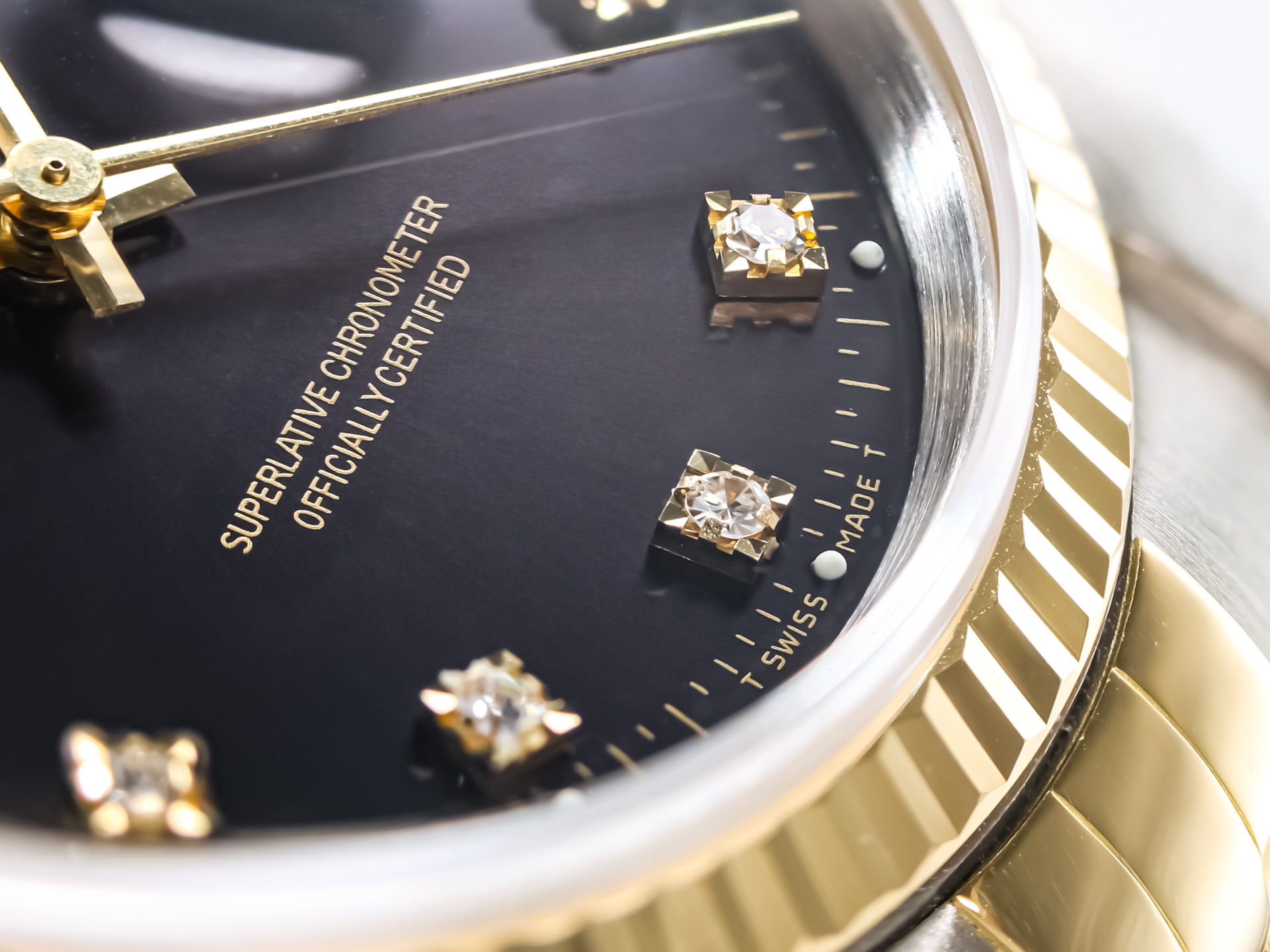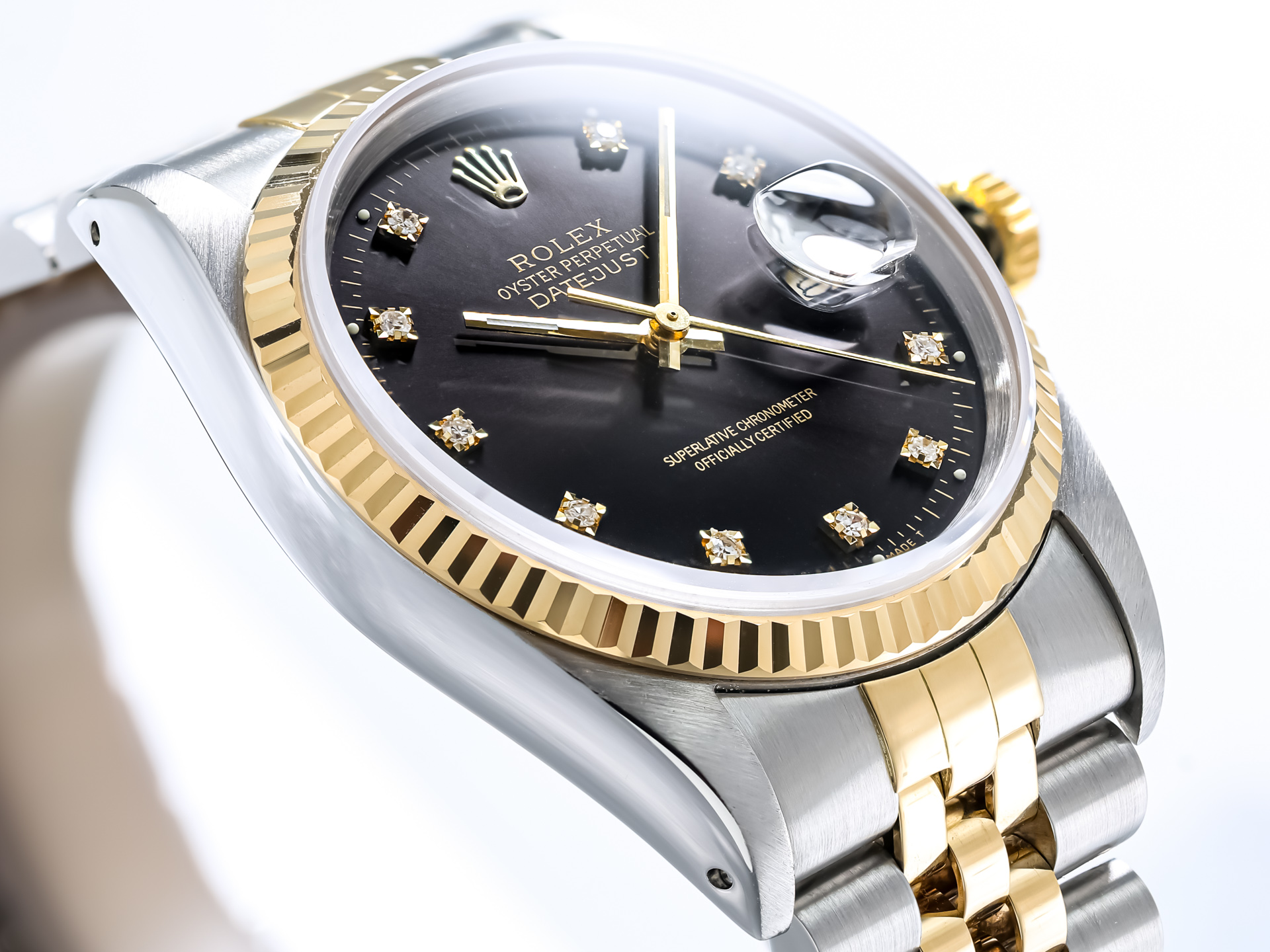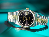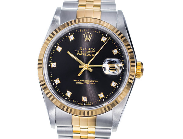 Crafted in stainless steel and 18k yellow gold, this iconic model features the signature fluted yellow gold bezel and Oyster case, paired with the elegant Jubilee bracelet. The standout feature of this example is its striking original black diamond dial, adorned with factory-set diamond hour markers that create a sophisticated and luxurious contrast against the two-tone case.
