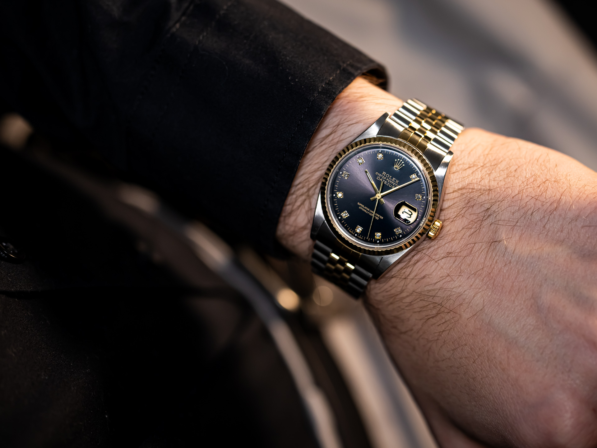 The 36 mm case size offers classic proportions that remain timeless and versatile, suitable for both formal and everyday wear. A sapphire crystal with Cyclops magnification highlights the date display at 3 o’clock, a defining characteristic of the Datejust collection.