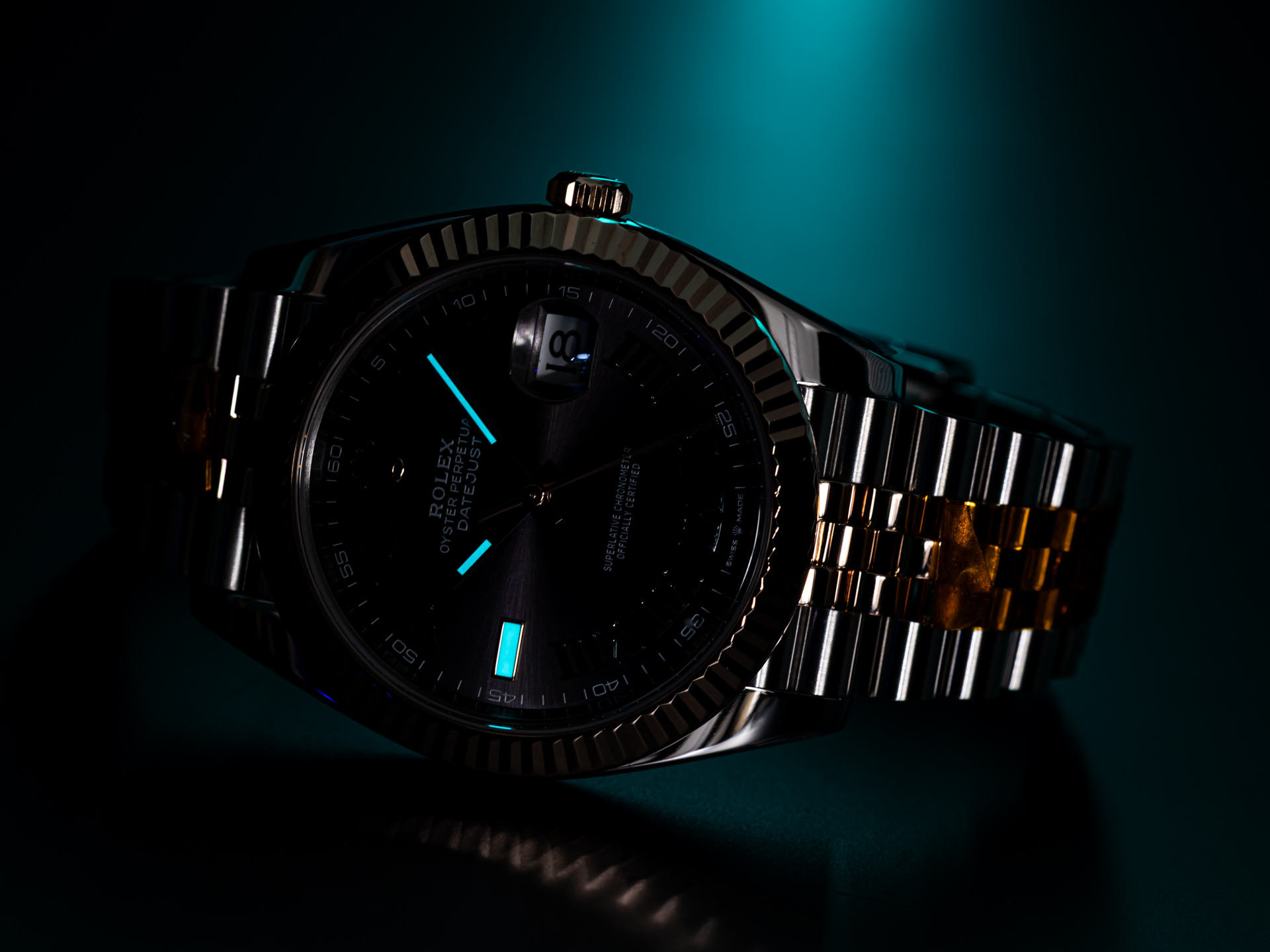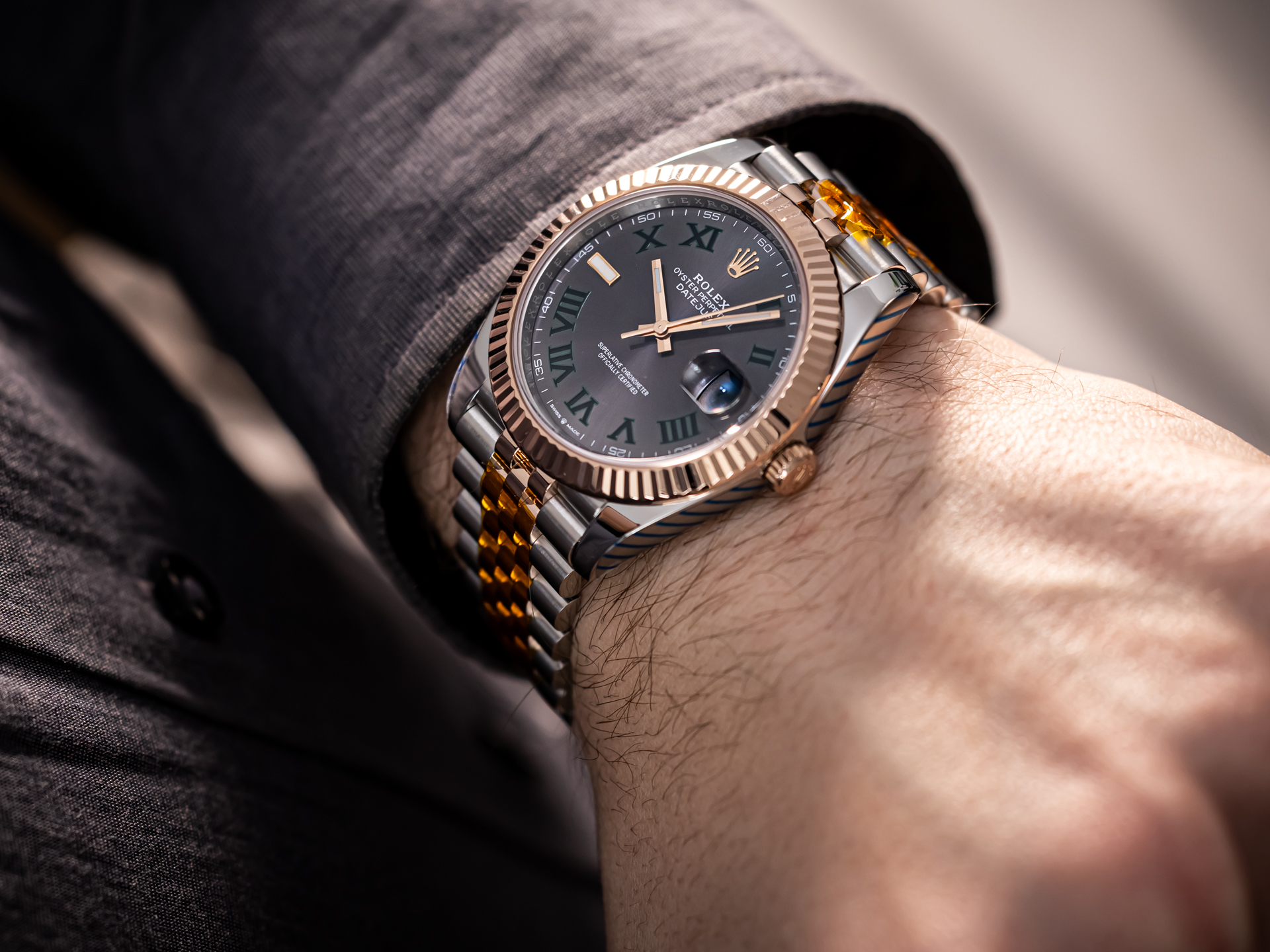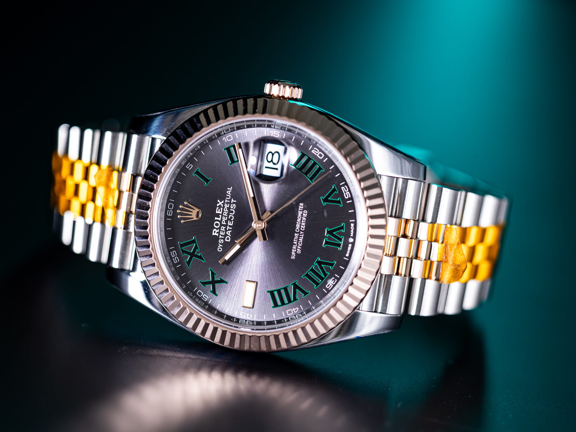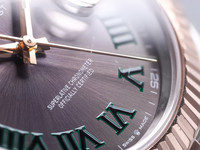 The distinctive Wimbledon dial is undoubtedly the highlight of this configuration. Its slate-grey sunburst finish is complemented by bold green Roman numerals and luminous baton indices, creating a refined yet sporty appearance. The contrasting green accents provide a subtle connection to the prestigious tennis heritage associated with this dial variation, while maintaining a versatile and sophisticated overall look. The date window at 3 o’clock, enhanced by the Cyclops lens, ensures optimal legibility and remains a defining feature of the Datejust line.
