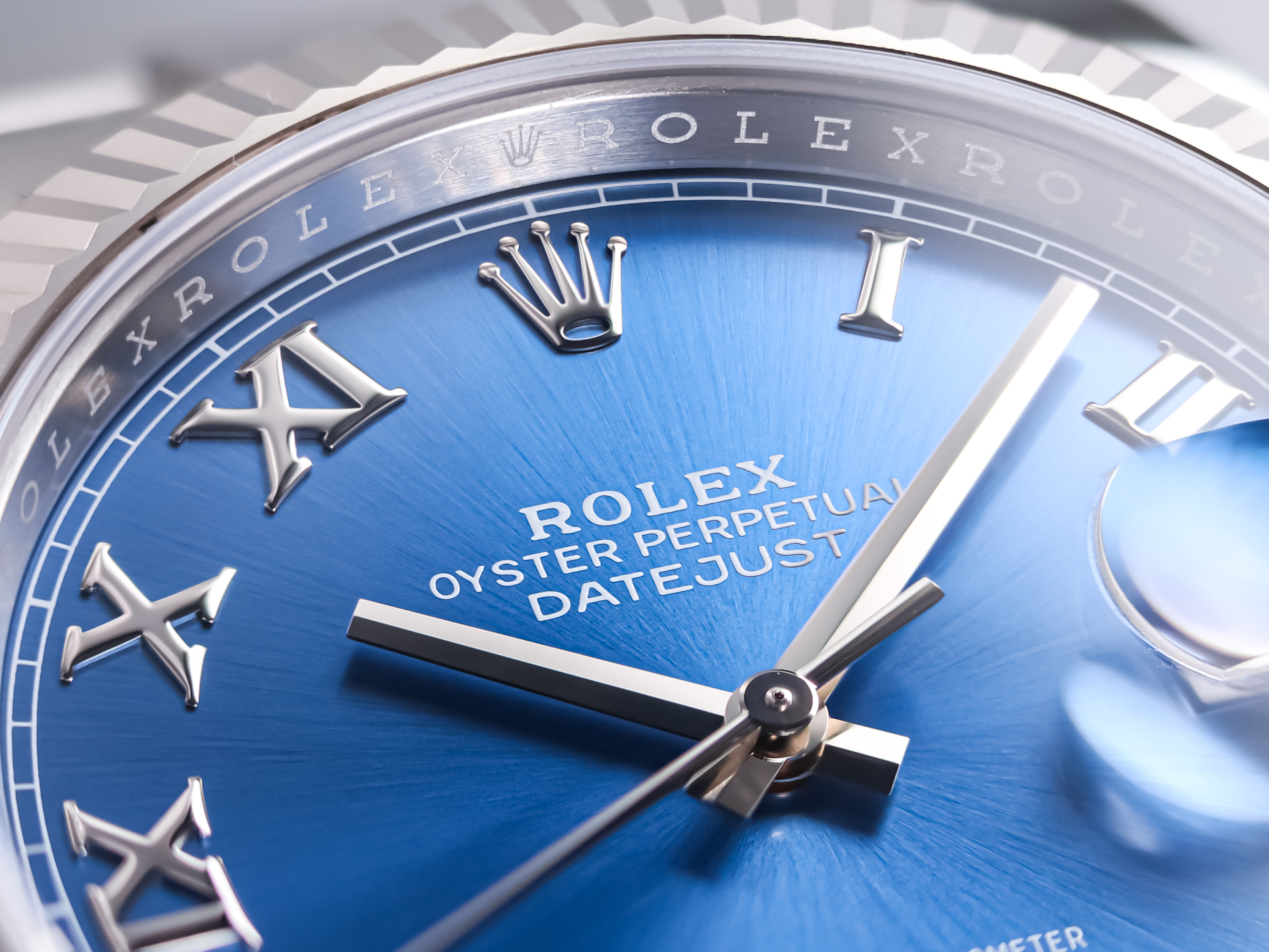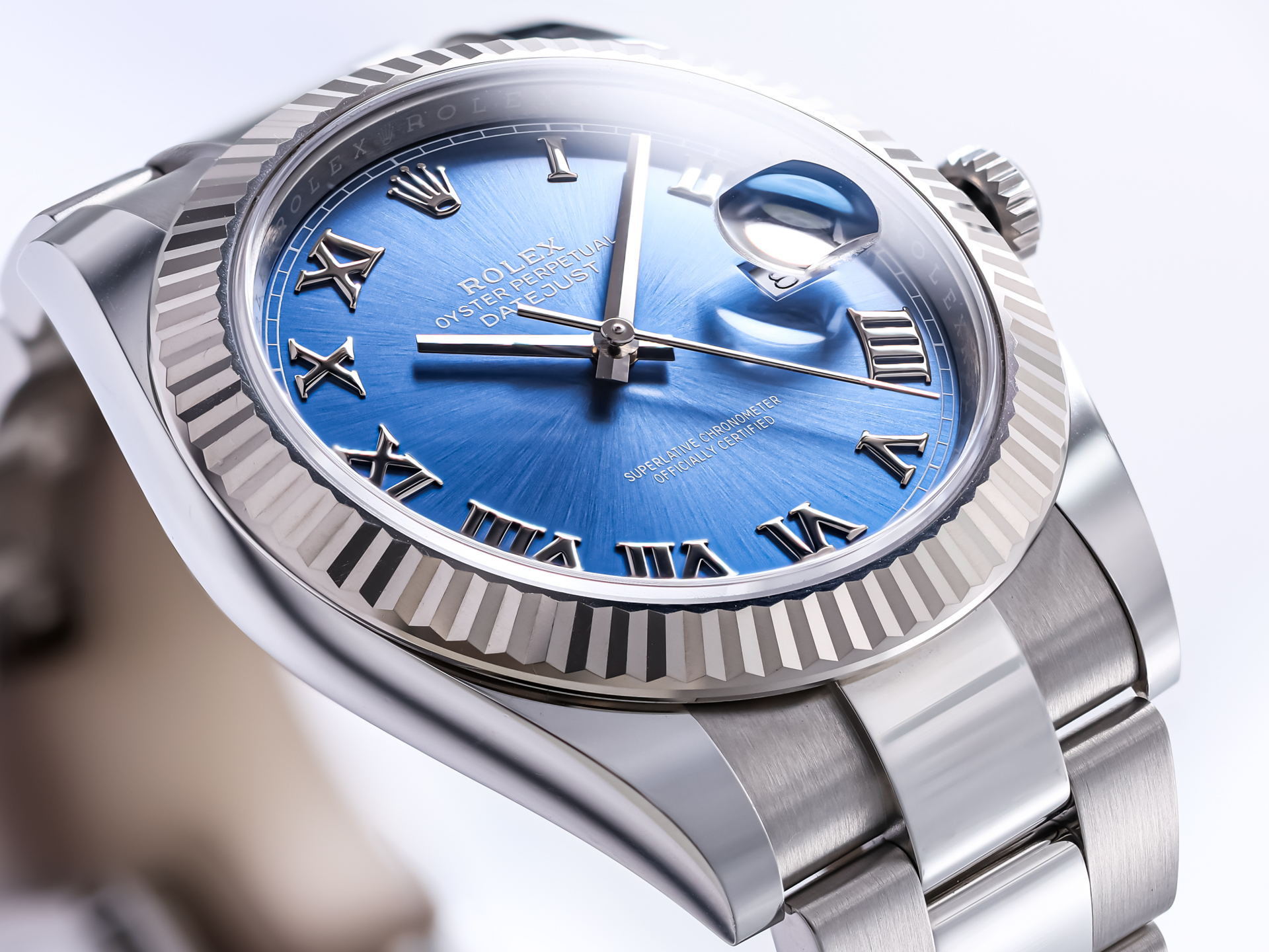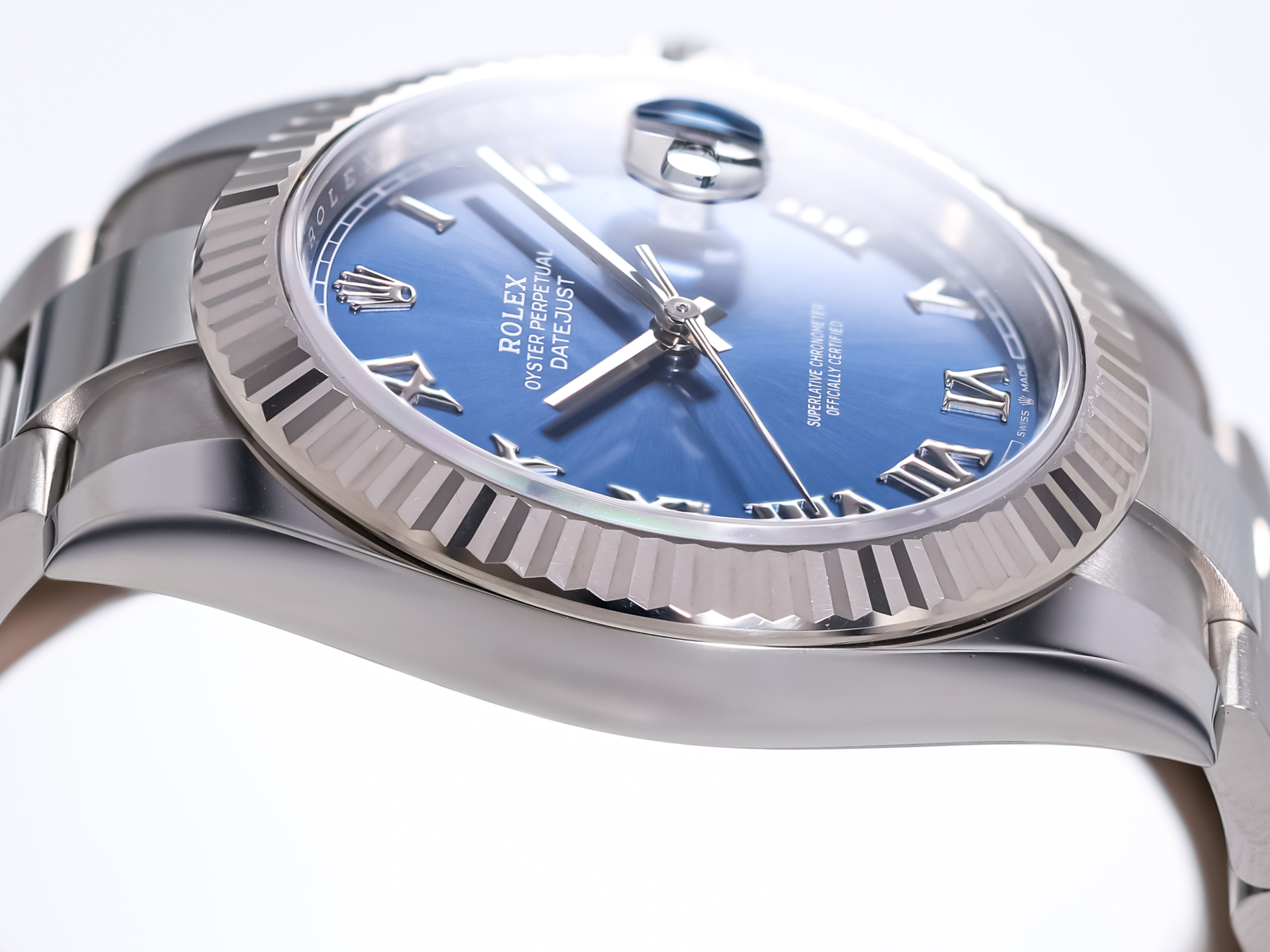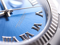 The highlight of this reference is the blue sunburst dial with applied silver roman numerals. The classic date aperture at 3 o’clock, enhanced by the Cyclops lens, ensures excellent legibility and instant recognition.