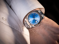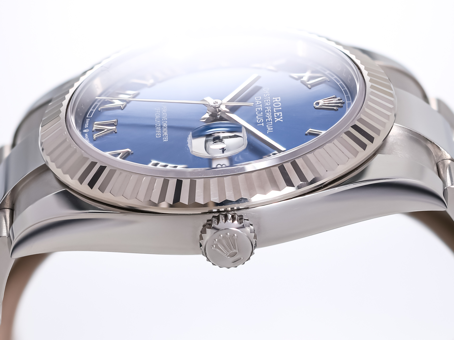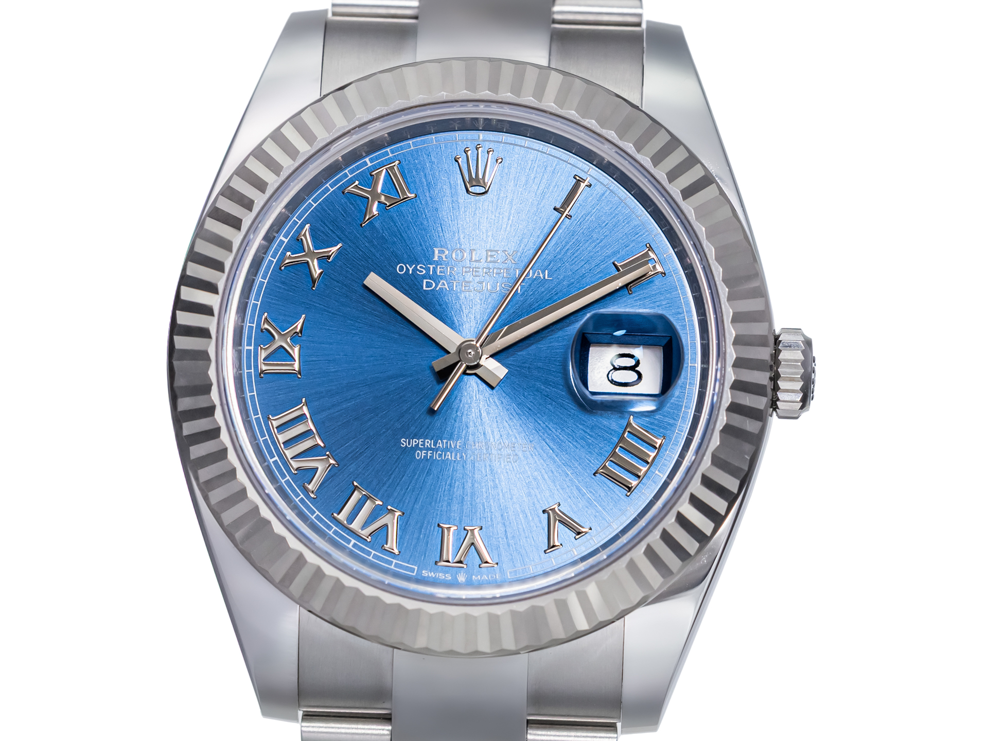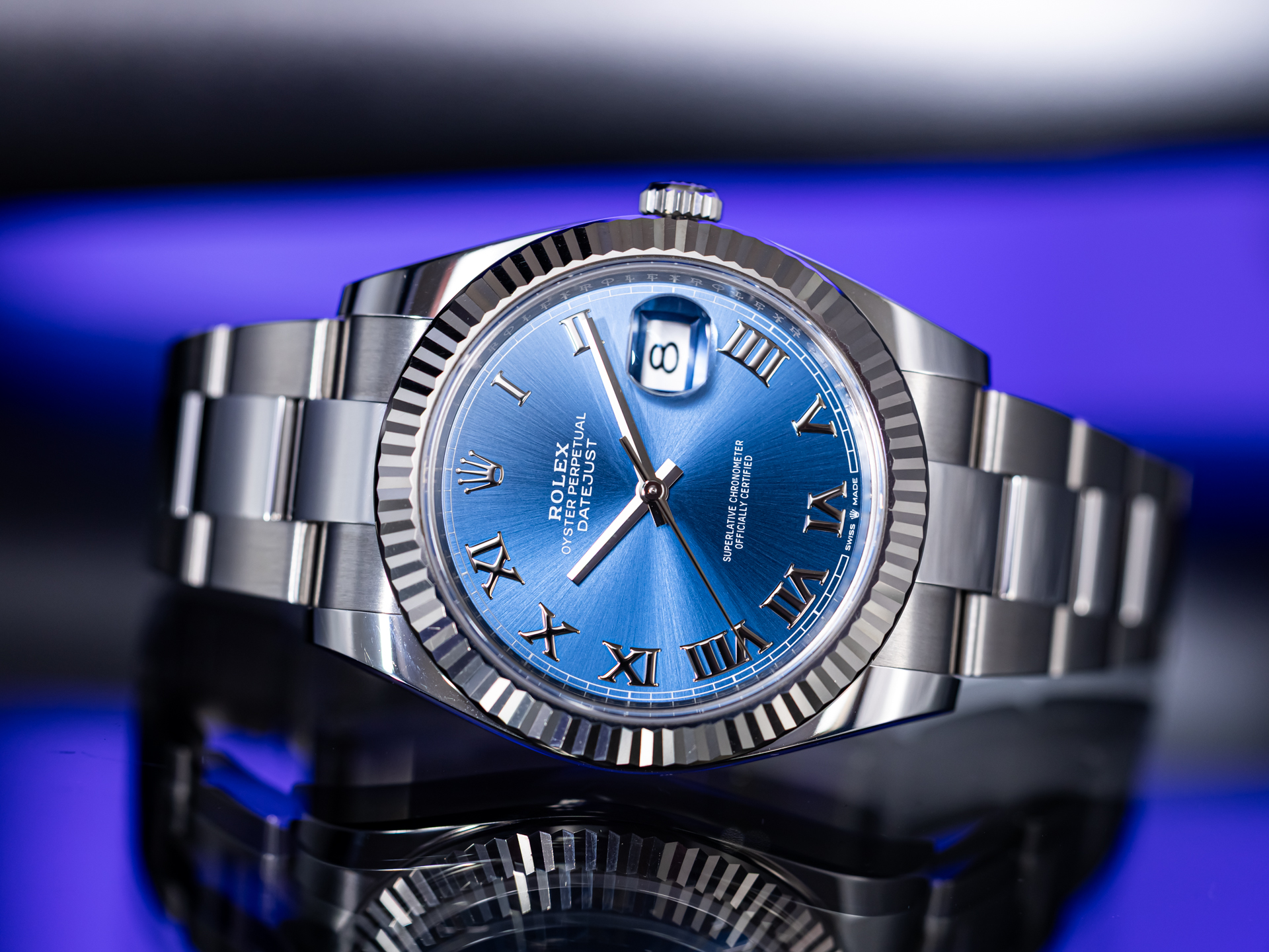 The highlight of this reference is the blue sunburst dial with applied silver roman numerals. The classic date aperture at 3 o’clock, enhanced by the Cyclops lens, ensures excellent legibility and instant recognition.