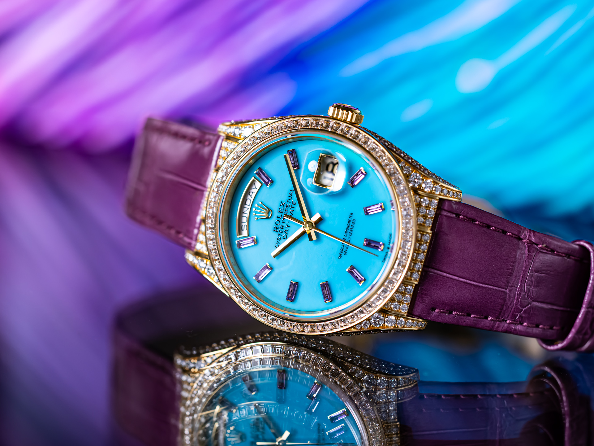 The watch is fitted with a stunning natural stone dial (type can be specified), celebrated for its organic depth, texture, and the intrinsic uniqueness that ensures no two examples are alike. Applied diamond hour markers complement the dial’s surface beautifully, adding elegance and radiance while maintaining excellent legibility. The classic Day-Date display — day at 12 o’clock and date at 3 o’clock beneath a cyclops lens — remains a hallmark of Rolex’s most prestigious line.