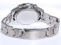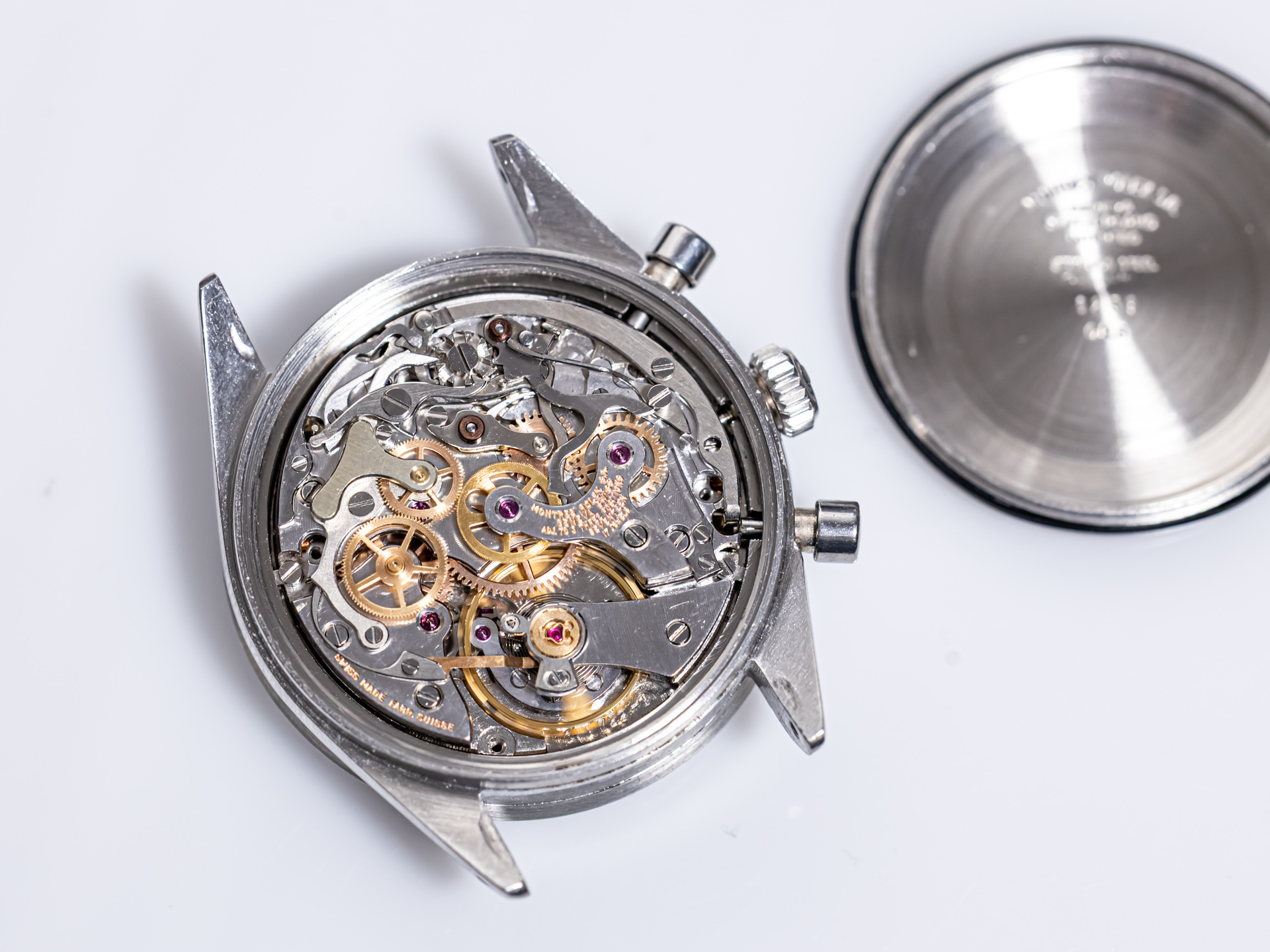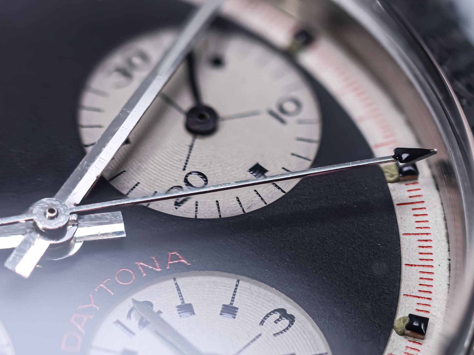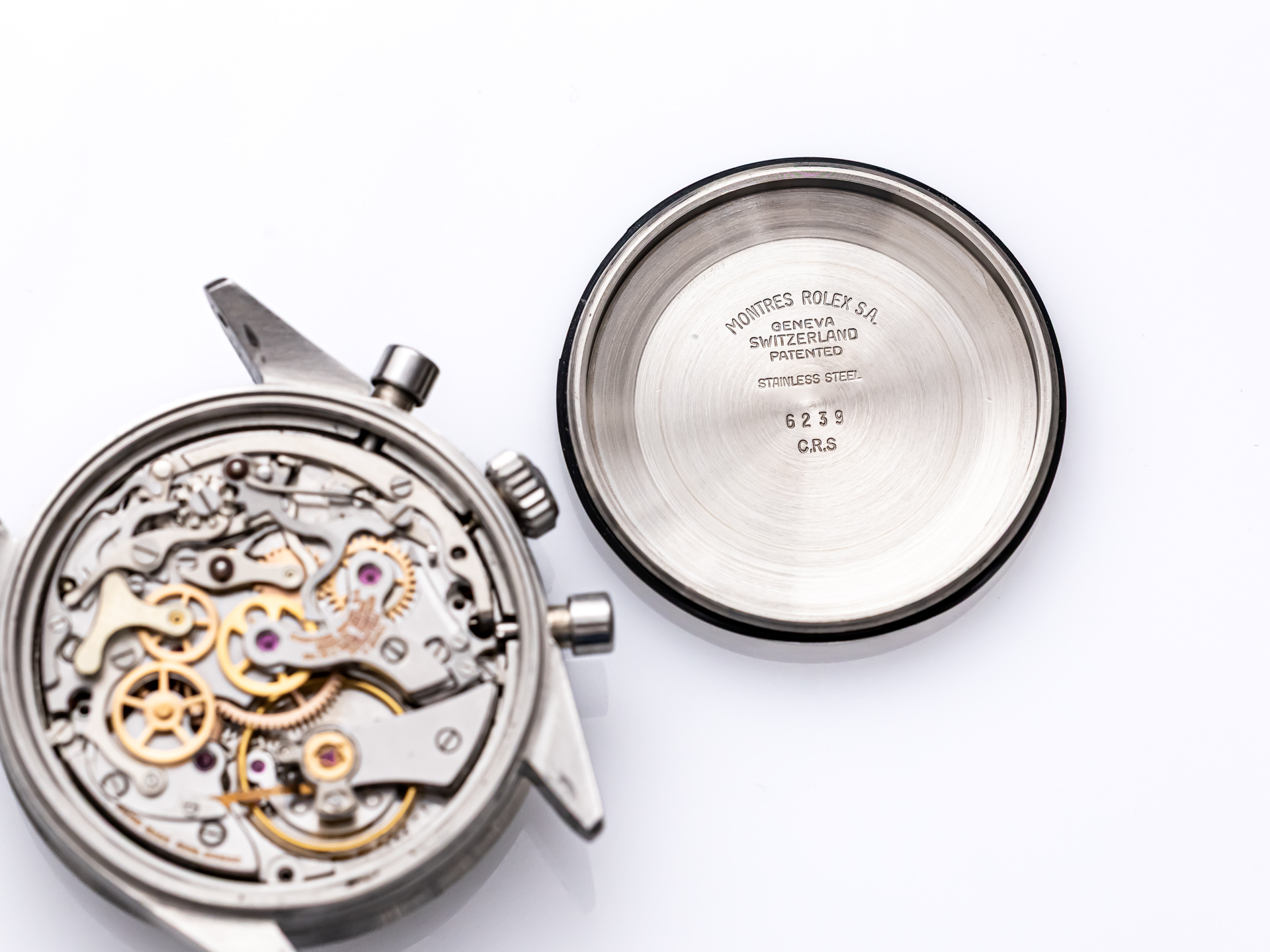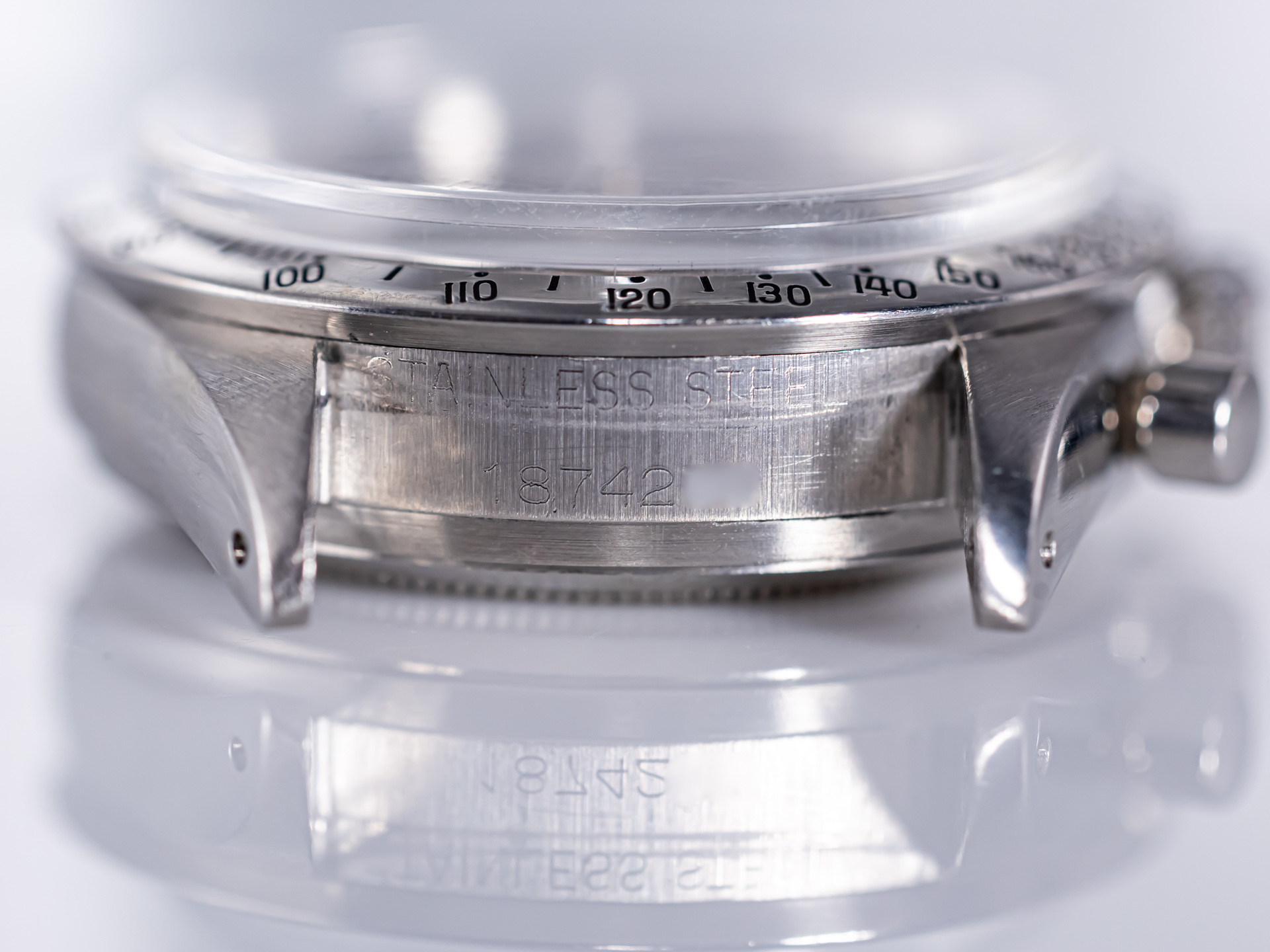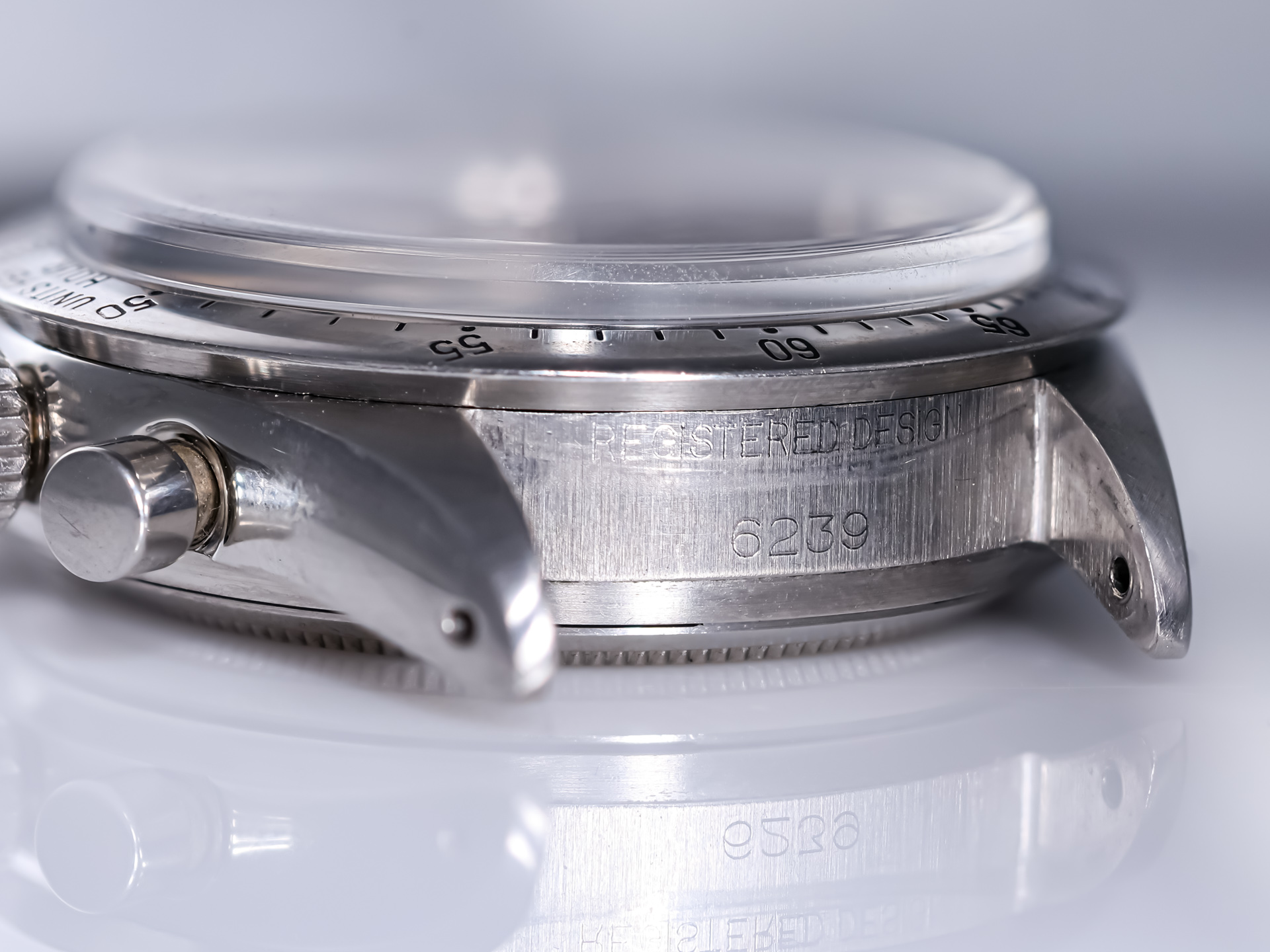 The stainless steel case features the classic pump pushers and engraved tachymeter bezel, defining the early Cosmograph aesthetic. The case retains strong proportions, preserving the sharp, purposeful design that made the reference 6239 a benchmark for professional chronographs of its era.
