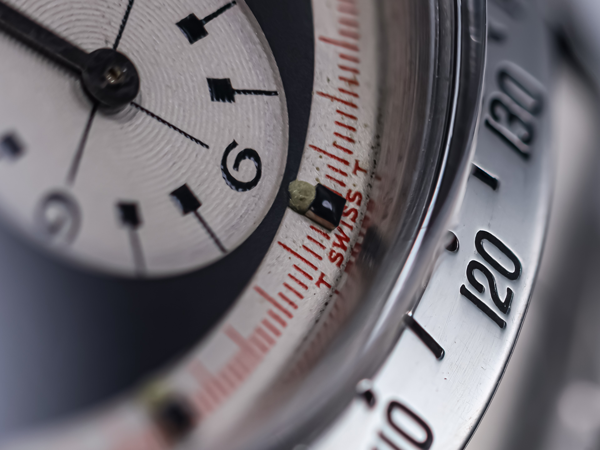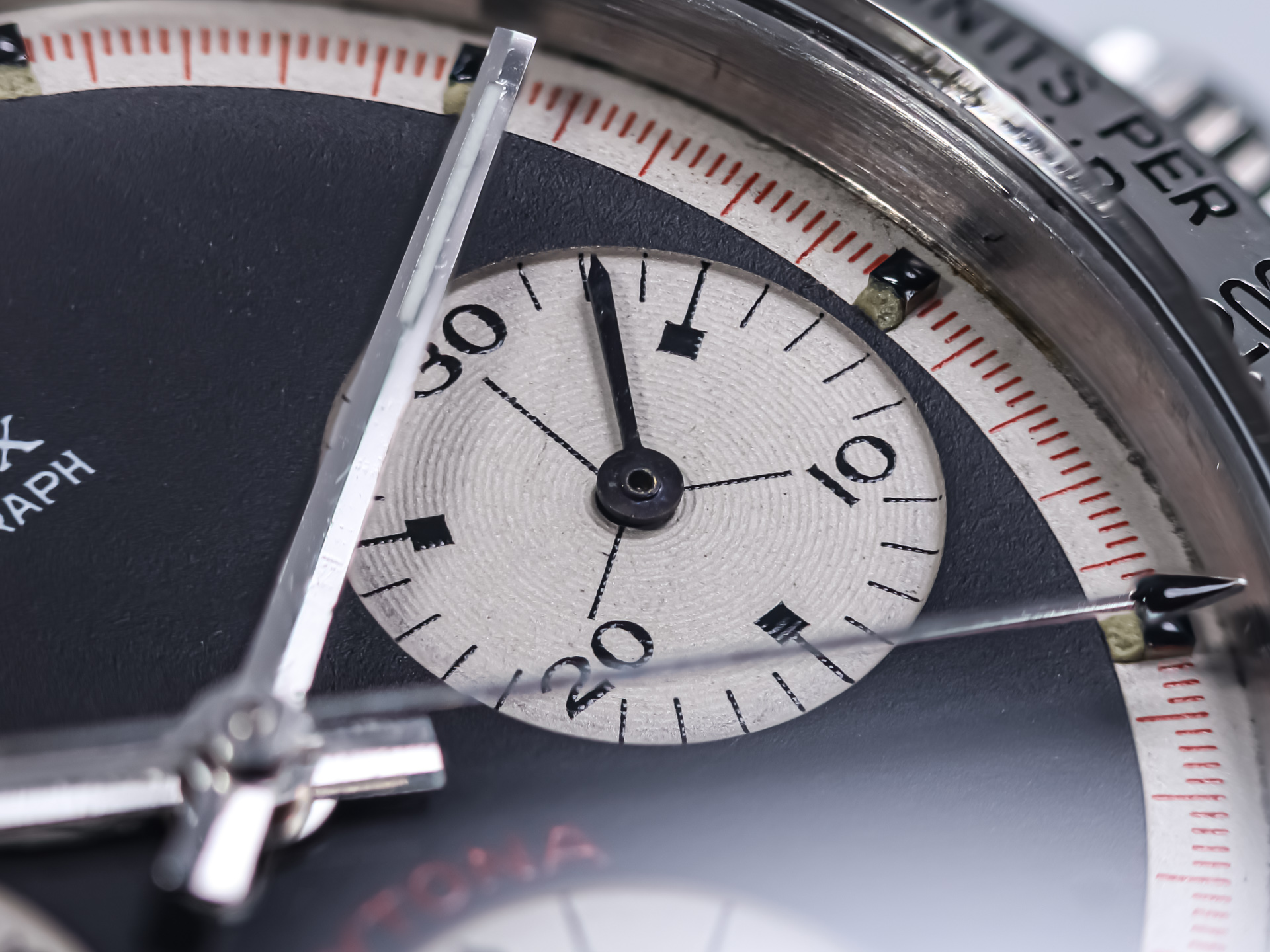 The watch is fitted with the legendary black/white/red exotic tritium dial, distinguished by its contrasting sub-dials, square-ended markers, and unique period typography — elements that define the Paul Newman configuration and elevate it to legendary status. Over time, the tritium luminous material has aged gracefully, developing a warm, even patina that enhances the watch’s vintage character and desirability.