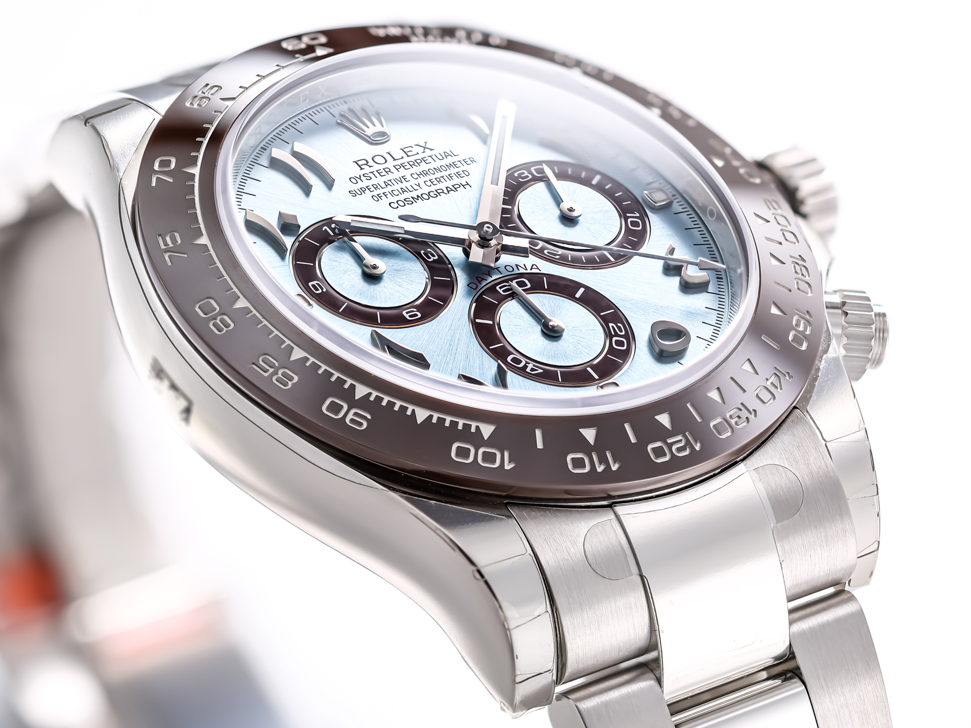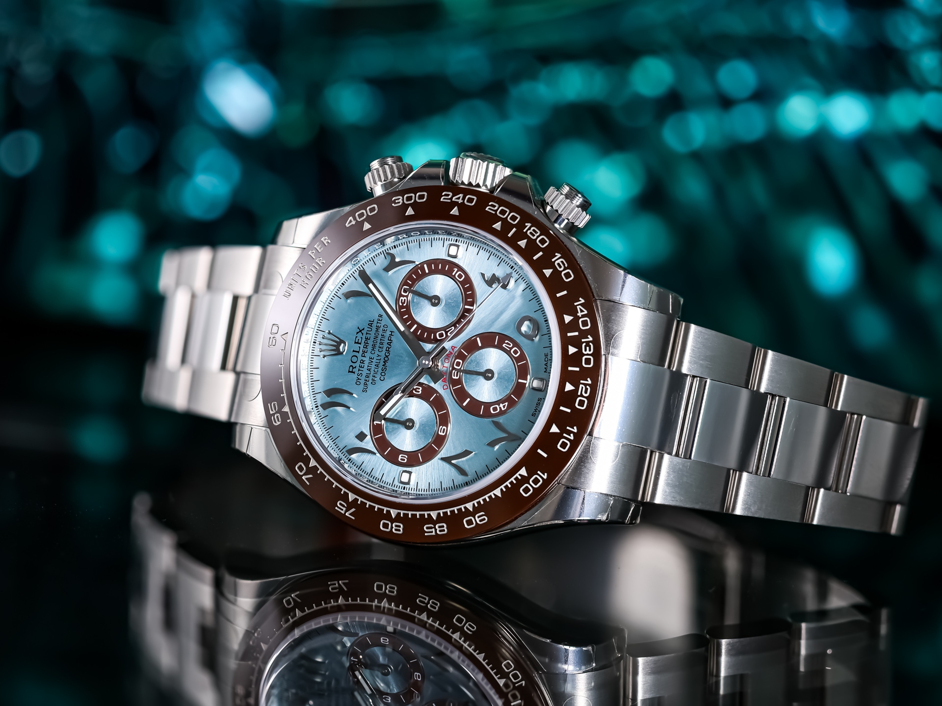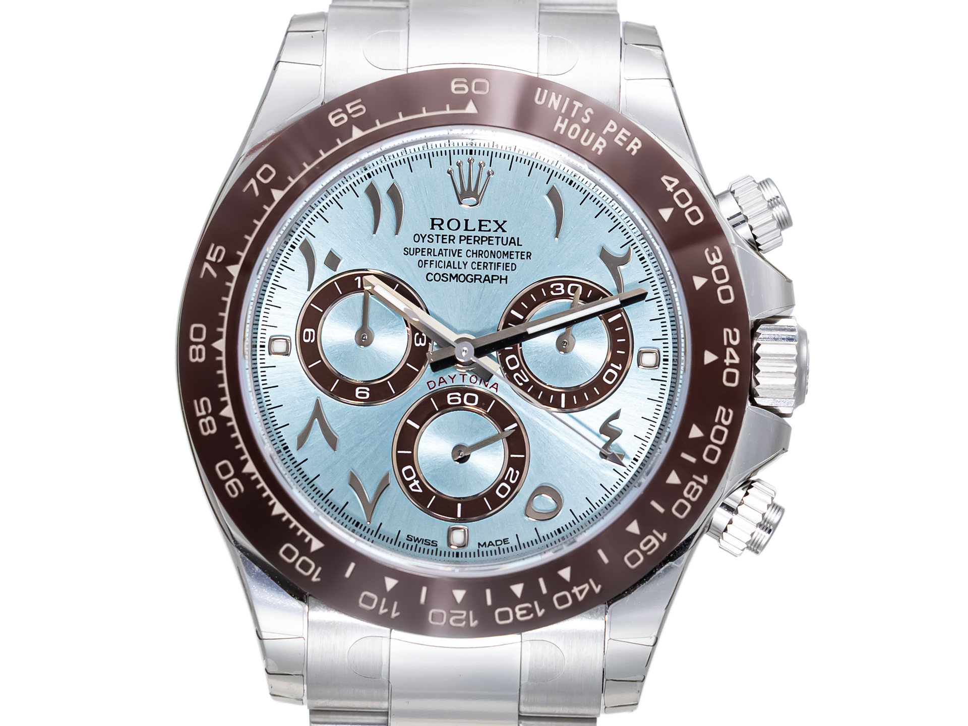 The mesmerizing Ice Blue dial, long associated with Rolex platinum models, is elevated even further by the rare Arabic numeral hour markers, adding depth, legibility, and a touch of refined Eastern elegance. The contrasting chestnut brown Cerachrom bezel complements the cool blue tones with perfect harmony, creating one of the most striking and luxurious color combinations in the entire Daytona range.