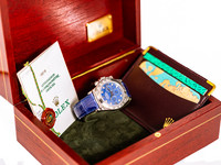 The true highlight is the breathtaking Sodalite dial: a natural stone composition displaying deep, “jeans blue” tones beautifully enhanced by factory-set diamond hour markers. Each Sodalite dial is unique due to its natural variations, giving this watch an unmistakable, one-of-a-kind presence rarely encountered on the market today.