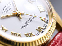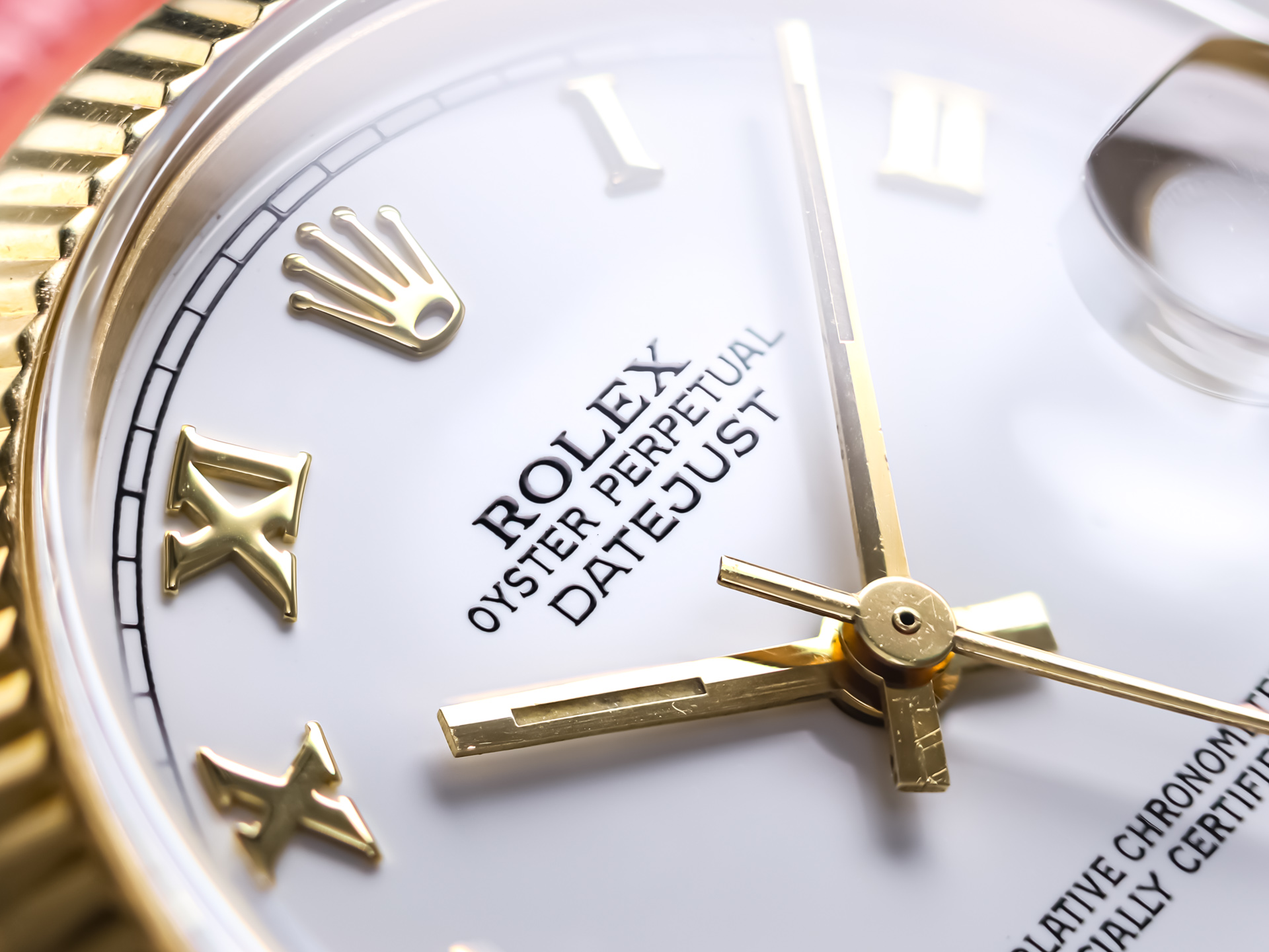 The crisp white dial is adorned with applied Roman numerals, creating a distinguished and timeless aesthetic. The contrast between the warm yellow gold case and the clean white dial lends the watch exceptional visual balance, while the classic Datejust layout with date aperture at 3 o’clock ensures both functionality and elegance. The overall presentation is understated yet unmistakably luxurious.