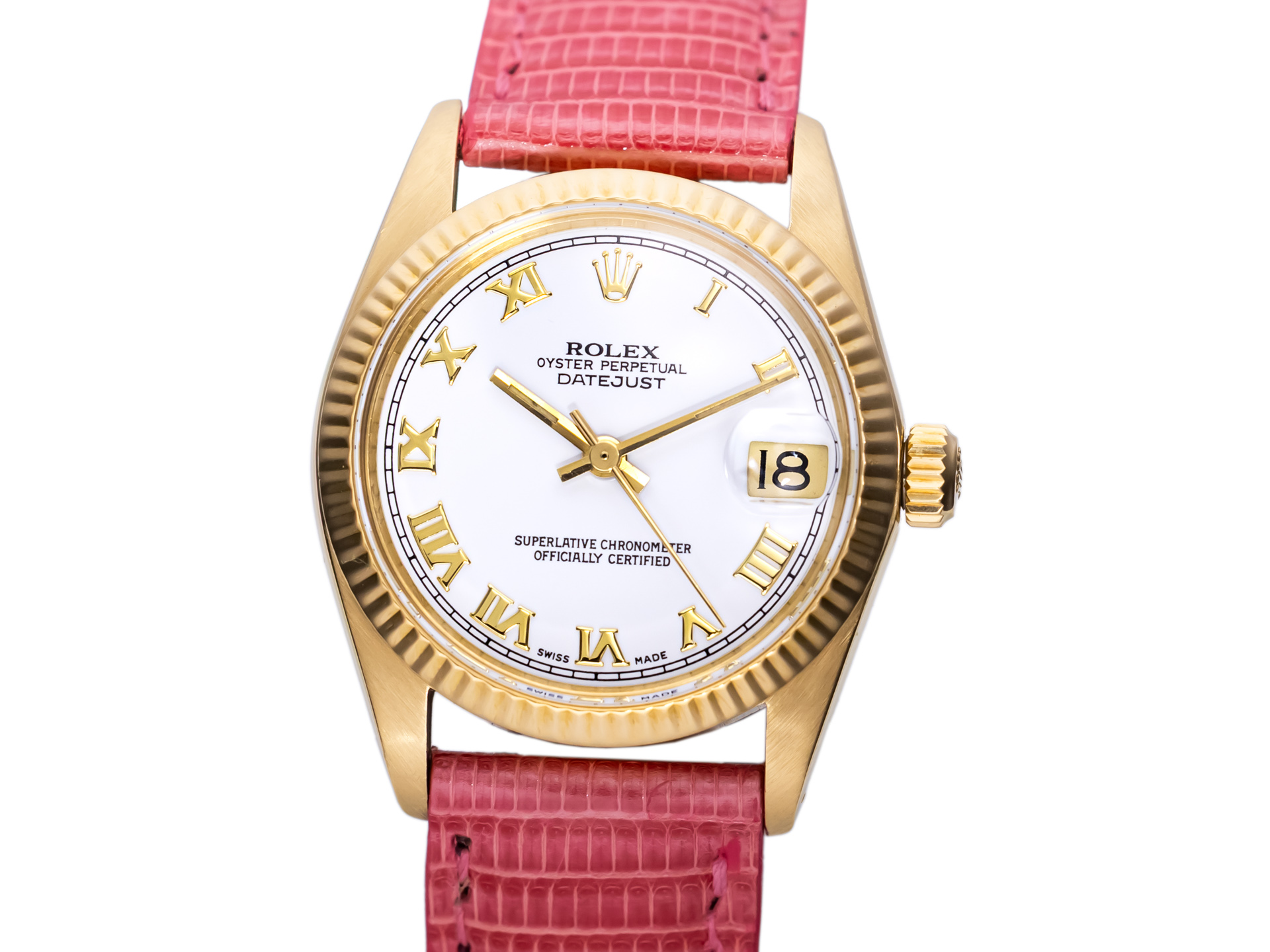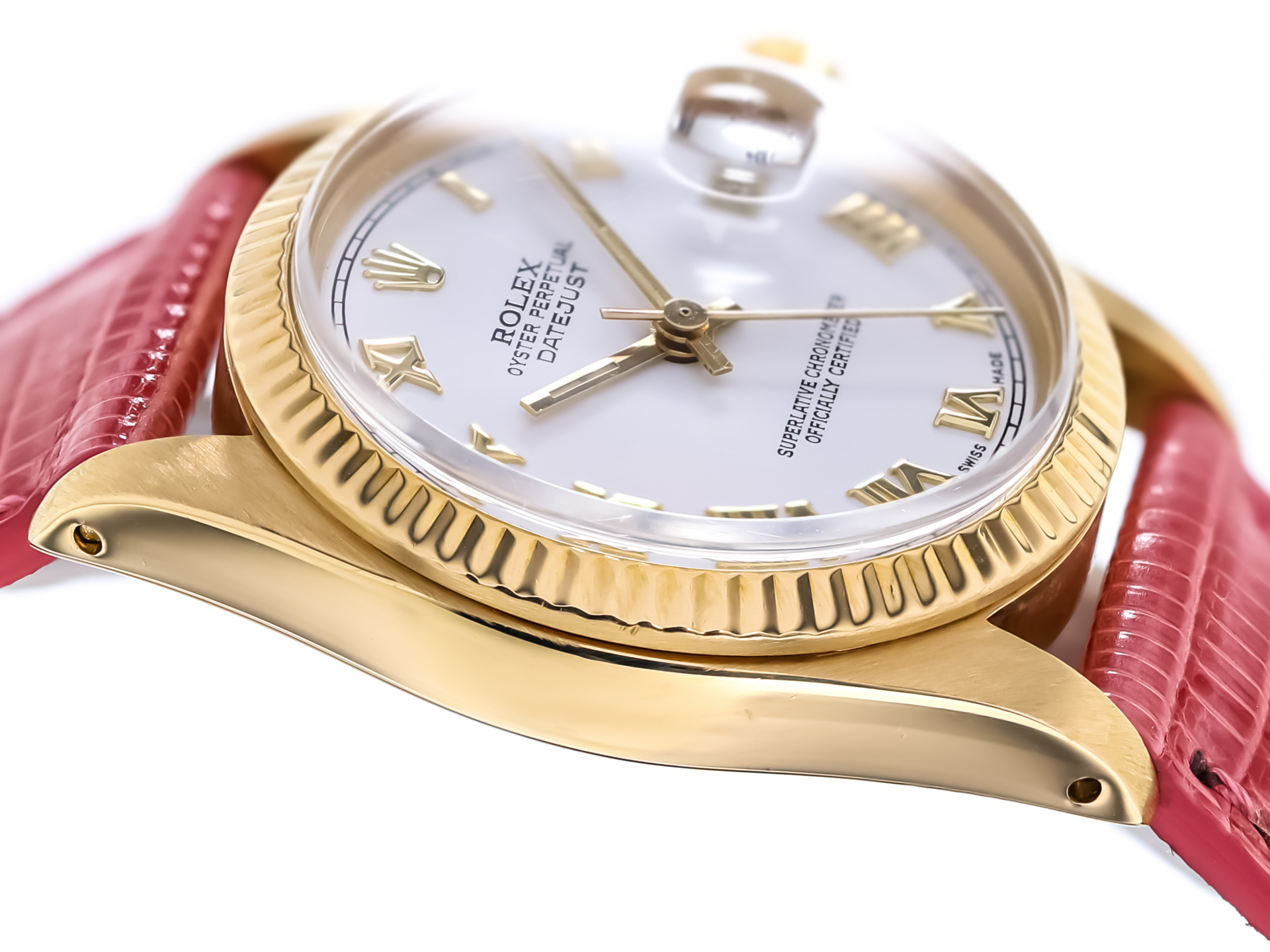 Rolex Vintage Datejust Medium – Ref. 6827 – 18k Yellow Gold – White Roman Dial – Pink Lizard Strap – 1981