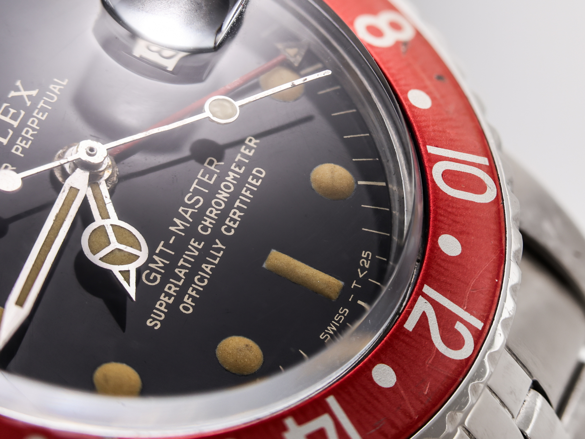 The black glossy gilt dial, with its warm patina and glossy finishtogether with the luminous tritium hour markers and hands. Over time, the tritium has aged beautifully, adding depth and individuality to the watch while preserving its vintage charm. Still also has got the original small GMT hand build in.