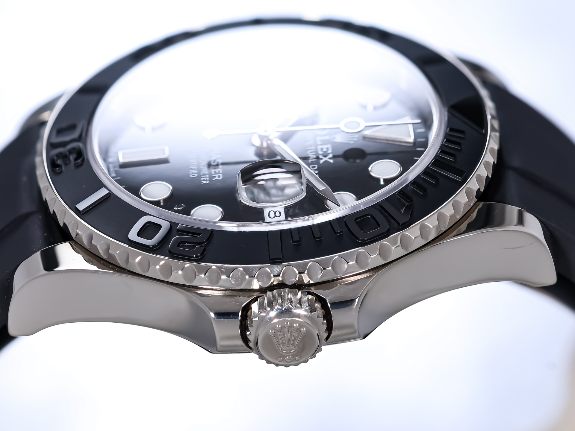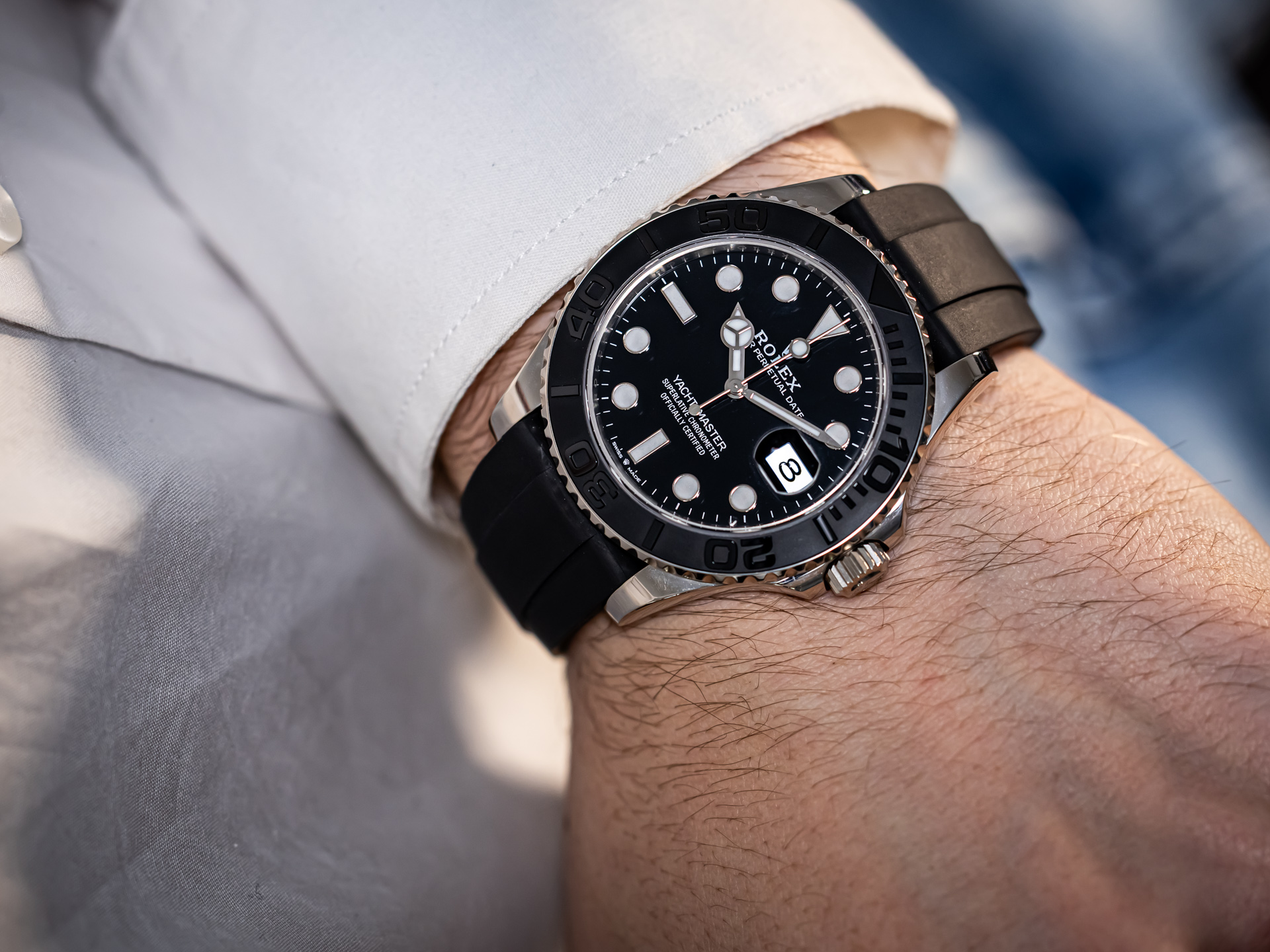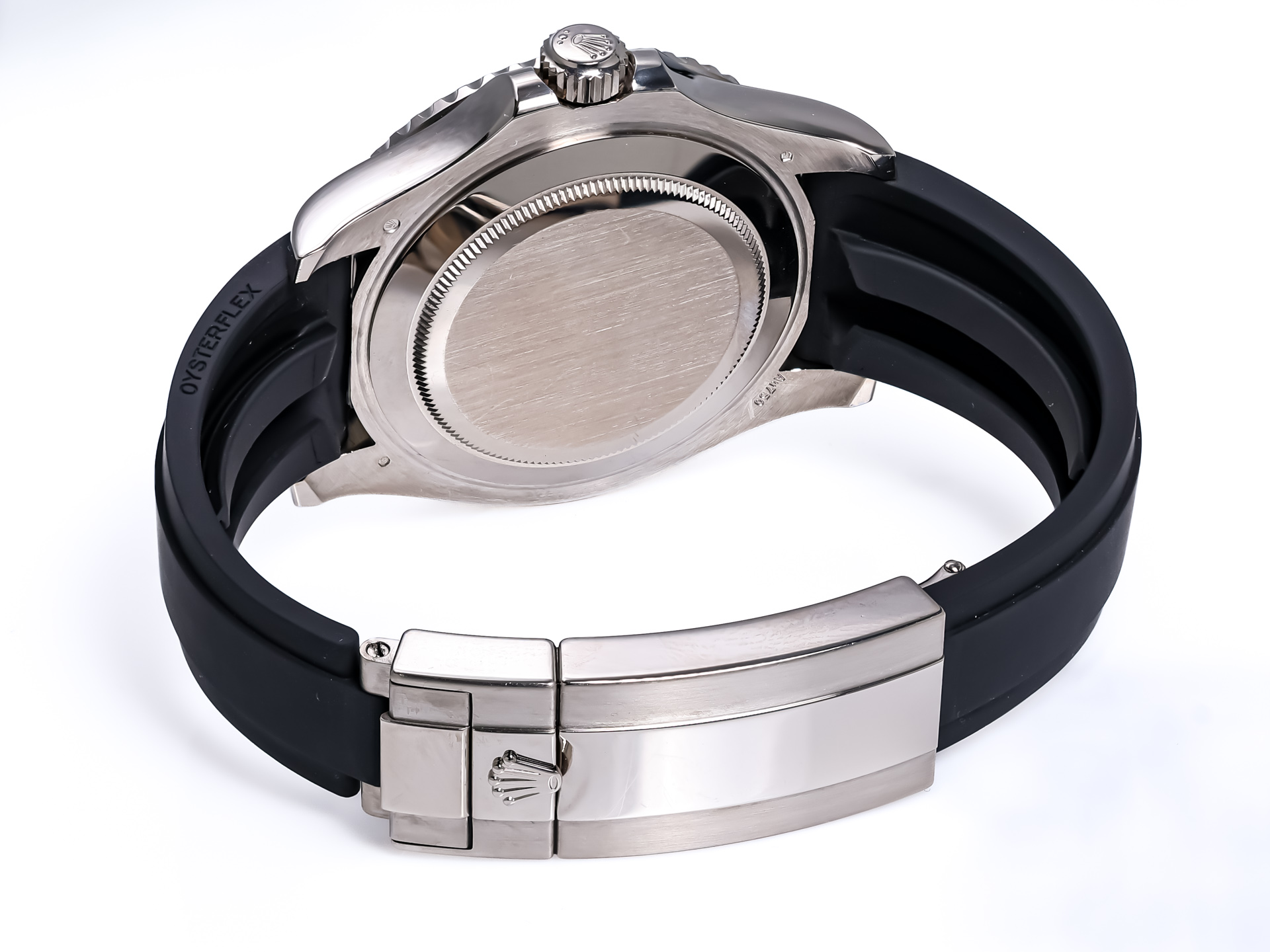 Paired with Rolex’s Oysterflex rubber strap, this Yacht-Master achieves the perfect fusion of sport and luxury. Internally reinforced with a flexible metal blade and secured by an 18k white gold Oysterlock folding clasp, the strap delivers exceptional comfort, stability, and elegance.