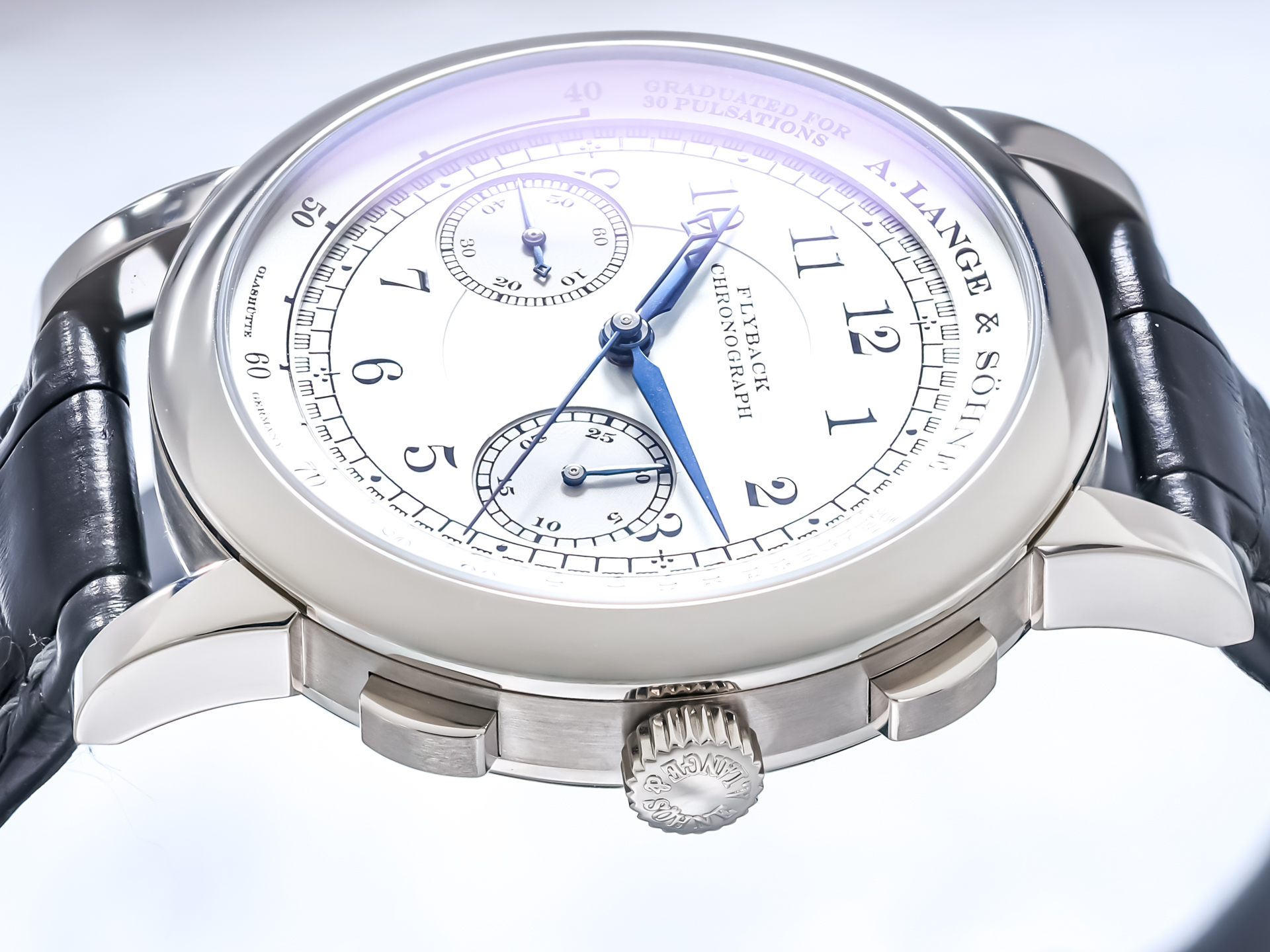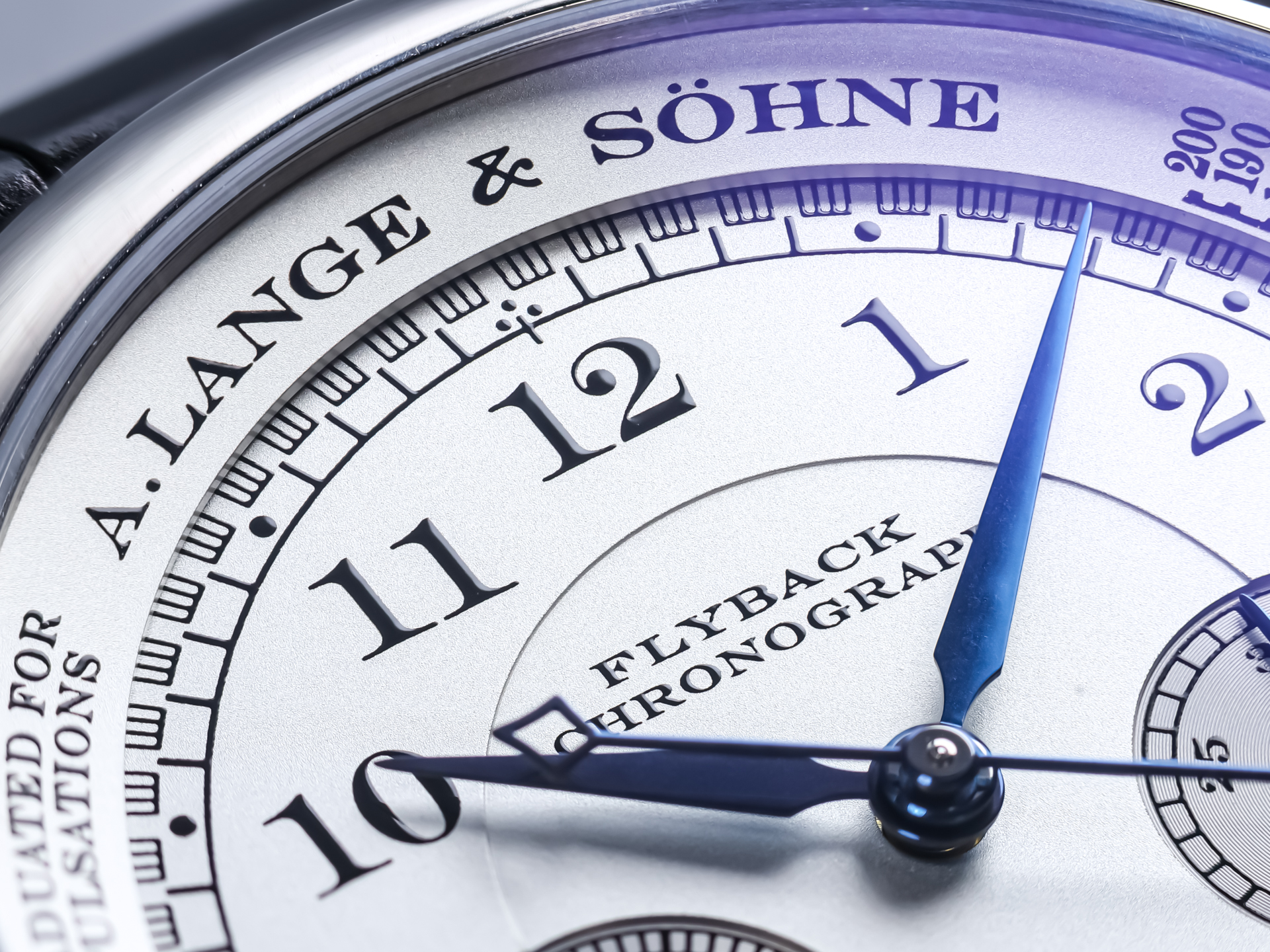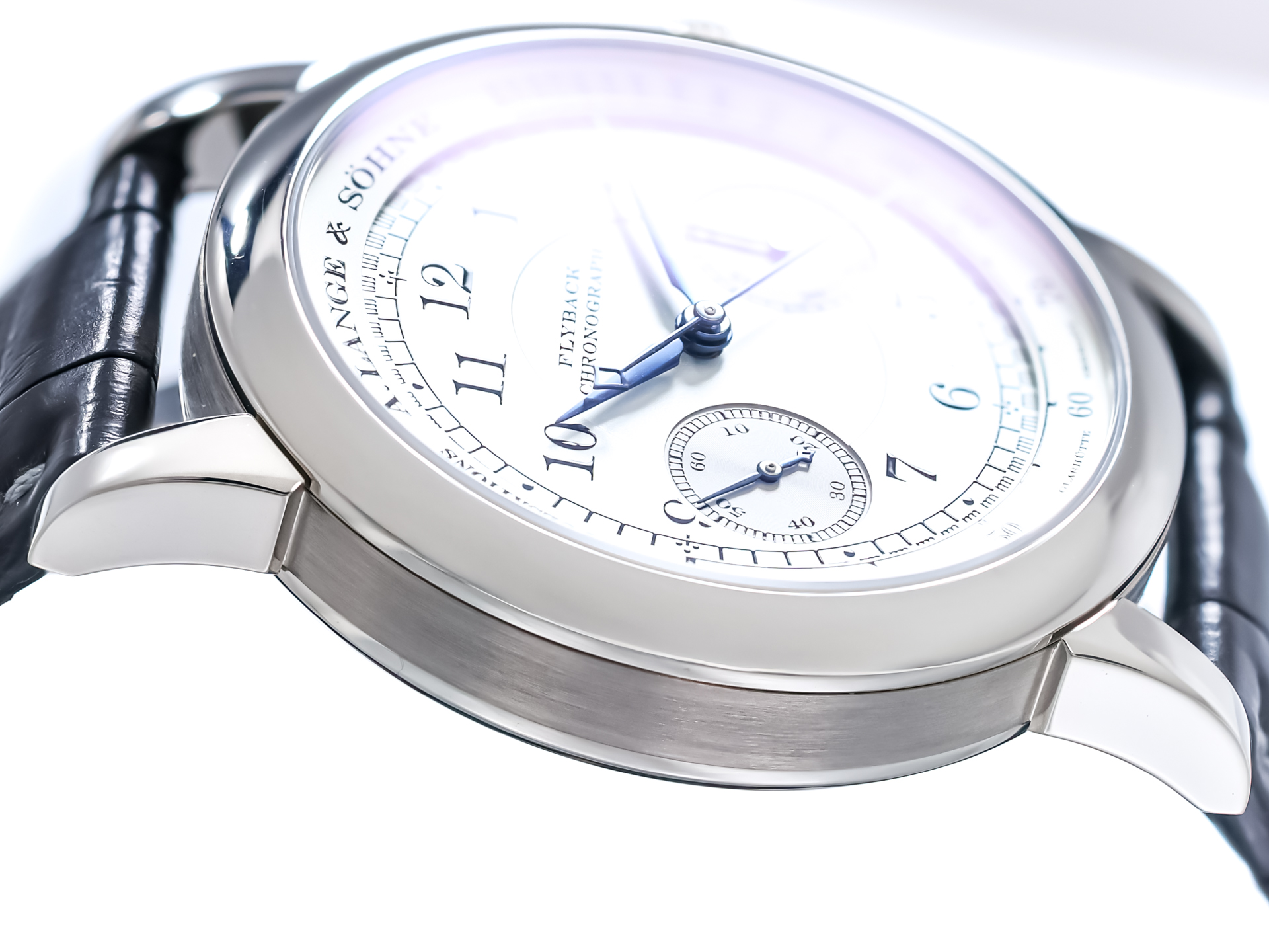 The dial is a masterpiece of clarity and symmetry, featuring Arabic numerals, railway minute track, and perfectly proportioned chronograph subdials. The blued steel hands provide a striking contrast, enhancing both legibility and aesthetic harmony—hallmarks of A. Lange & Söhne’s design philosophy.