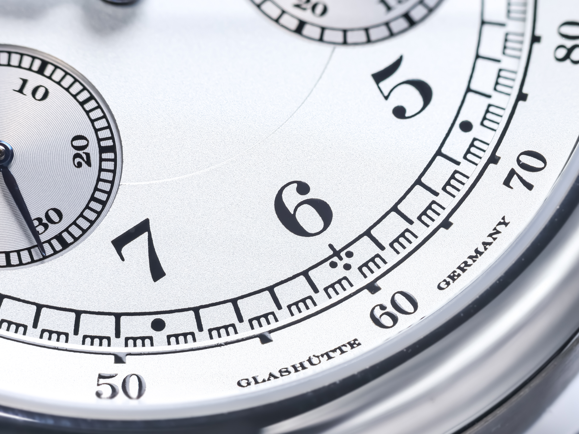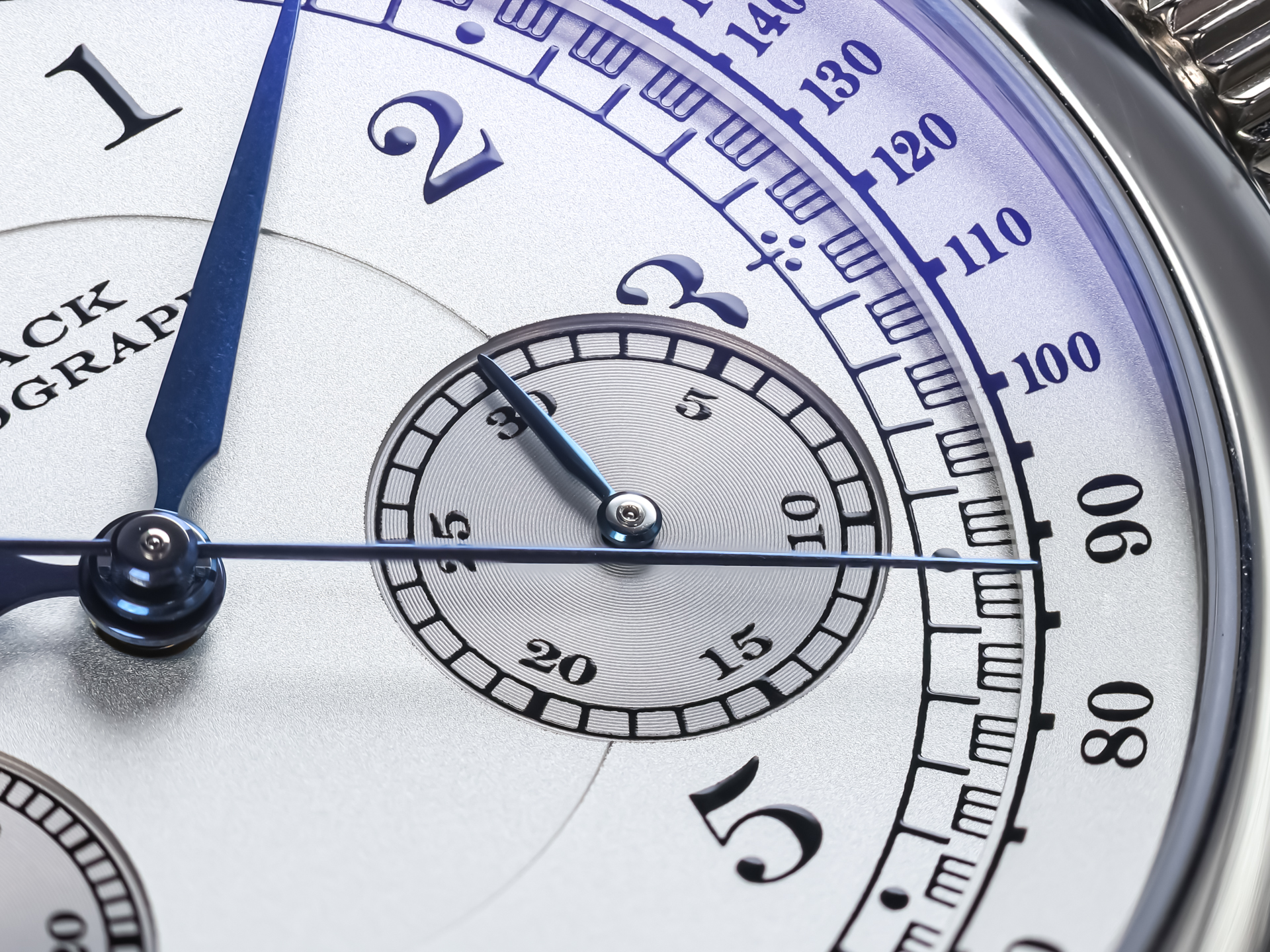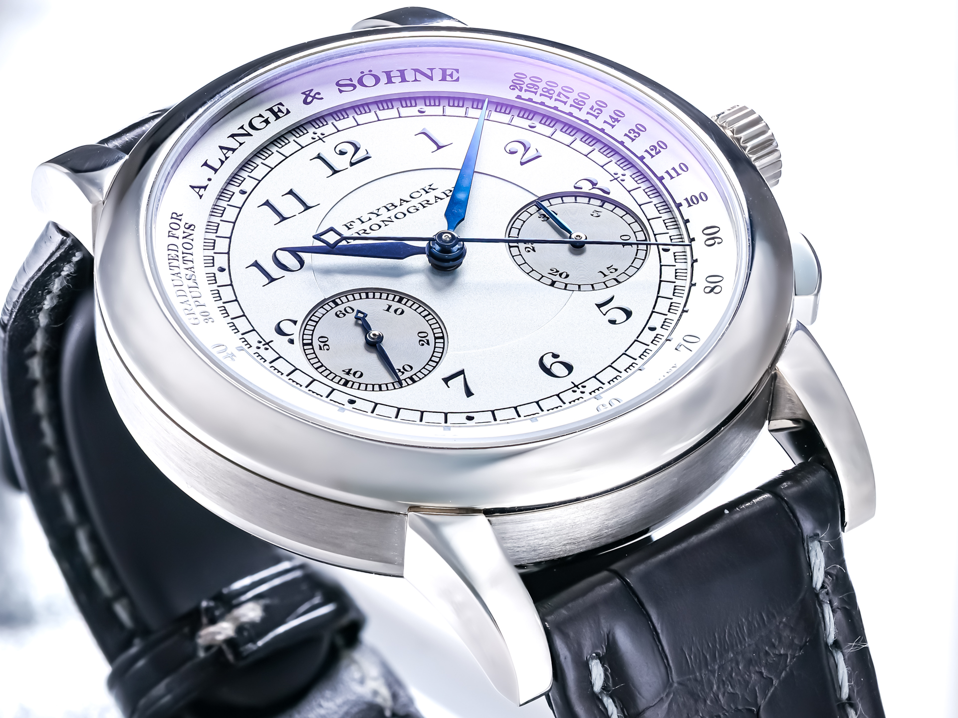 The dial is a masterpiece of clarity and symmetry, featuring Arabic numerals, railway minute track, and perfectly proportioned chronograph subdials. The blued steel hands provide a striking contrast, enhancing both legibility and aesthetic harmony—hallmarks of A. Lange & Söhne’s design philosophy.