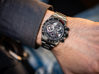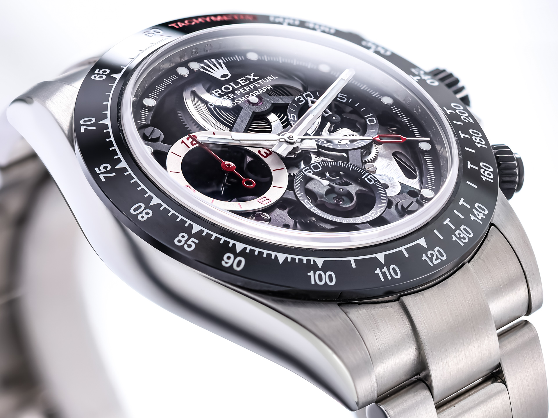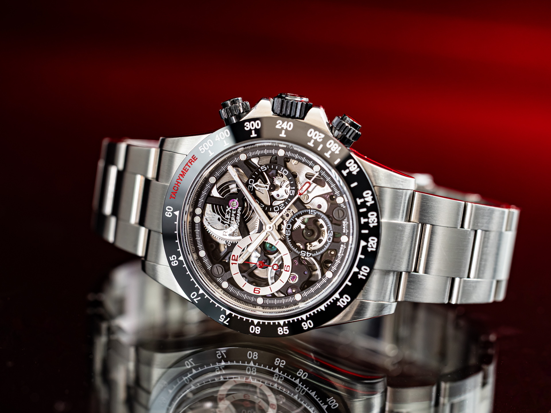 The stainless steel Daytona case is meticulously reworked by Artisan de Genève, preserving the iconic proportions of the Cosmograph while elevating the finish with refined hand-applied detailing. The watch is distinguished by its openworked dial, revealing the movement beneath and creating a dynamic, three-dimensional aesthetic inspired by motorsport engineering and mechanical transparency.
