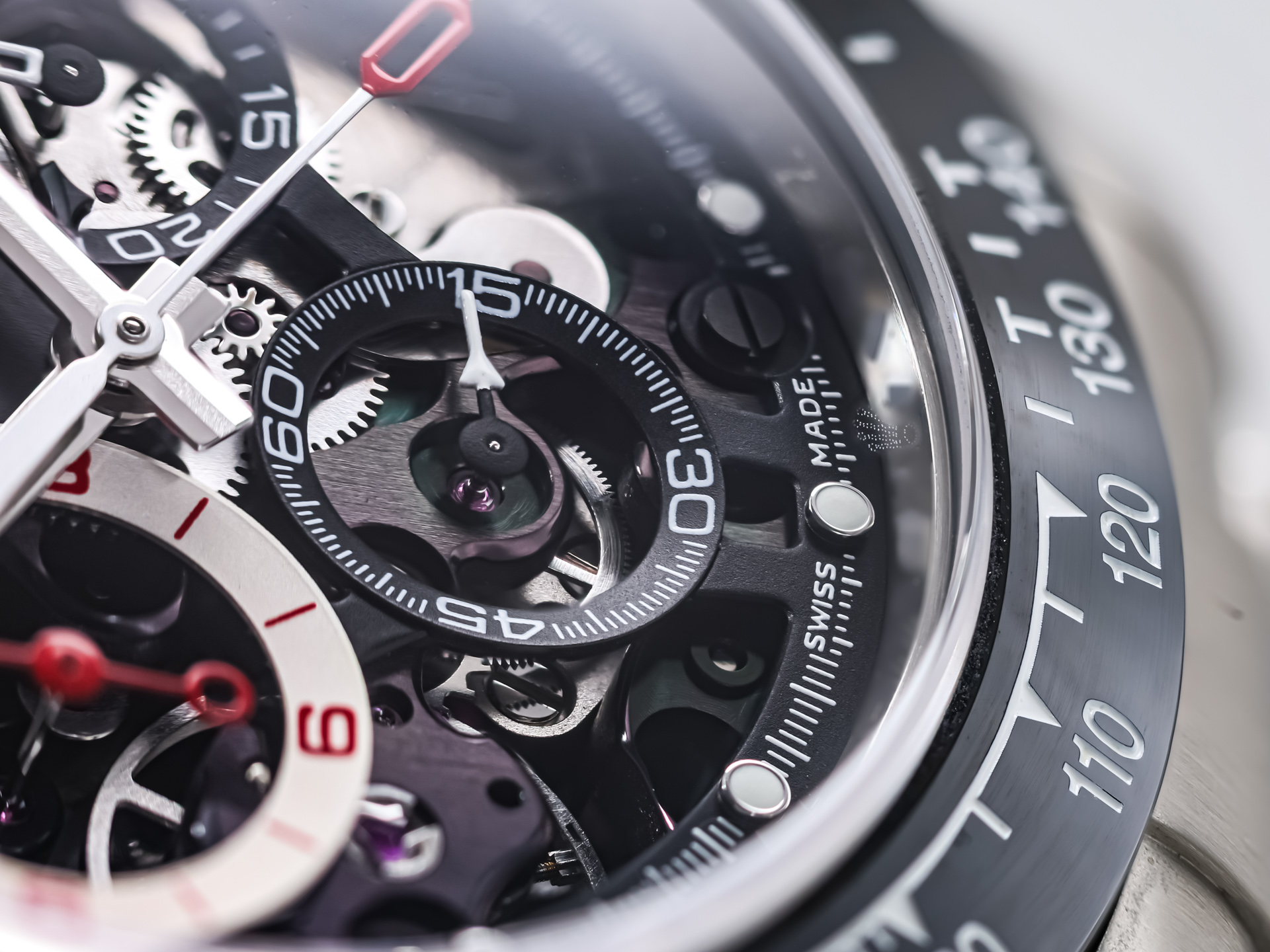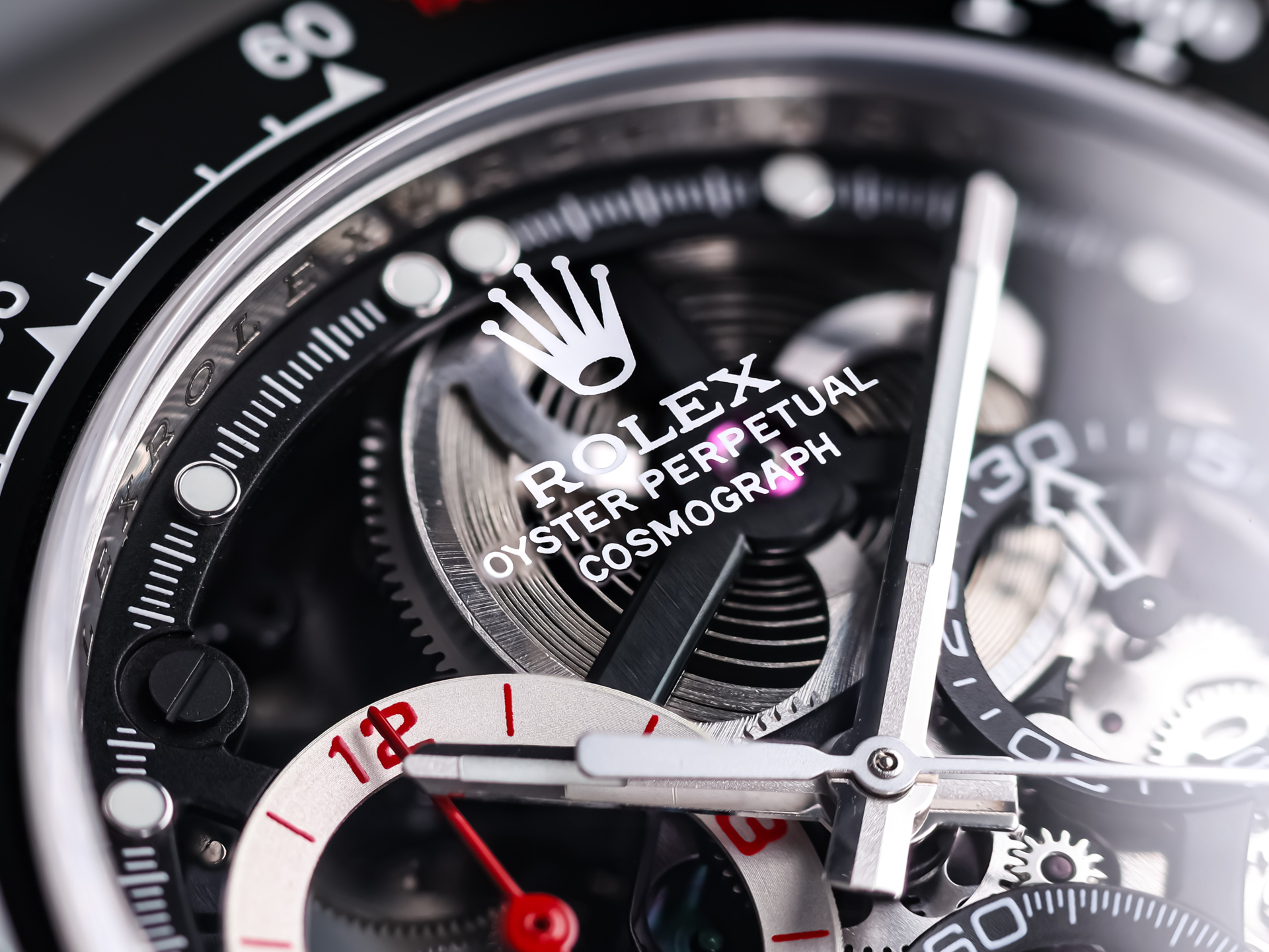 At the heart of the watch lies the Rolex automatic chronograph caliber, fully skeletonized, hand-finished, and reassembled by Artisan de Genève. Every component is carefully decorated using traditional haute horlogerie techniques, transforming the movement into a visual centerpiece while maintaining the legendary reliability and performance of the Daytona platform.