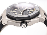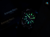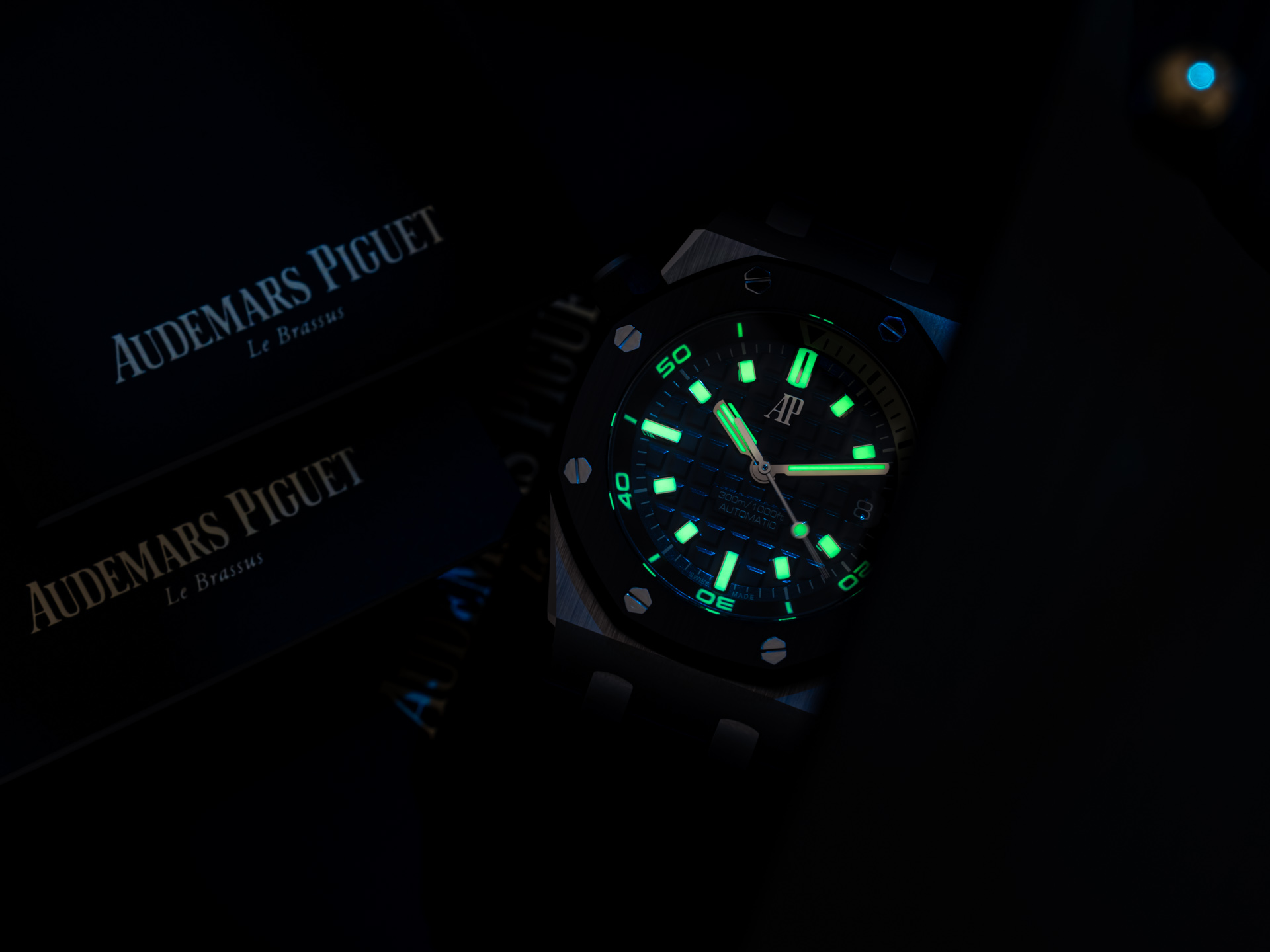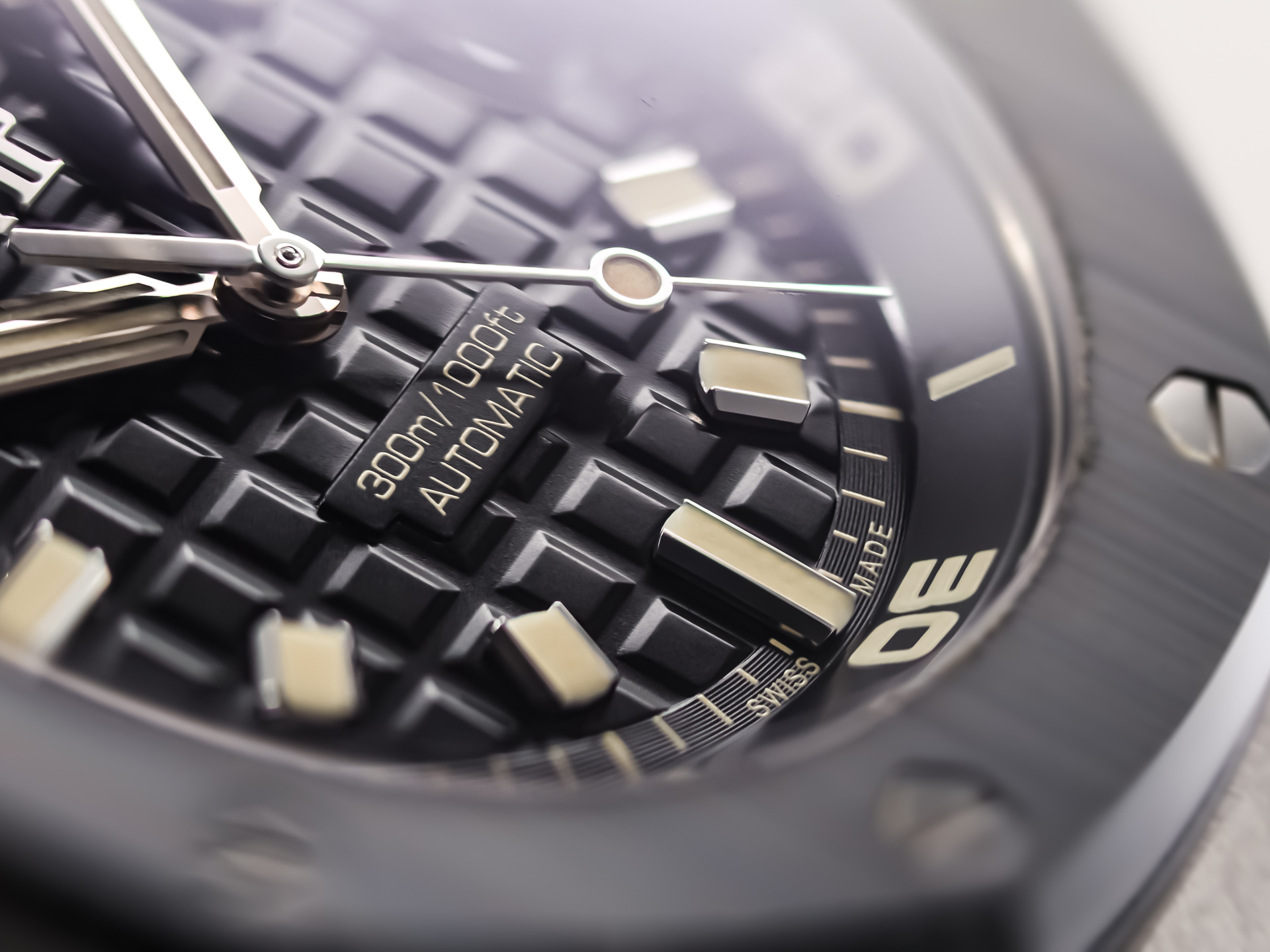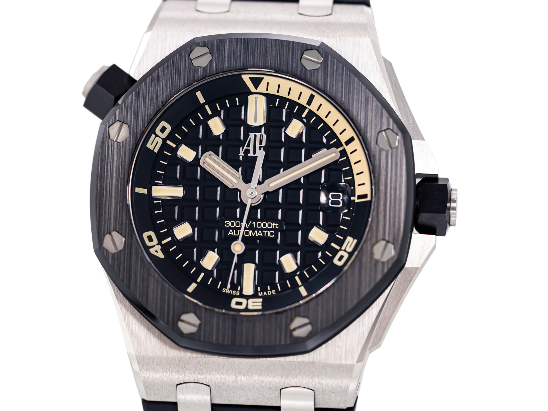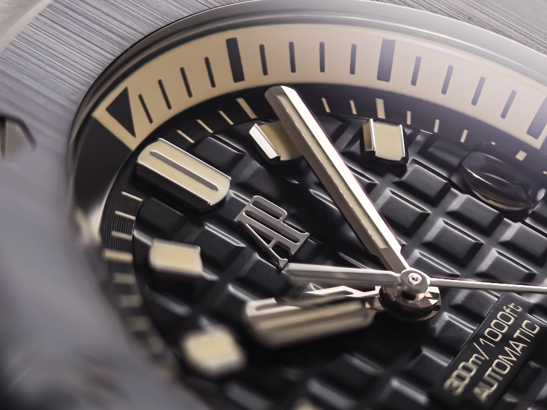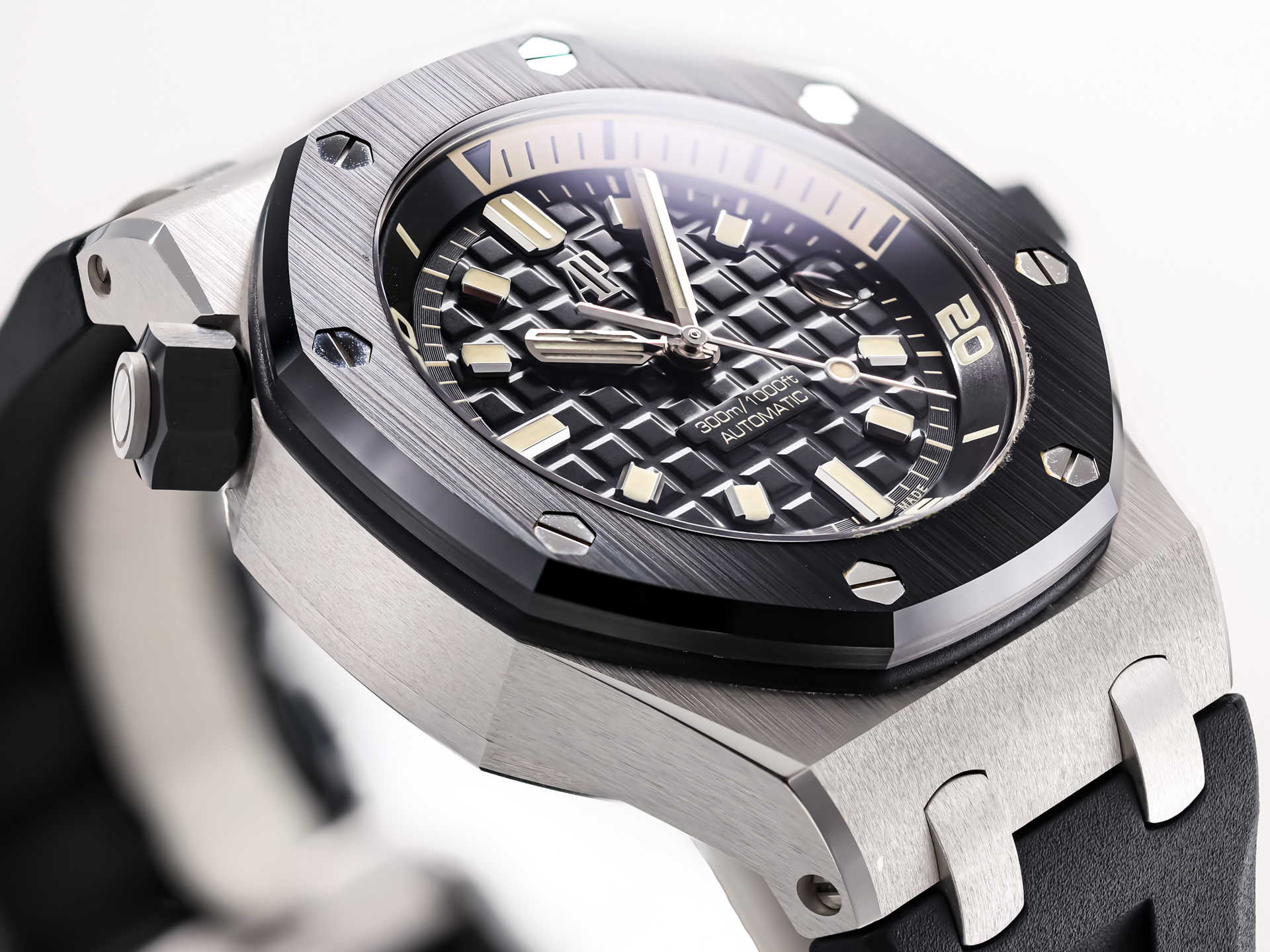 Measuring 42mm in diameter, this Royal Oak Offshore Diver is a bold yet refined expression of the Offshore line, featuring the signature “Méga Tapisserie” black dial with luminescent white gold hour markers and hands. The internal rotating dive bezel is operated via the crown at 10 o’clock, preserving water resistance while ensuring legibility and functionality under demanding conditions.