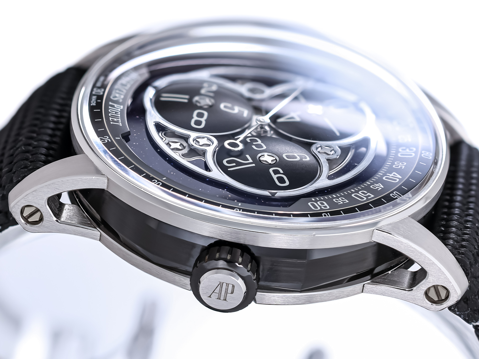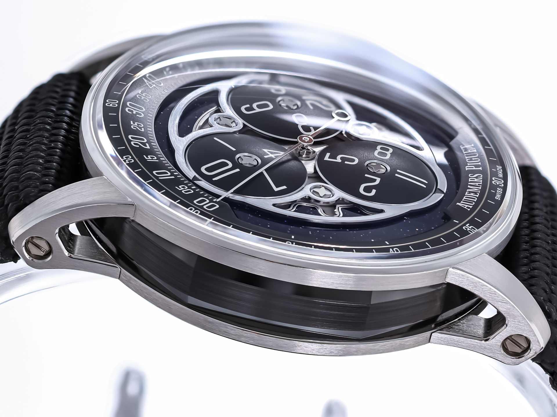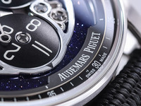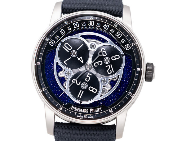 The true centerpiece of this watch is its extraordinary blue aventurine glass dial, which provides a mesmerizing, starry backdrop reminiscent of a night sky. This luminous surface enhances depth and visual drama while showcasing Audemars Piguet’s exceptional mastery of materials and finishing.
