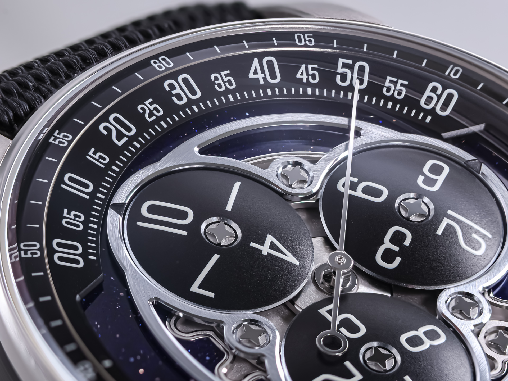 Displayed against this aventurine dial is a contemporary interpretation of the historic “wandering hours” complication, known here as the Star Wheel. Three black aluminum discs with PVD coating rotate smoothly around a central star-shaped wheel. Each disc carries hour numerals that “wander” across the dial, aligning precisely with the minute track to indicate the current hour. The result is a dynamic, almost celestial display of time that is both intuitive and captivating to observe.