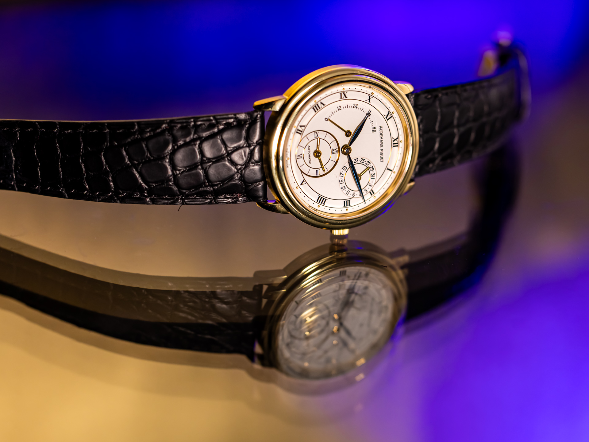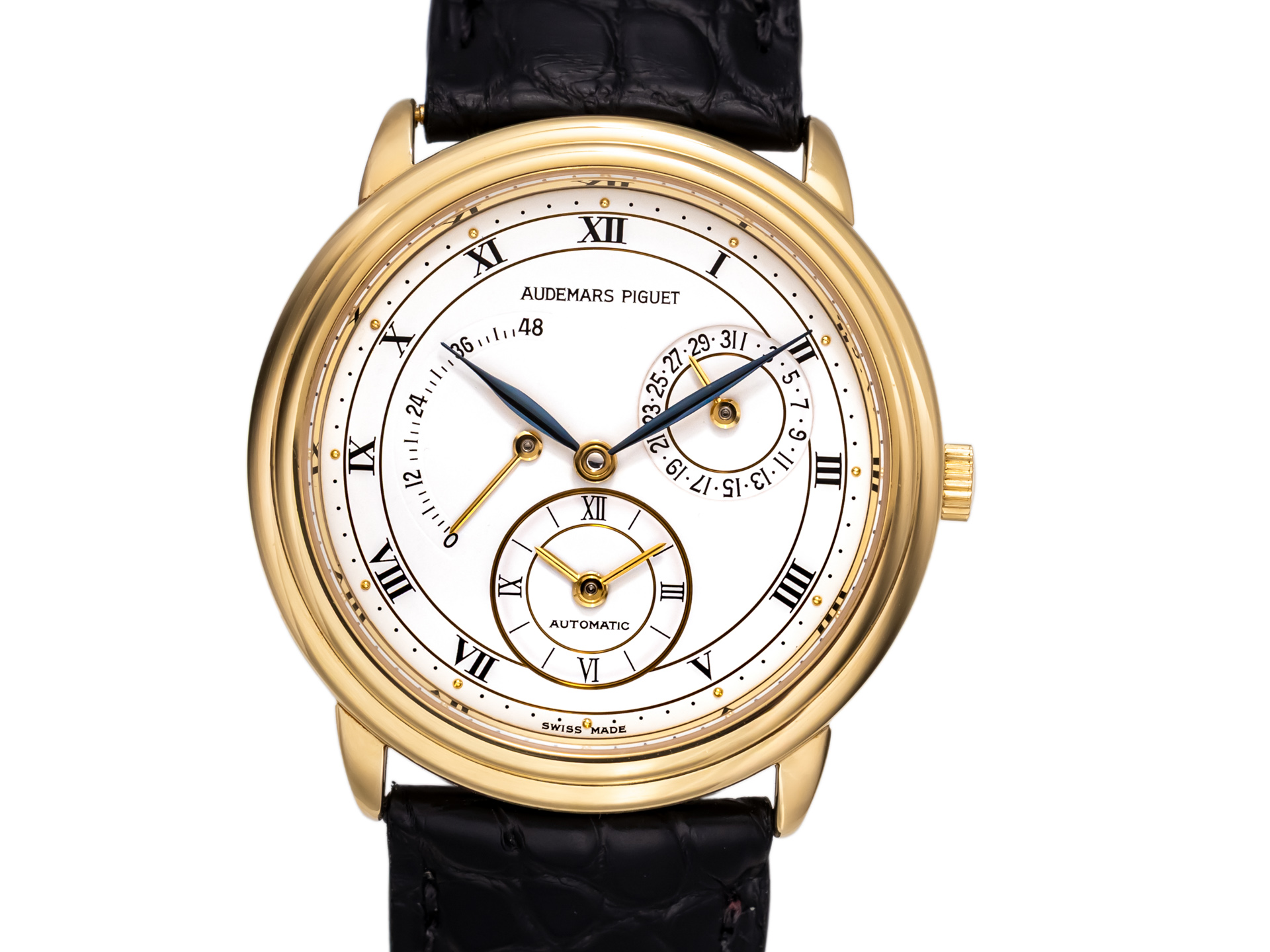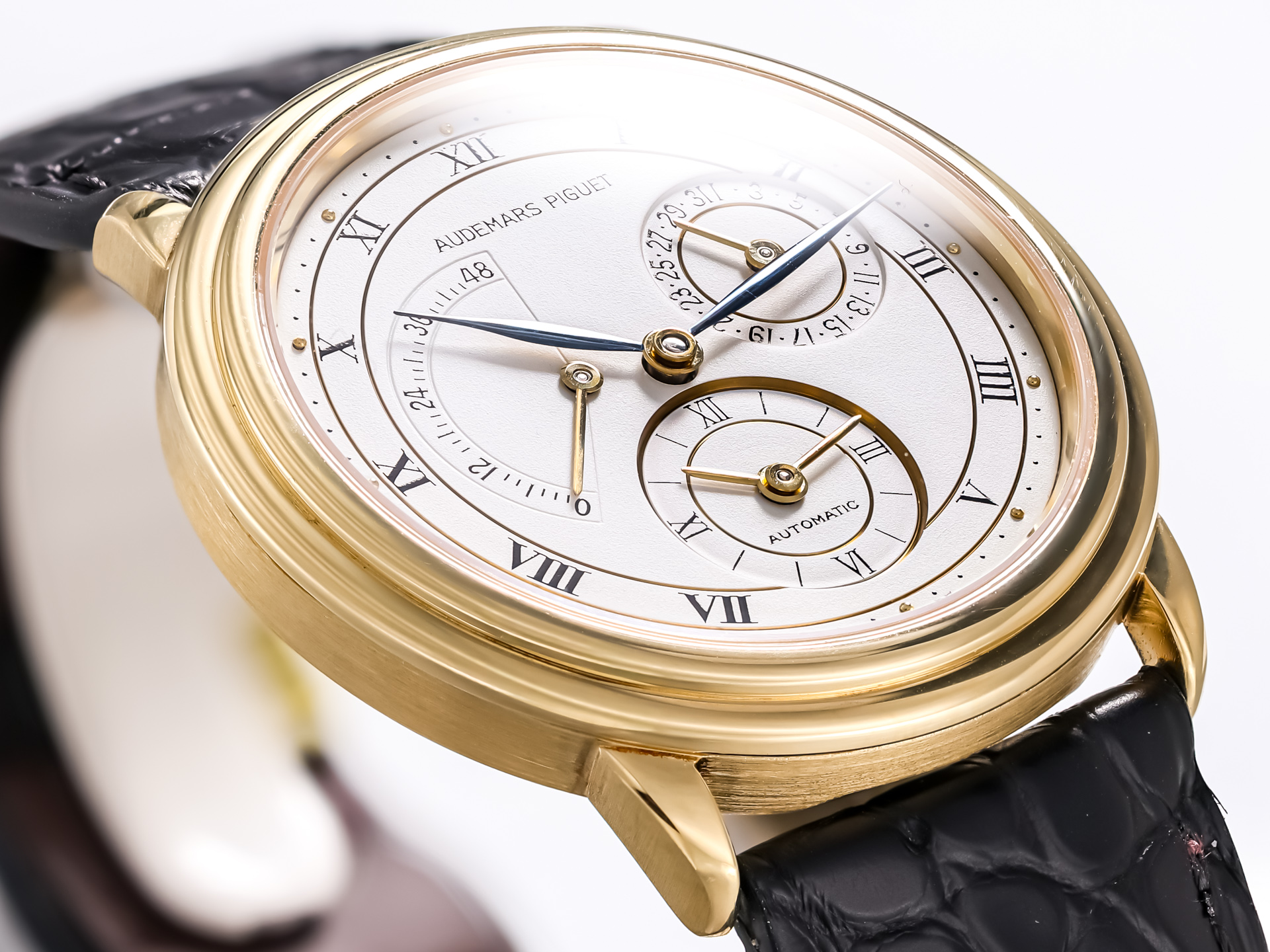 This neo-vintage Audemars Piguet Jules Audemars Dual Time, reference 25685BA, is a refined expression of classic haute horlogerie from the early 1990s. Crafted in solid 18K yellow gold and equipped with a black crocodile leather strap with its original 18k yellow gold pin buckle, the watch embodies the understated elegance and technical sophistication that define the Jules Audemars collection.