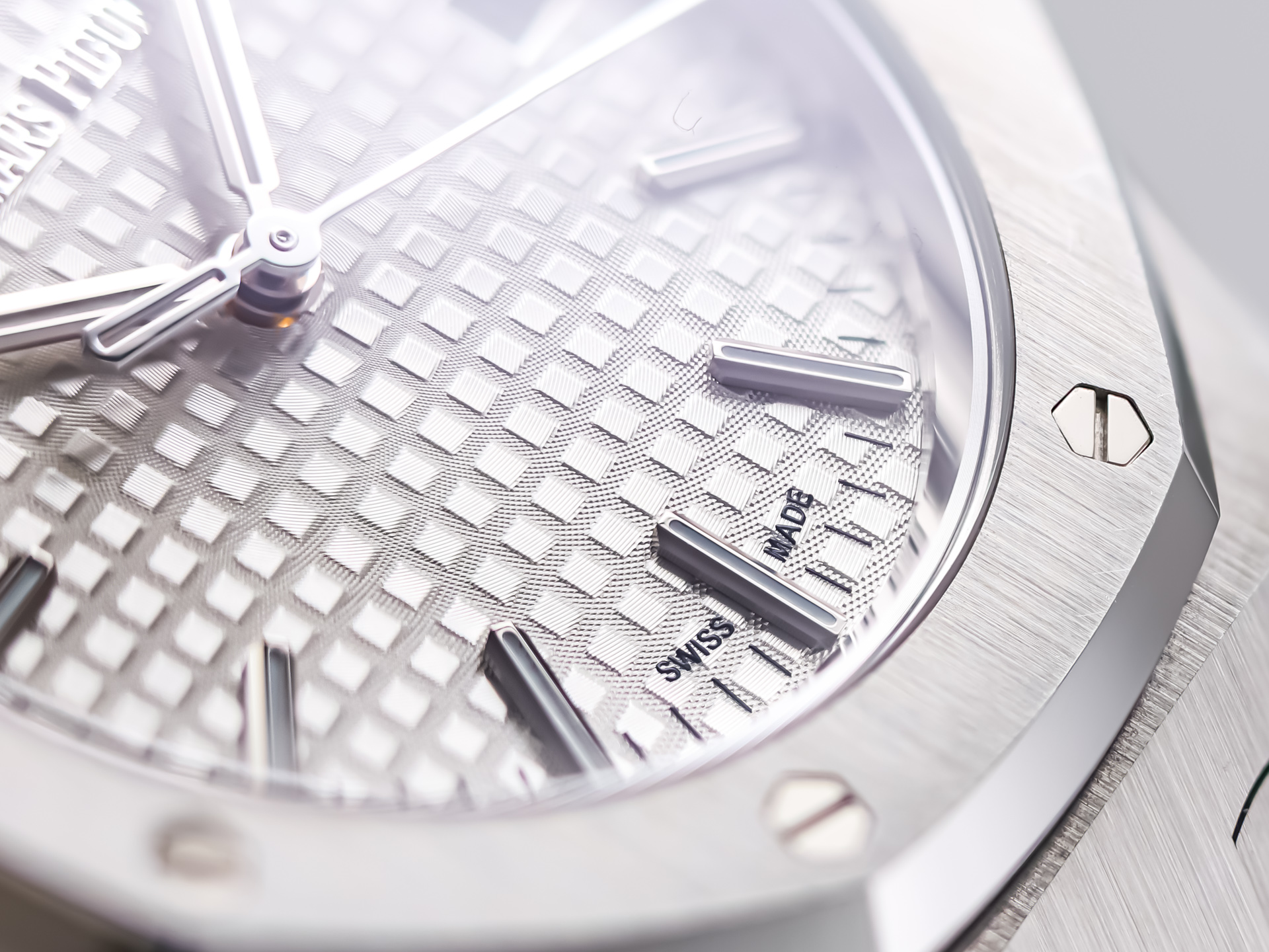 The watch features the perfectly balanced 37 mm stainless steel Royal Oak case, an ideal size offering exceptional versatility and wearability. The iconic octagonal bezel with exposed hexagonal screws, combined with the brand’s renowned satin-brushed and polished finishing, showcases Audemars Piguet’s uncompromising craftsmanship.