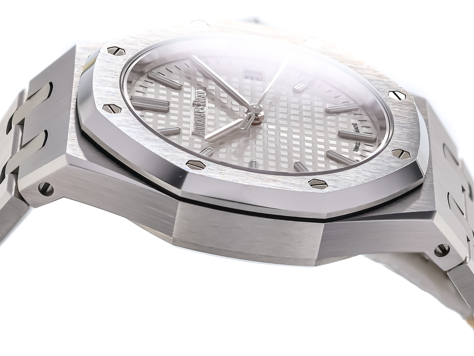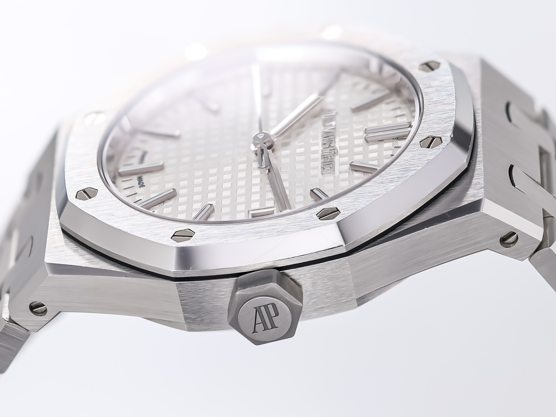 Powering the watch is the Audemars Piguet calibre 5900, an automatic in-house movement offering excellent precision, reliability, and a power reserve of approximately 60 hours. The integrated stainless steel Royal Oak bracelet, with its beautifully finished links and secure folding clasp, delivers outstanding comfort and a seamless fit on the wrist.