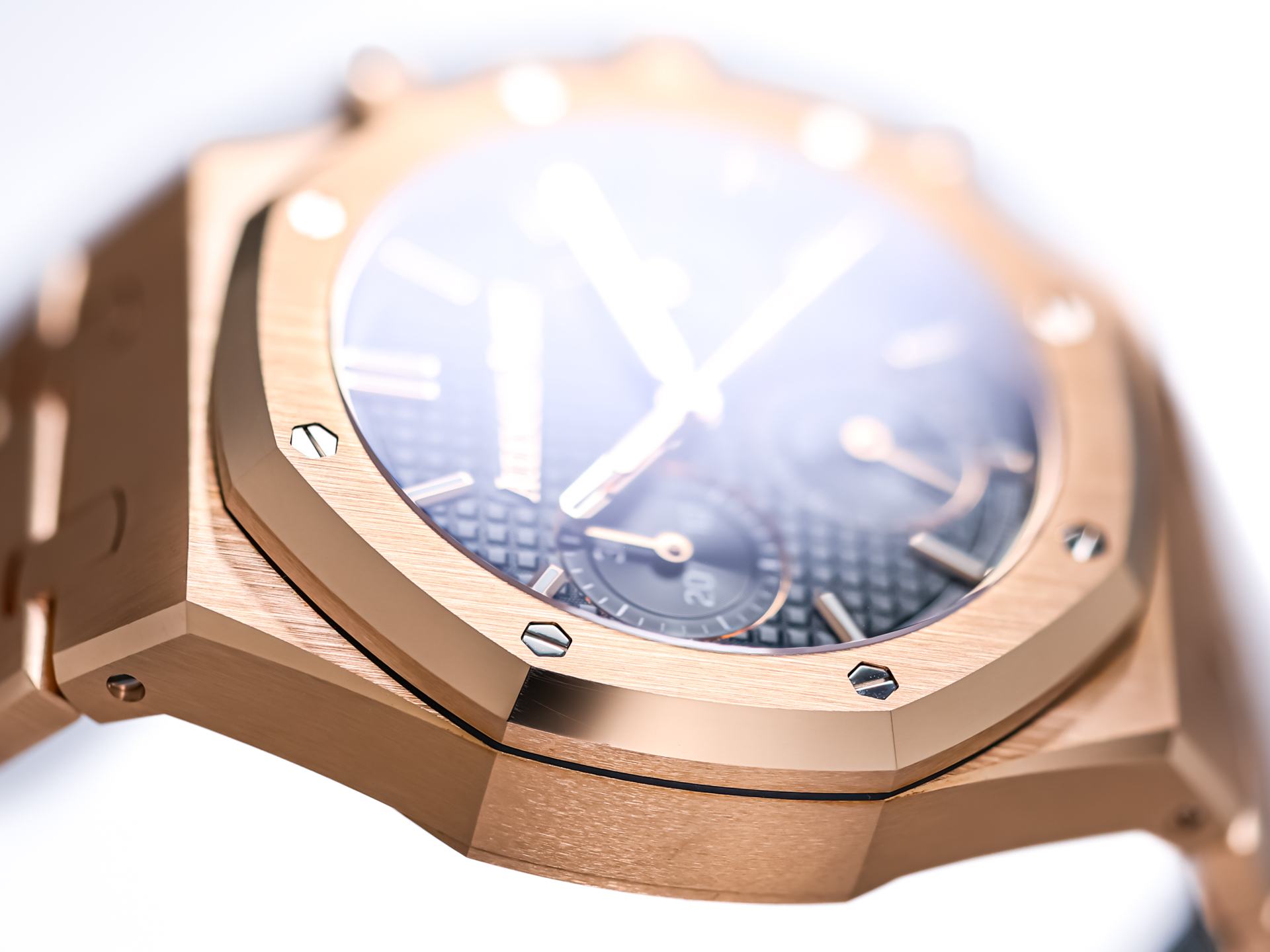 The 41mm case showcases the unmistakable Royal Oak design, originally created by Gérald Genta. Its signature octagonal bezel with exposed screws, combined with the beautifully integrated bracelet, creates a bold and instantly recognizable silhouette. The warm tone of the rose gold enhances the watch’s presence, offering a perfect balance of sportiness and elegance.
