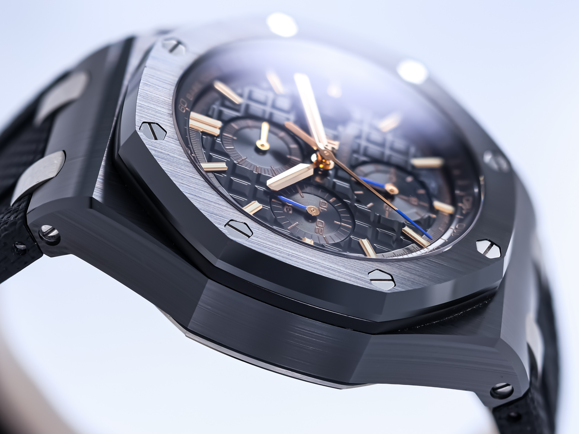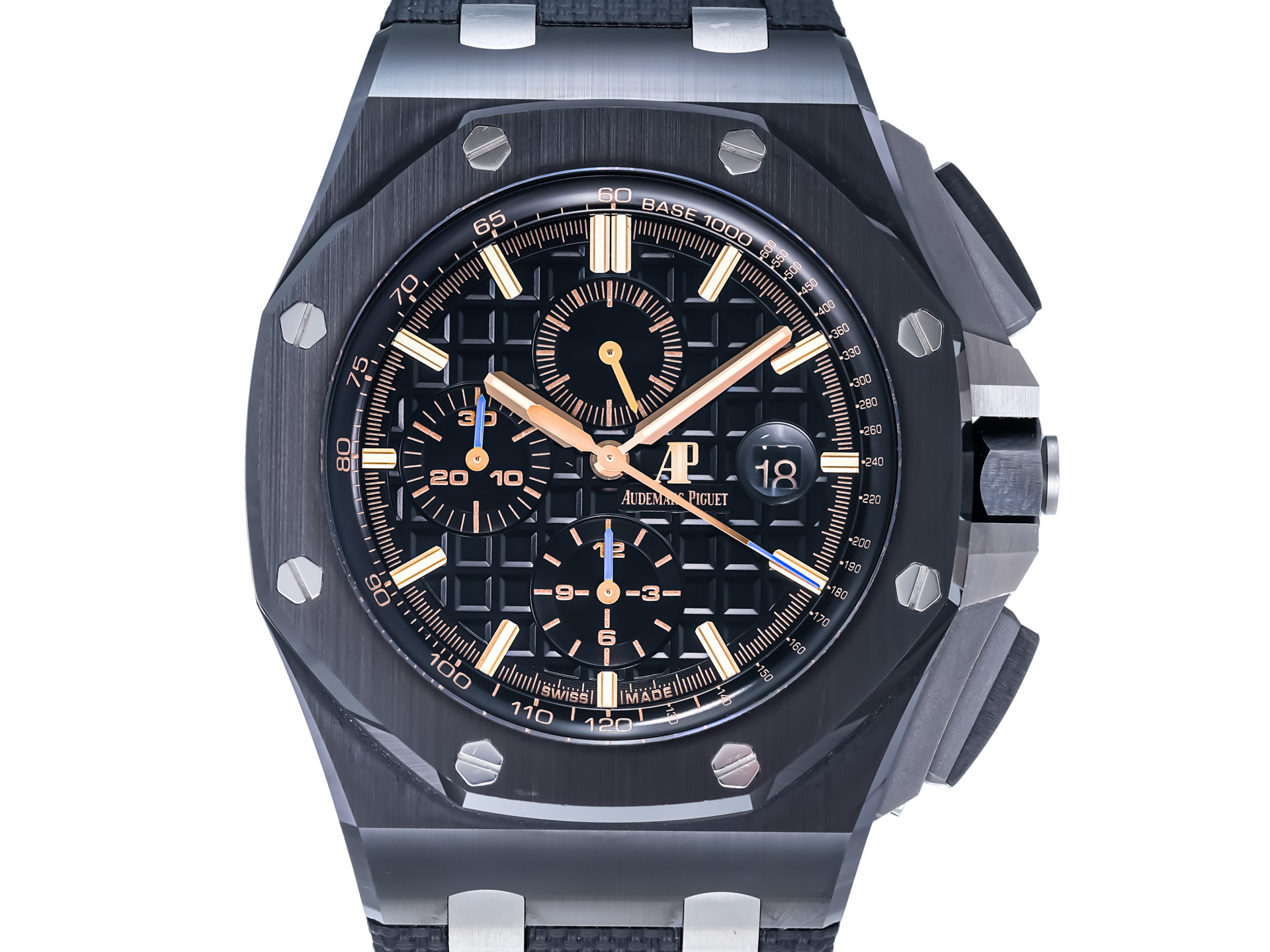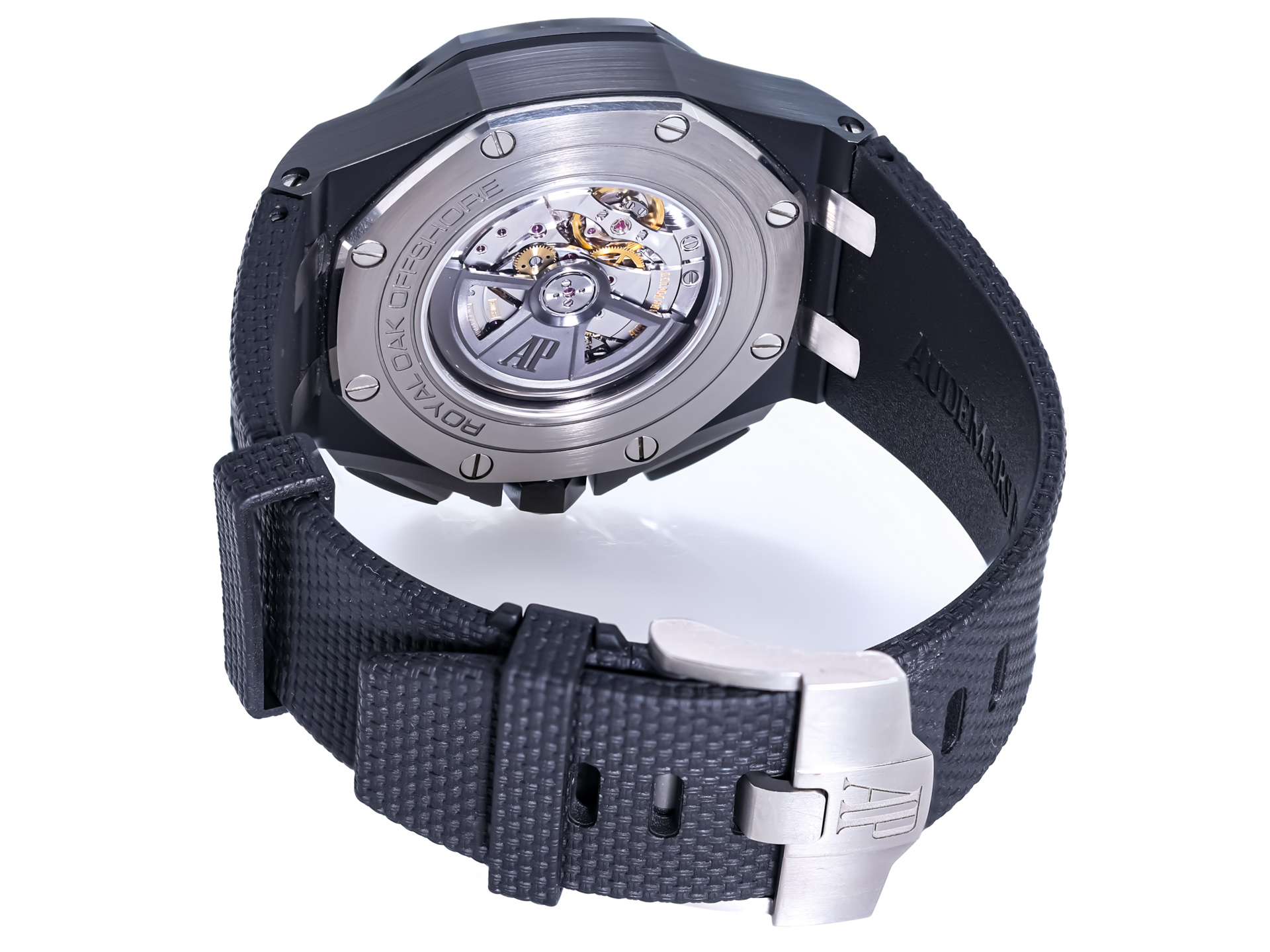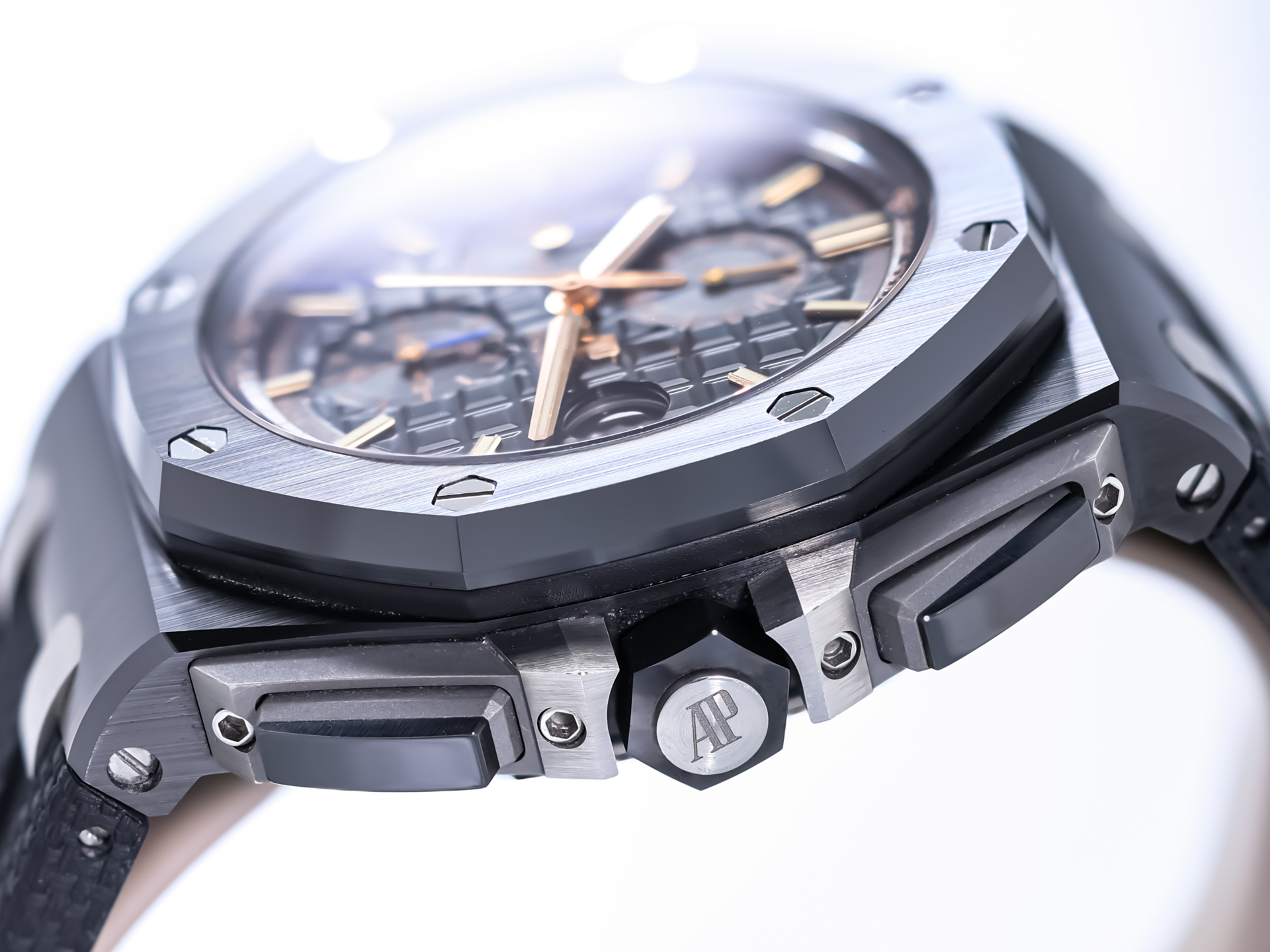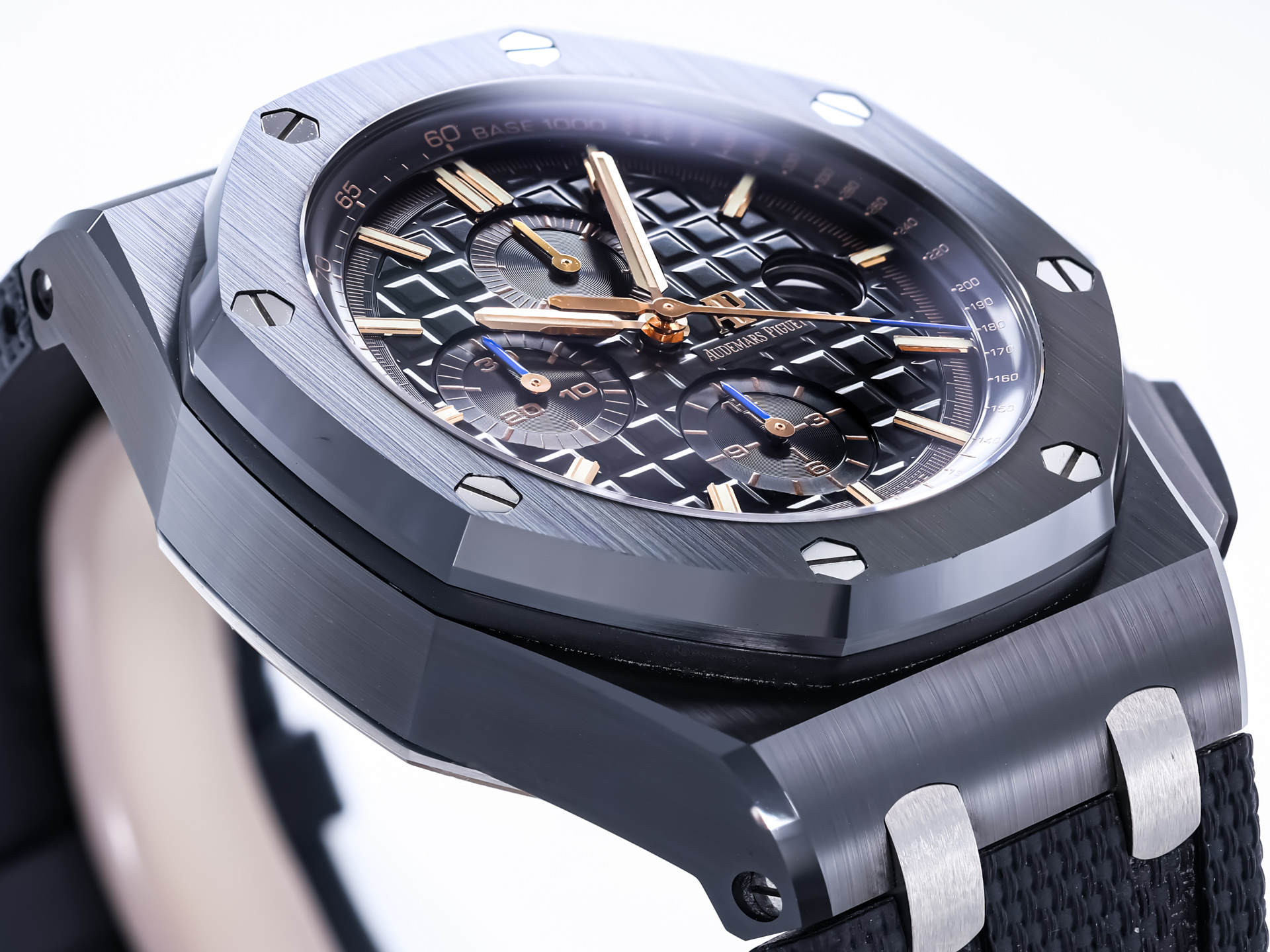 Inside, the watch is powered by the self-winding calibre 3126/3840, a movement known for its robust chronograph construction and steady performance. The combination of full ceramic casework, the distinctive tonal dial layout, and the classic Offshore silhouette places this reference firmly within the contemporary evolution of the Royal Oak family.
