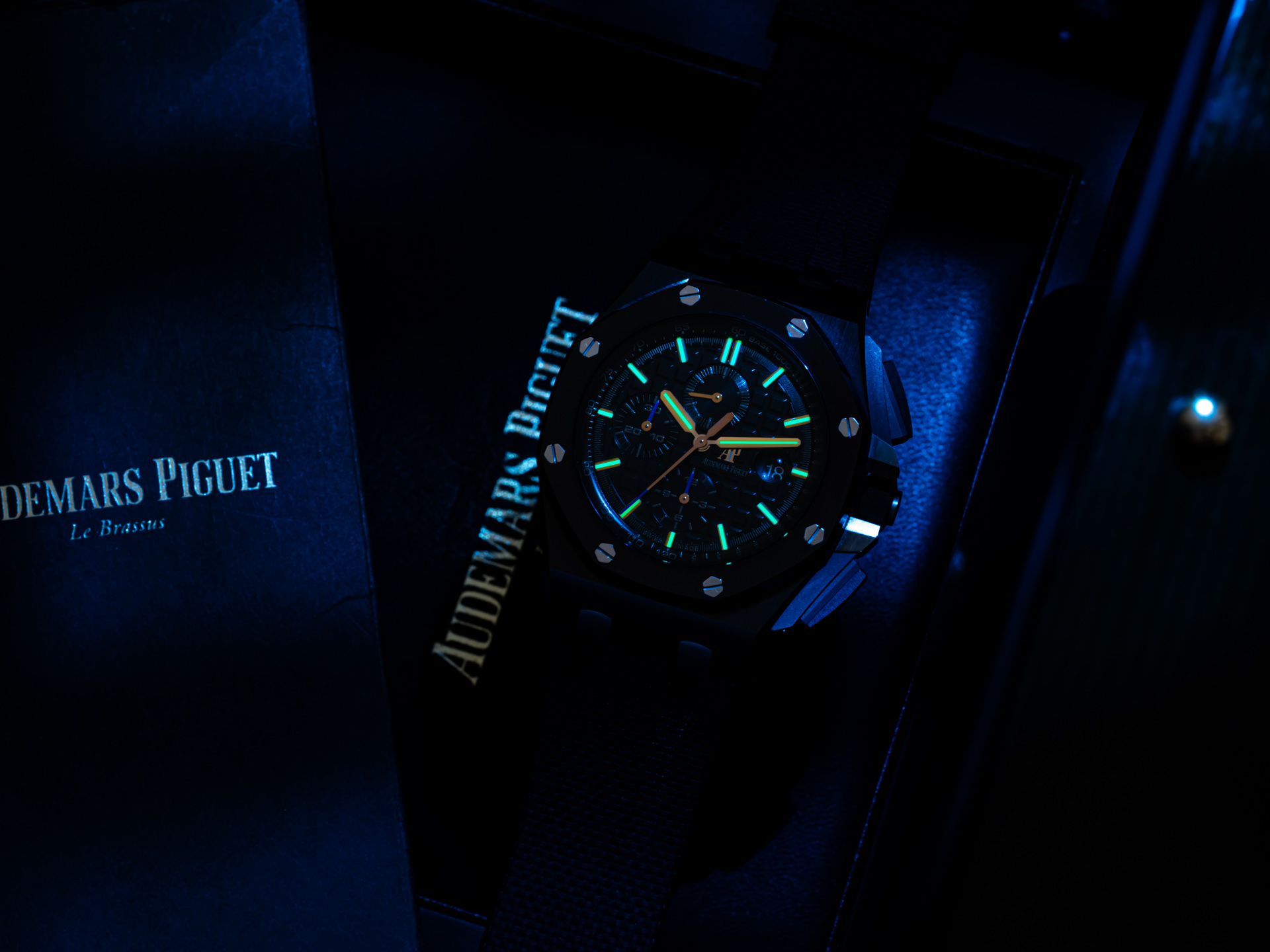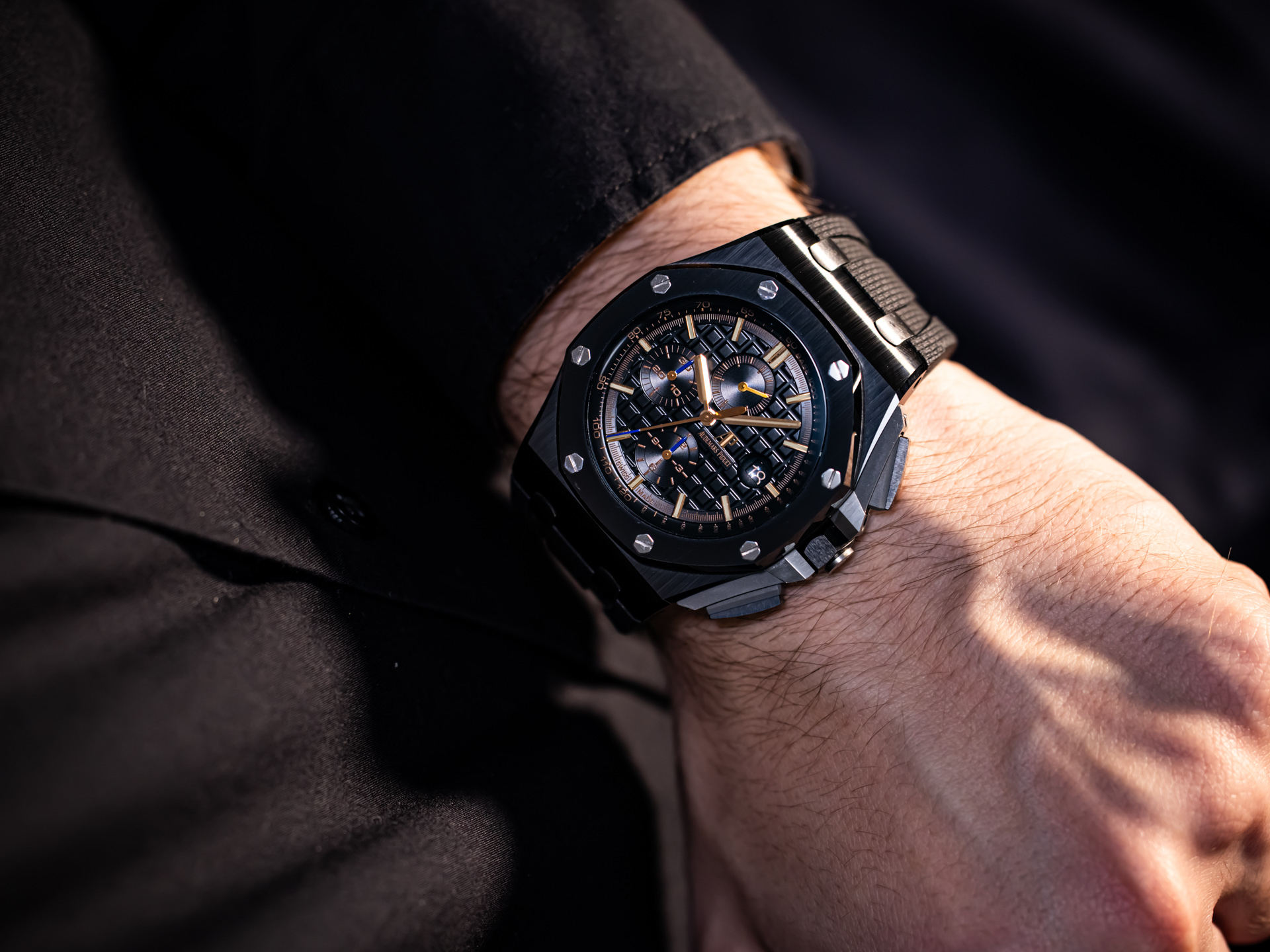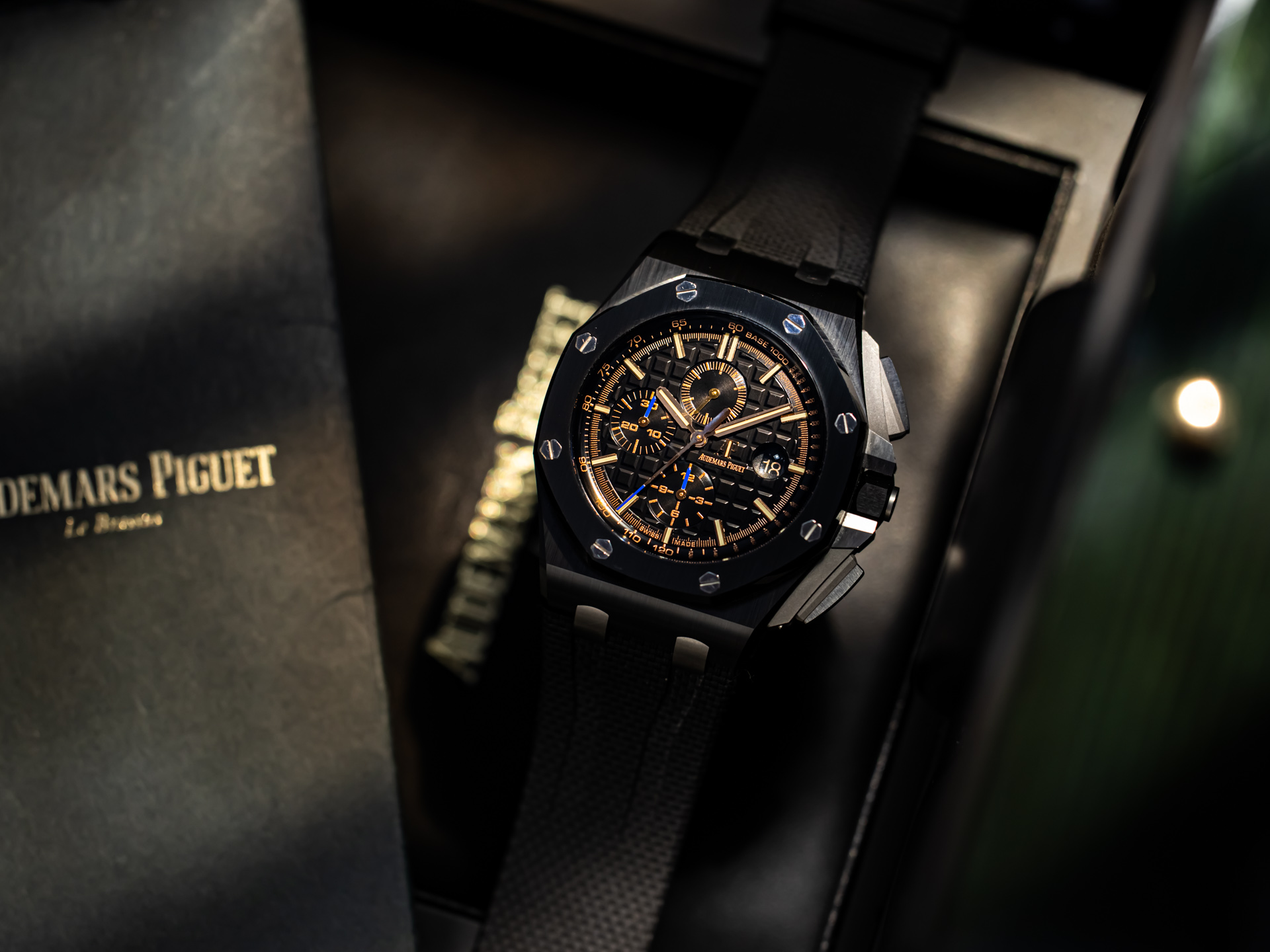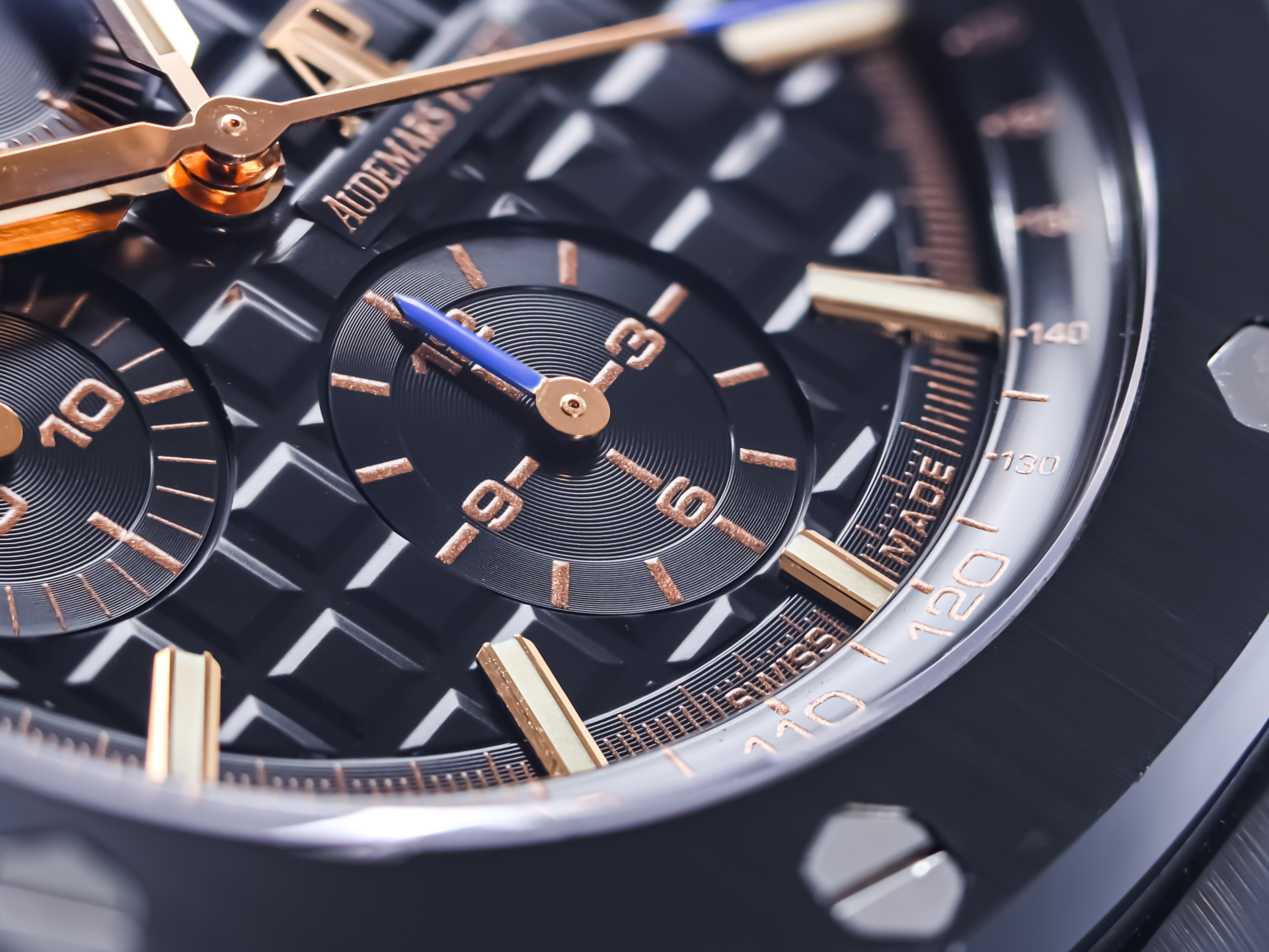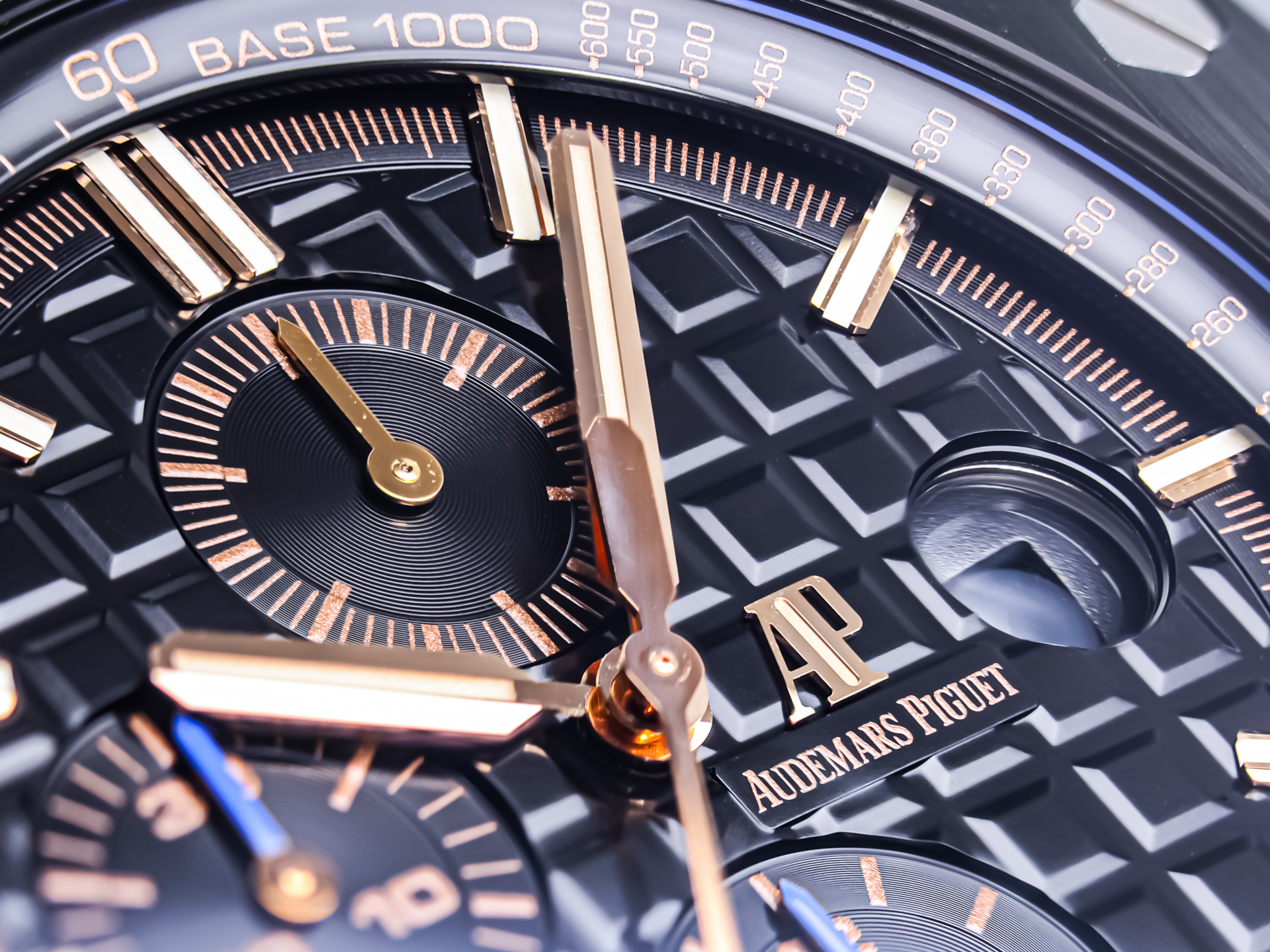 Inside, the watch is powered by the self-winding calibre 3126/3840, a movement known for its robust chronograph construction and steady performance. The combination of full ceramic casework, the distinctive tonal dial layout, and the classic Offshore silhouette places this reference firmly within the contemporary evolution of the Royal Oak family.