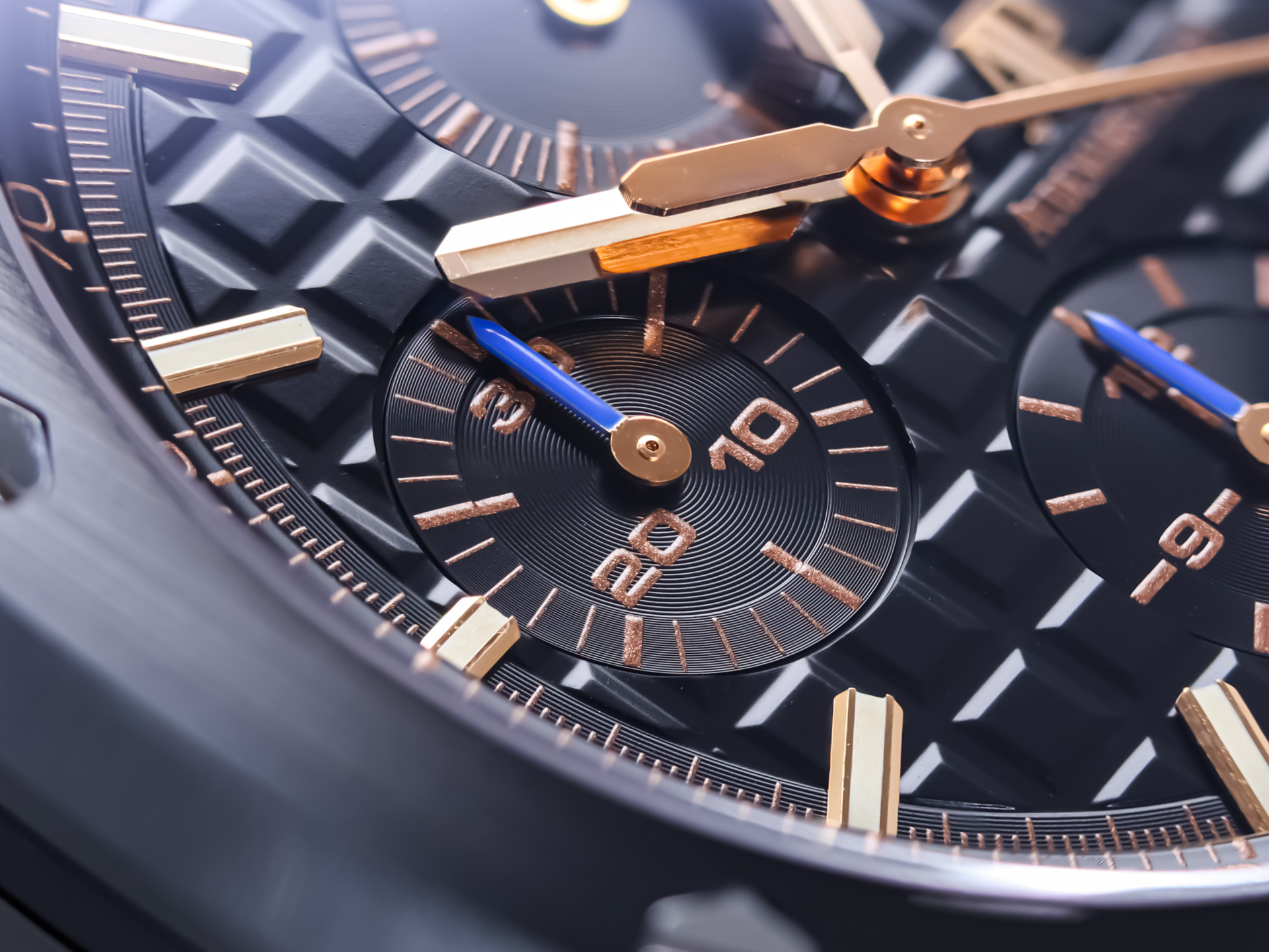 The Audemars Piguet Royal Oak Offshore 26405CE.OO.A002CA.02 is a modern ceramic execution of the Offshore design first introduced in 1993. Its 44mm black ceramic case features the characteristic mix of brushed surfaces and polished bevels, giving the watch a strong architectural presence. The black “Méga Tapisserie” dial is paired with bronze-toned chronograph registers and accents, creating a warm contrast within the otherwise monochromatic design.