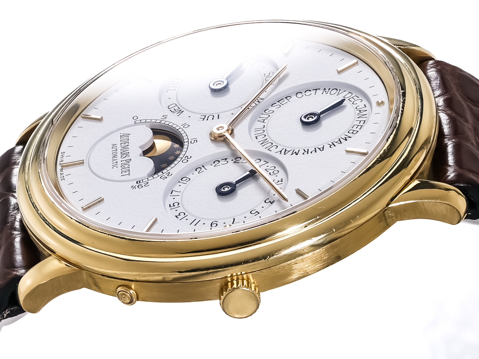The 36 mm yellow-gold case displays the understated sophistication that defines AP’s dress complications of the late 1980s—slim, balanced, and beautifully finished. This piece features an exchange dial installed during service, executed in the clean, modern AP style with beautifully proportioned calendar displays and a detailed moon-phase at six o’clock.
