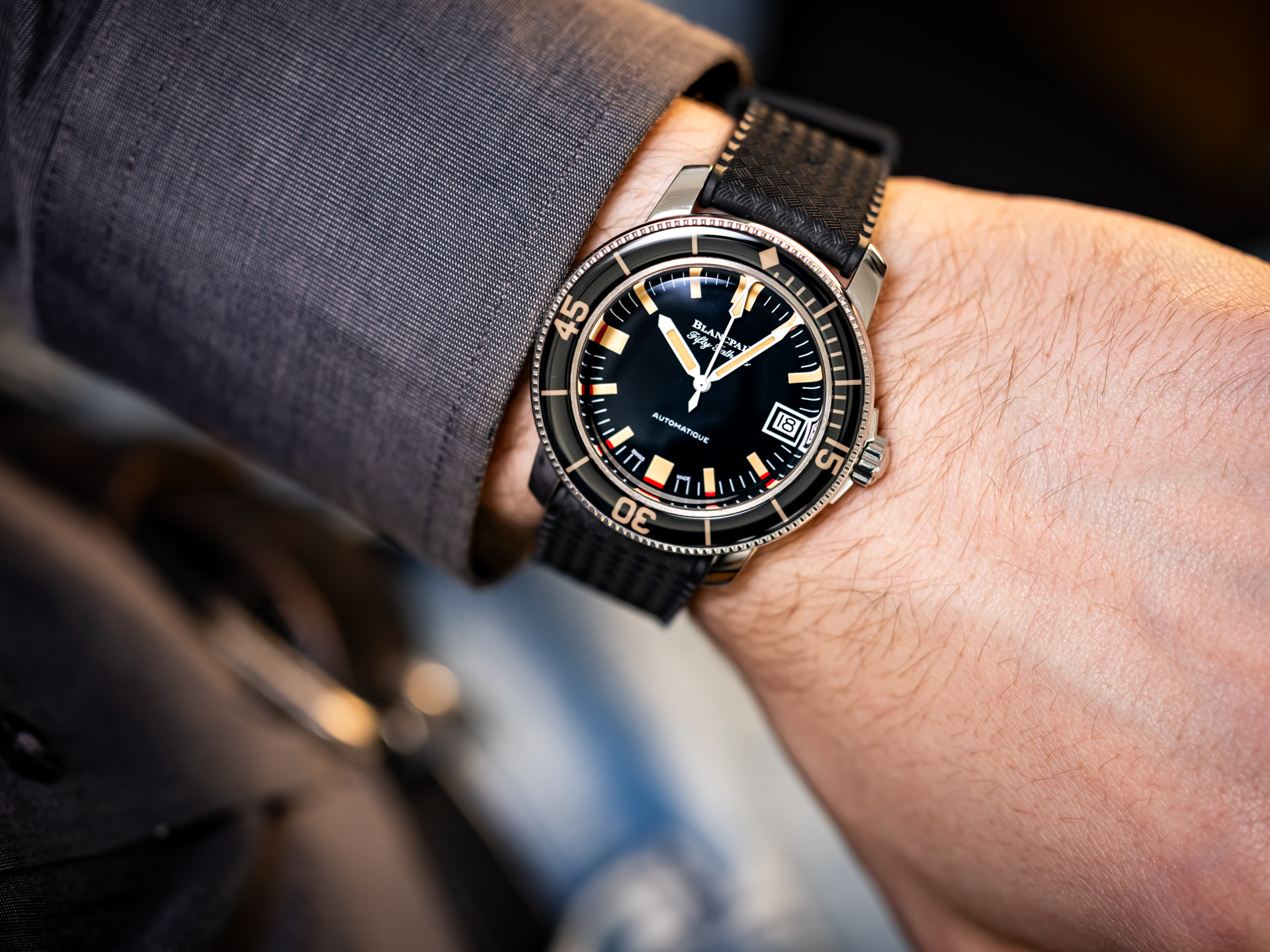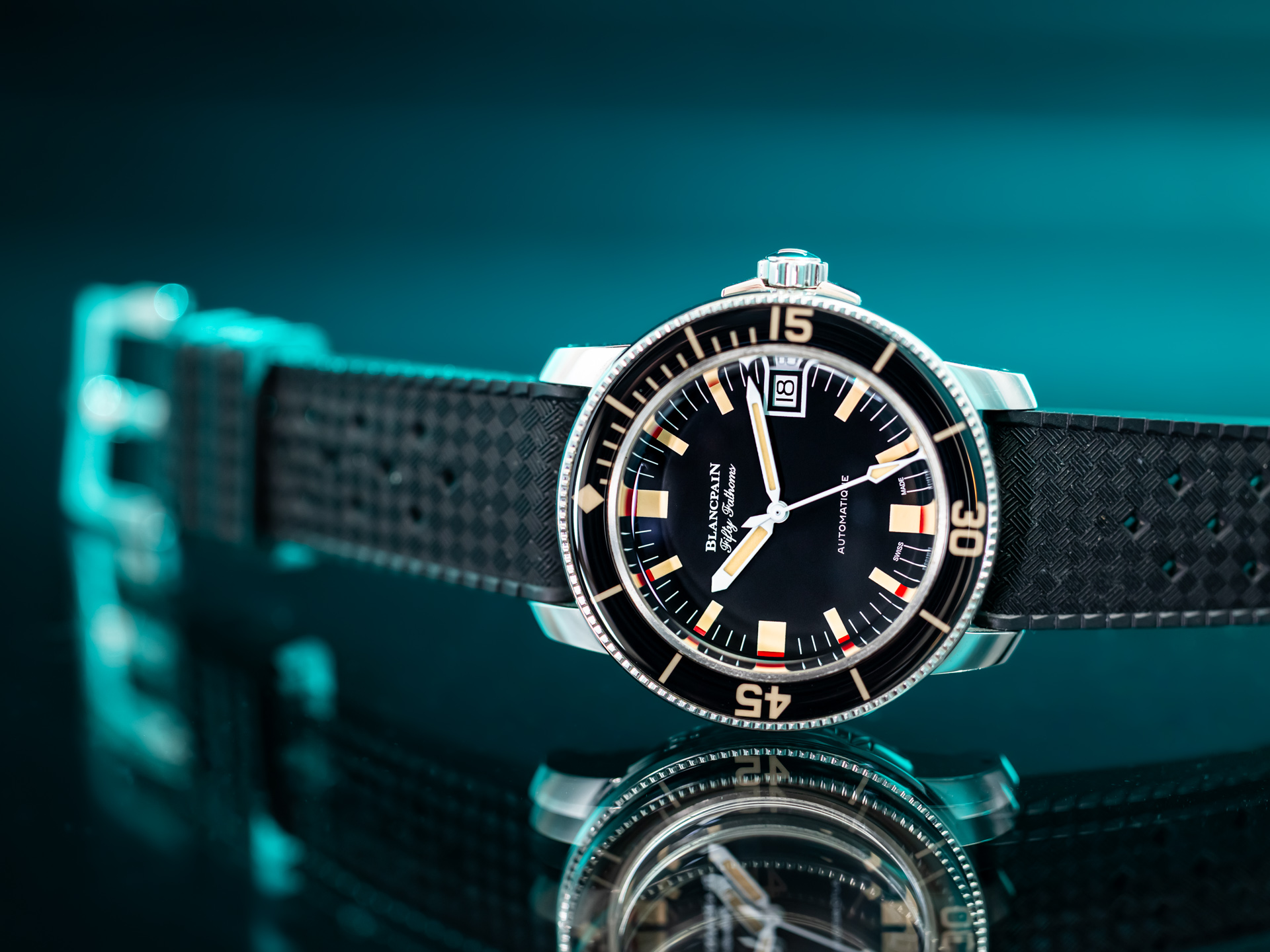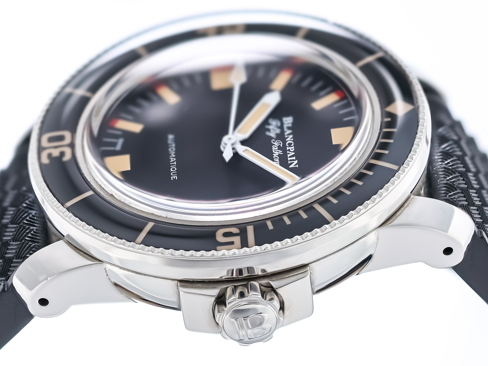The 40.3mm stainless steel case revives the original proportions of the historic Fifty Fathoms MIL-SPEC watches supplied to the German Navy in the 1970s. Faithful to the vintage inspiration, the Barakuda features a unidirectional sapphire bezel with luminous markings and a sharply domed sapphire crystal, giving the watch an authentic tool-watch presence while maintaining refined modern execution.