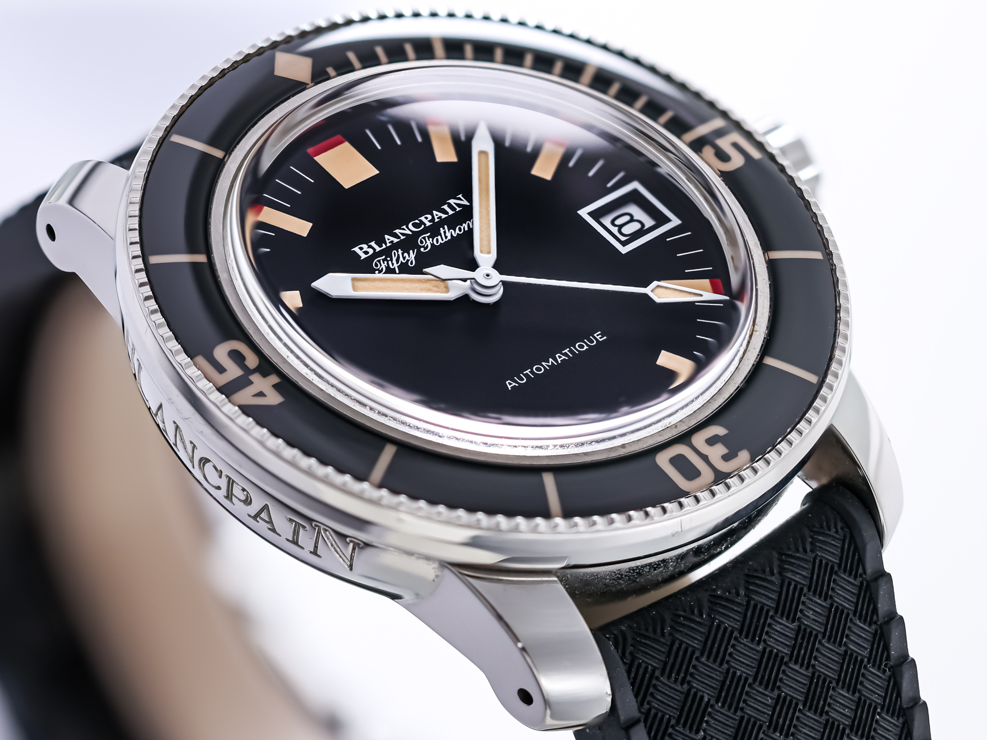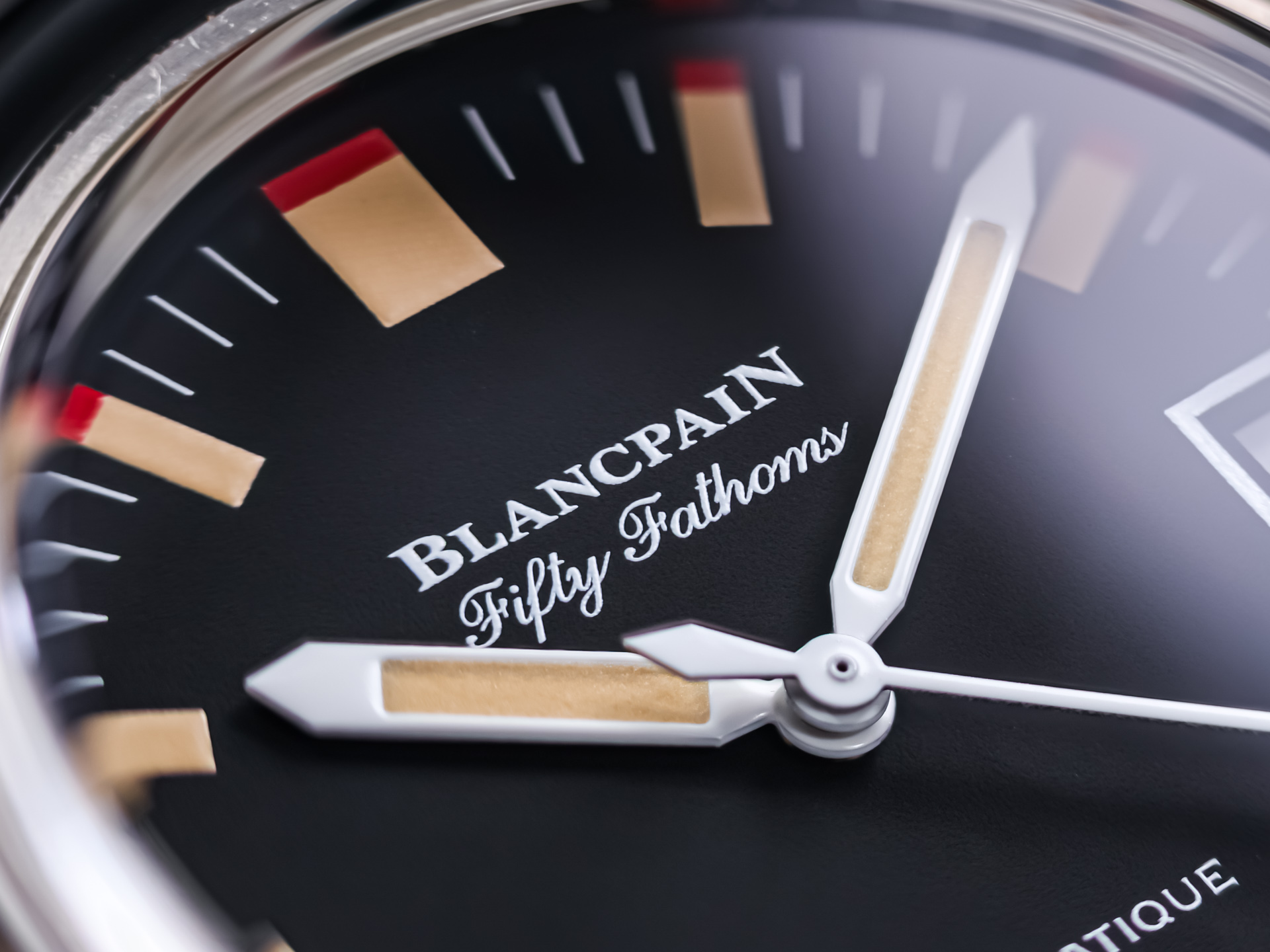 The matte black dial is distinguished by its bold vintage-style luminous hour markers and the iconic red-and-white “Barakuda” logo at 6 o’clock — a direct homage to the original distributor’s signature. Sword-style hands and a discreet date window ensure excellent legibility, staying true to the utilitarian roots of the Fifty Fathoms lineage.