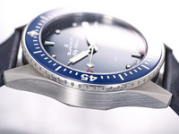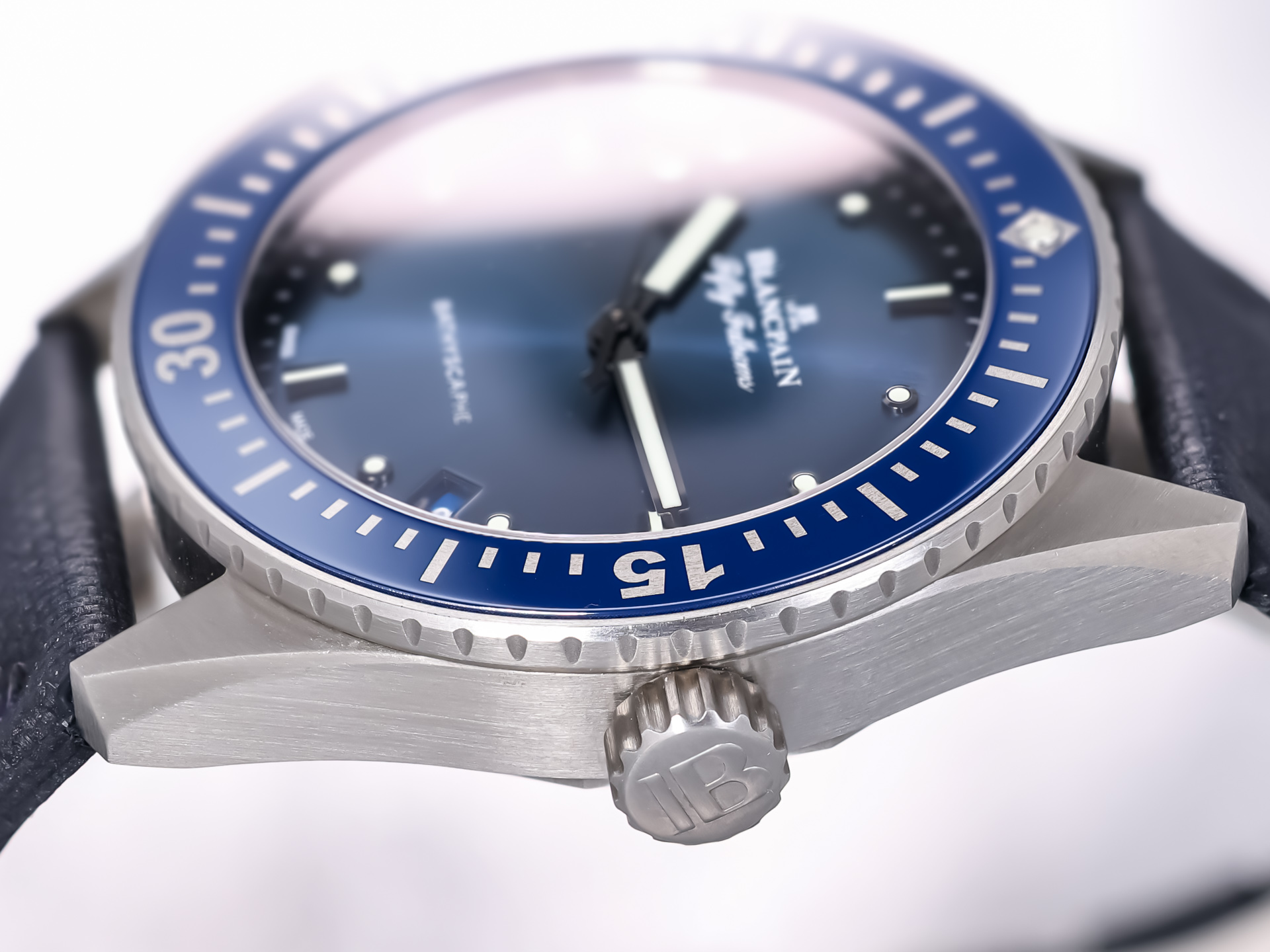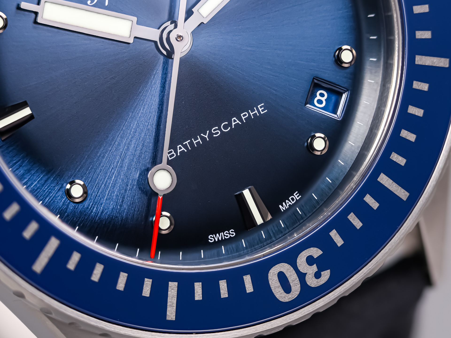 Made in stainless steel, the 38 mm case strikes an outstanding balance between everyday versatility and professional dive capability. Its slim profile, brushed finishing, and clean lines reflect the Bathyscaphe’s heritage as the more minimalist and modern interpretation of the Fifty Fathoms family.