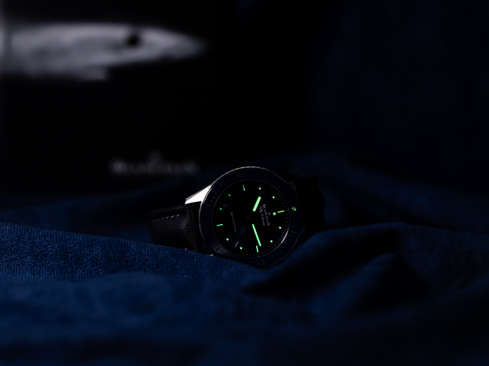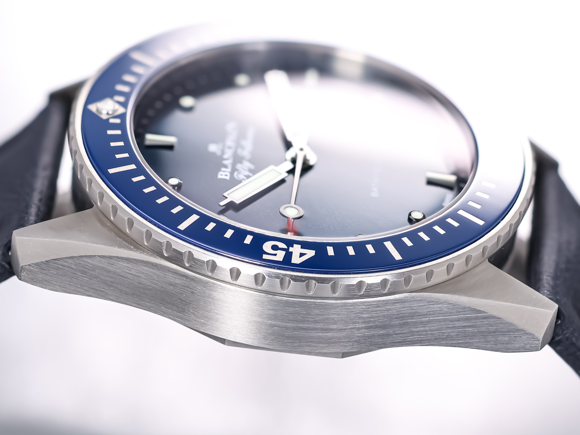 The deep anthracite sunburst dial provides a sophisticated and contemporary aesthetic, complemented by Blancpain’s signature rectangular indices and luminous-filled hands for optimal readability in all conditions. The unidirectional bezel—fitted with a satin-finished ceramic insert—delivers excellent scratch resistance and a sleek, understated look.