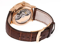 The watch is fitted with an elegant leather strap and an 18k rose gold folding clasp, ensuring both comfort and security while maintaining its classic dress watch appeal.