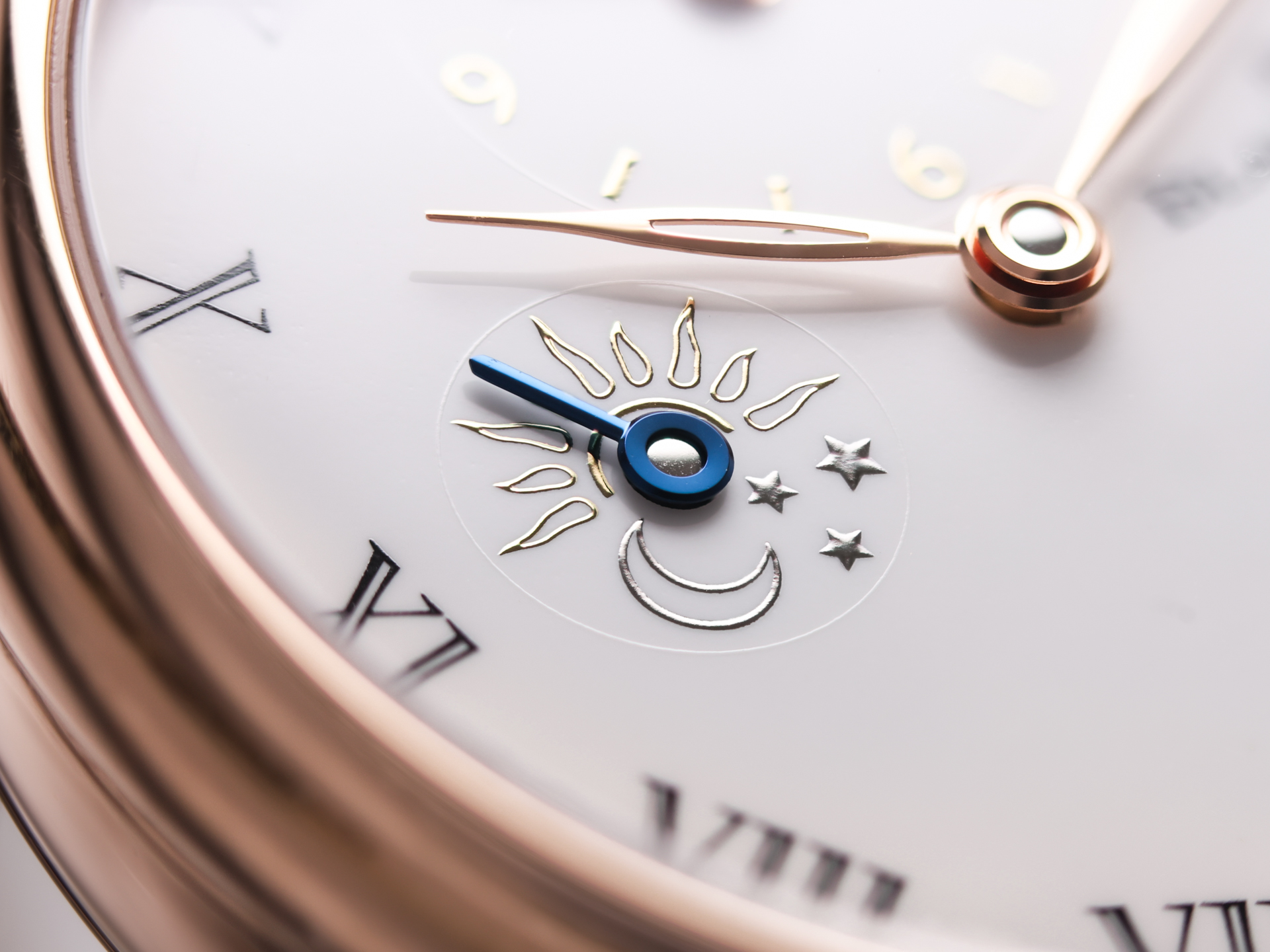 The dial is clean and highly legible, showcasing Blancpain’s understated design language. The dual time zone (demi-fuseaux horaires) display allows independent adjustment of the hour hand in one-hour increments, making it ideal for travelers. A power reserve indicator subtly integrated into the dial reflects the impressive autonomy of the movement.
